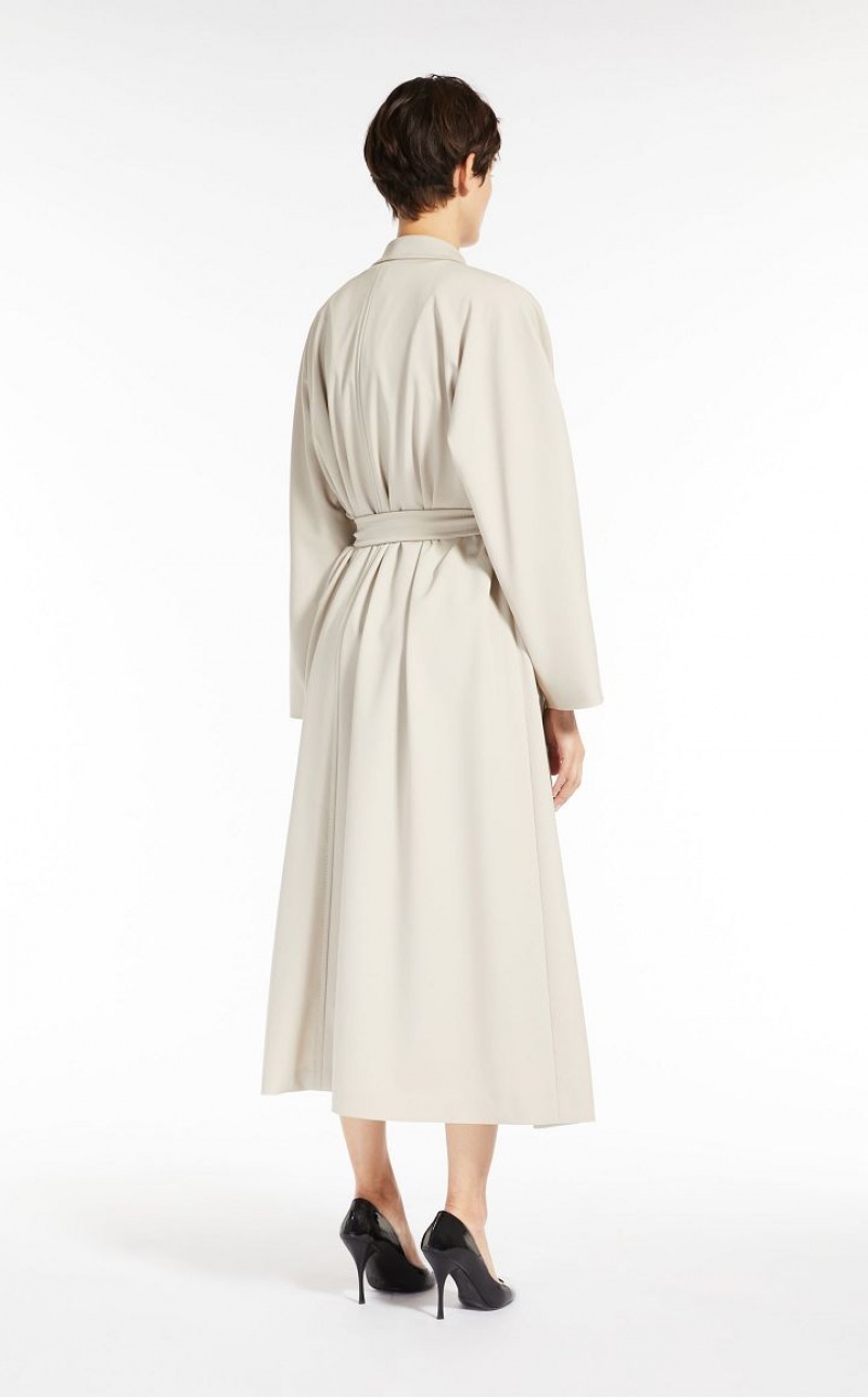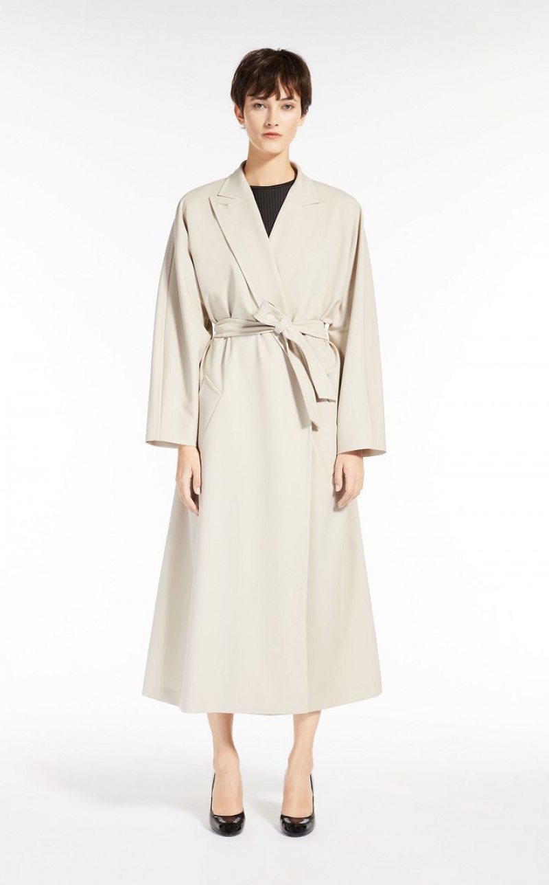 Oversized water-resistant duster coat made of lightweight pure stretch gabardine wool, with peak lapel collar and long kimono sleeves. Semi-lined style with a flared silhouette, finished with sartorial pick stitch, large welt pockets and a matching belt to accentuate the waist. Length: 125 cm.