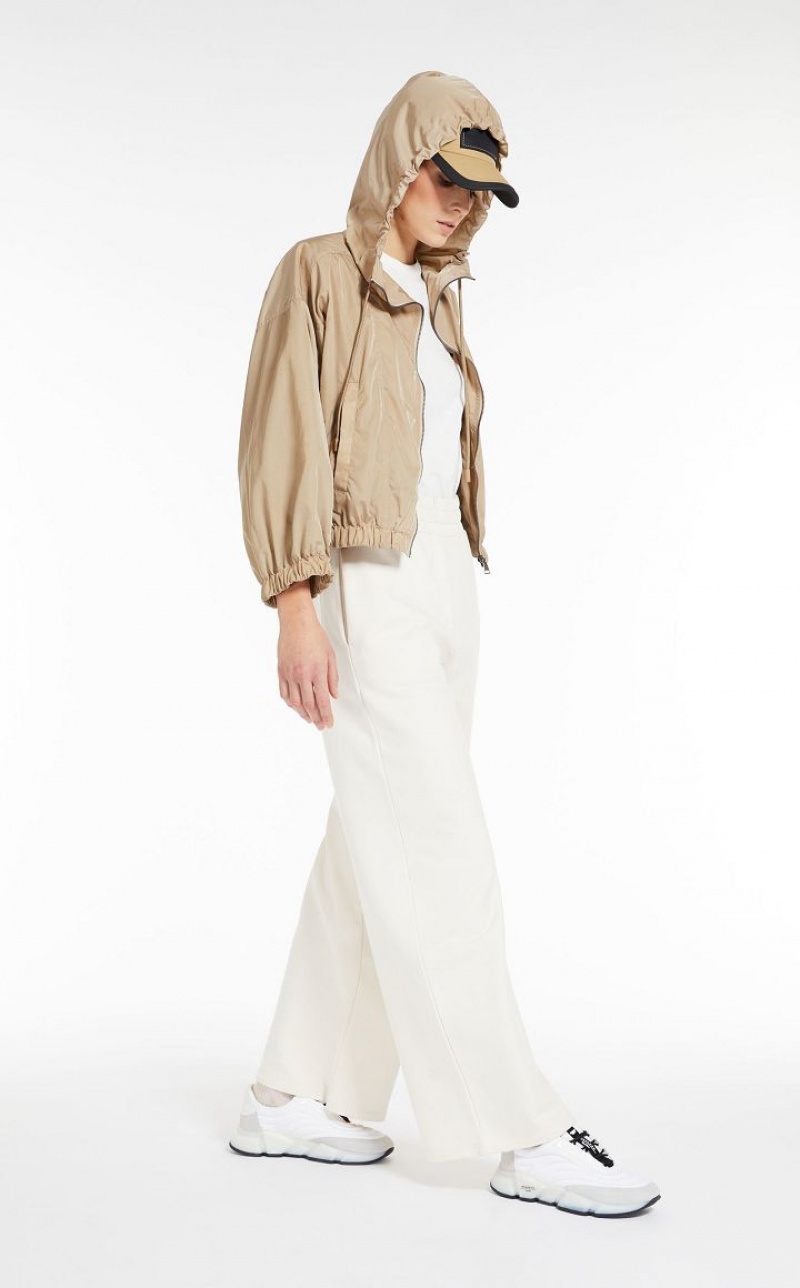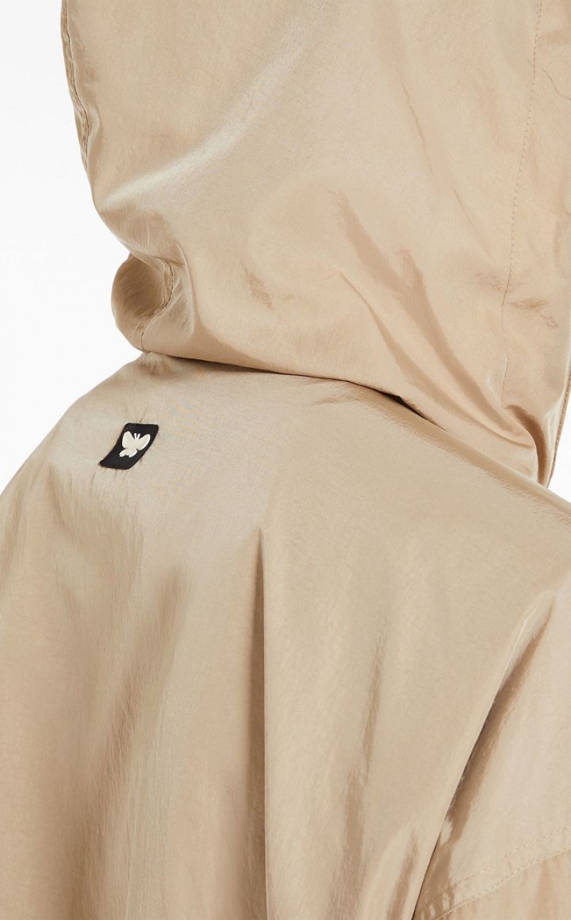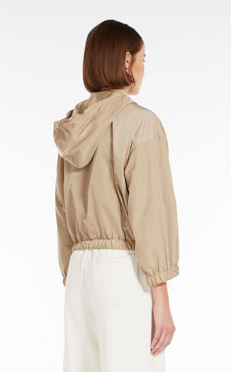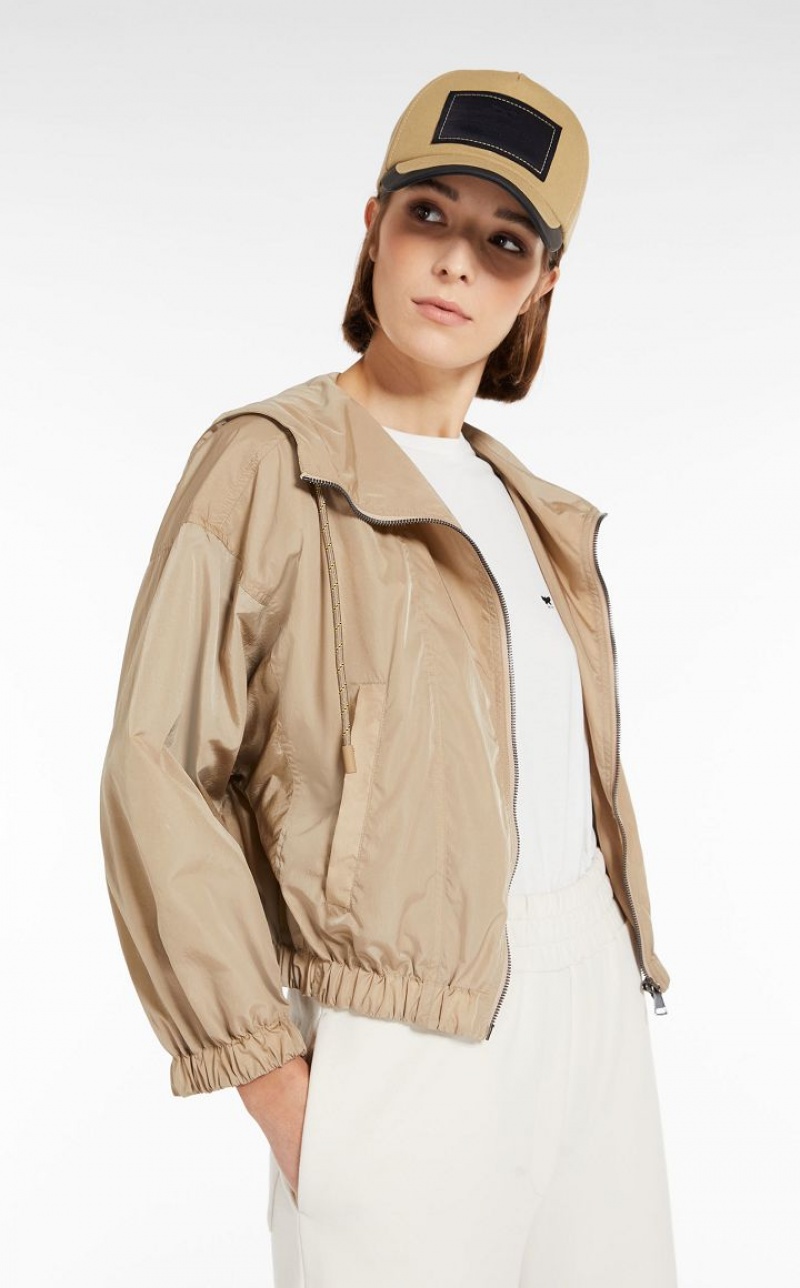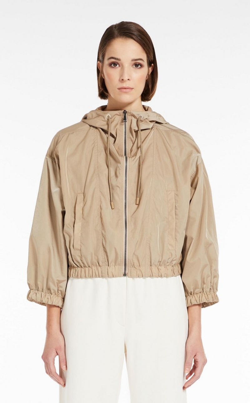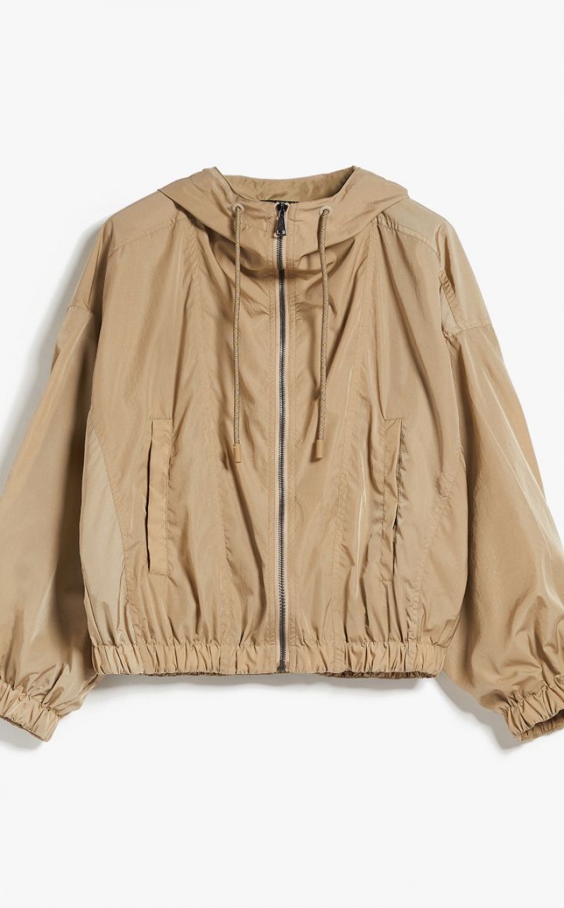 Short wind-jacket style in lightweight, showerproof nylon taffeta. This style features a drawstring hood, 3/4 sleeves with elasticated cuffs and a drawstring hem to adjust the volume at the bottom. Lined style, with slanted pockets on the front and a front fastening with zip. Length: 54 cm.