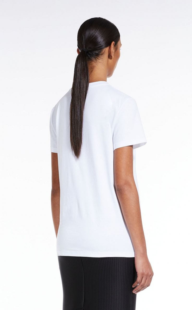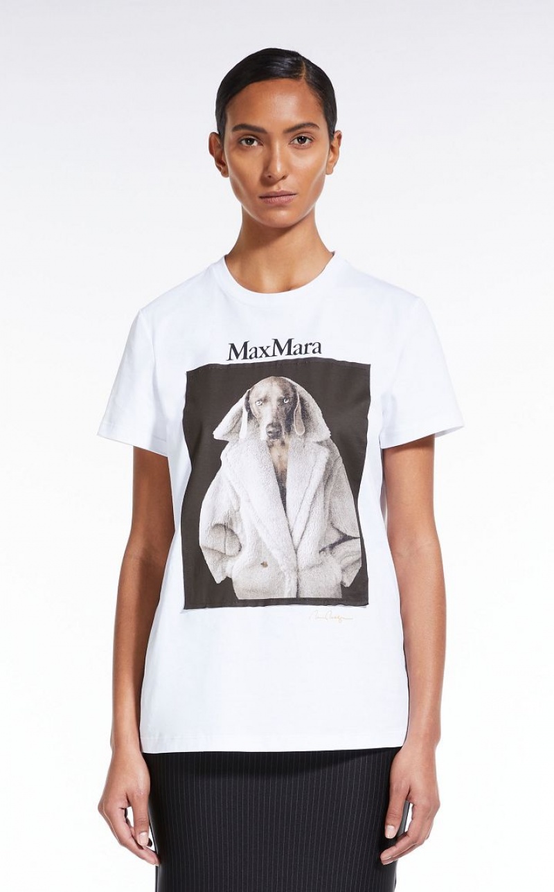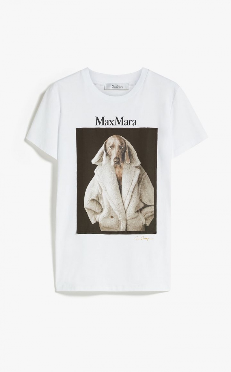 Pure soft cotton jersey regular-fit T-shirt with a round collar and short sleeves. To mark "Teddy Ten", the 10th anniversary of the iconic Max Mara coat, artist William Wegman has contributed a new picture for the "Dogs in Coats" series: the printed image portrays the artist’s Weimaraner wearing the Teddy coat in the cacha colour. Length: 66 cm.