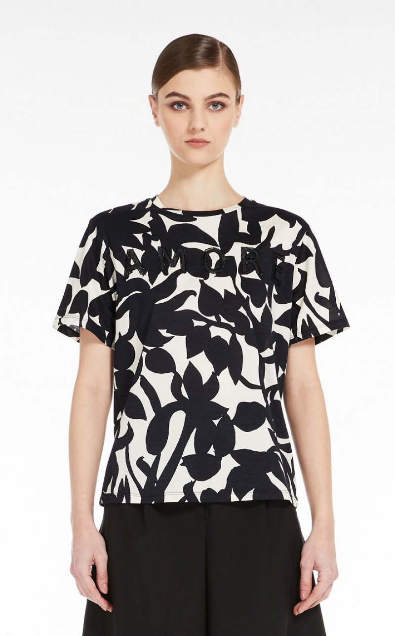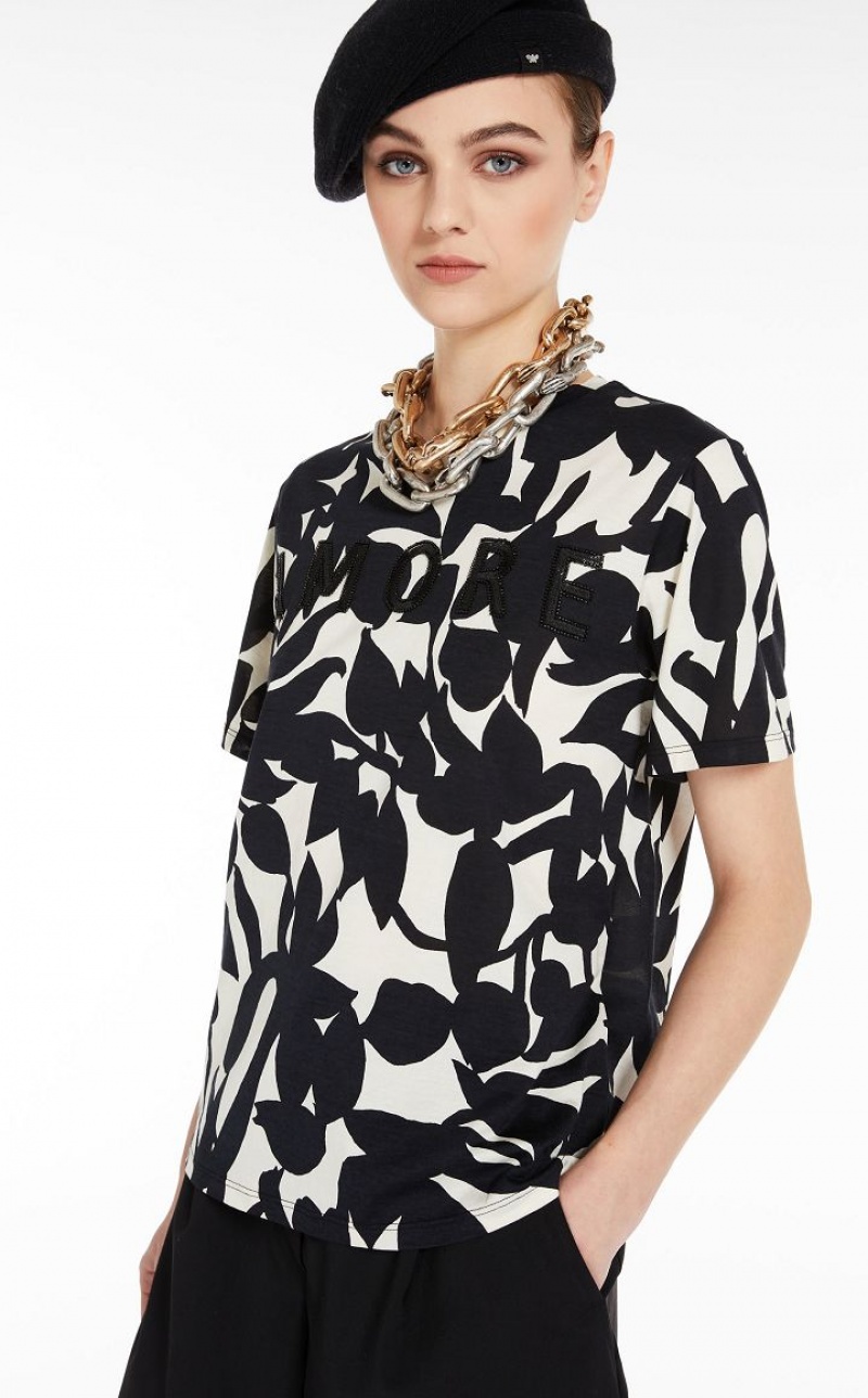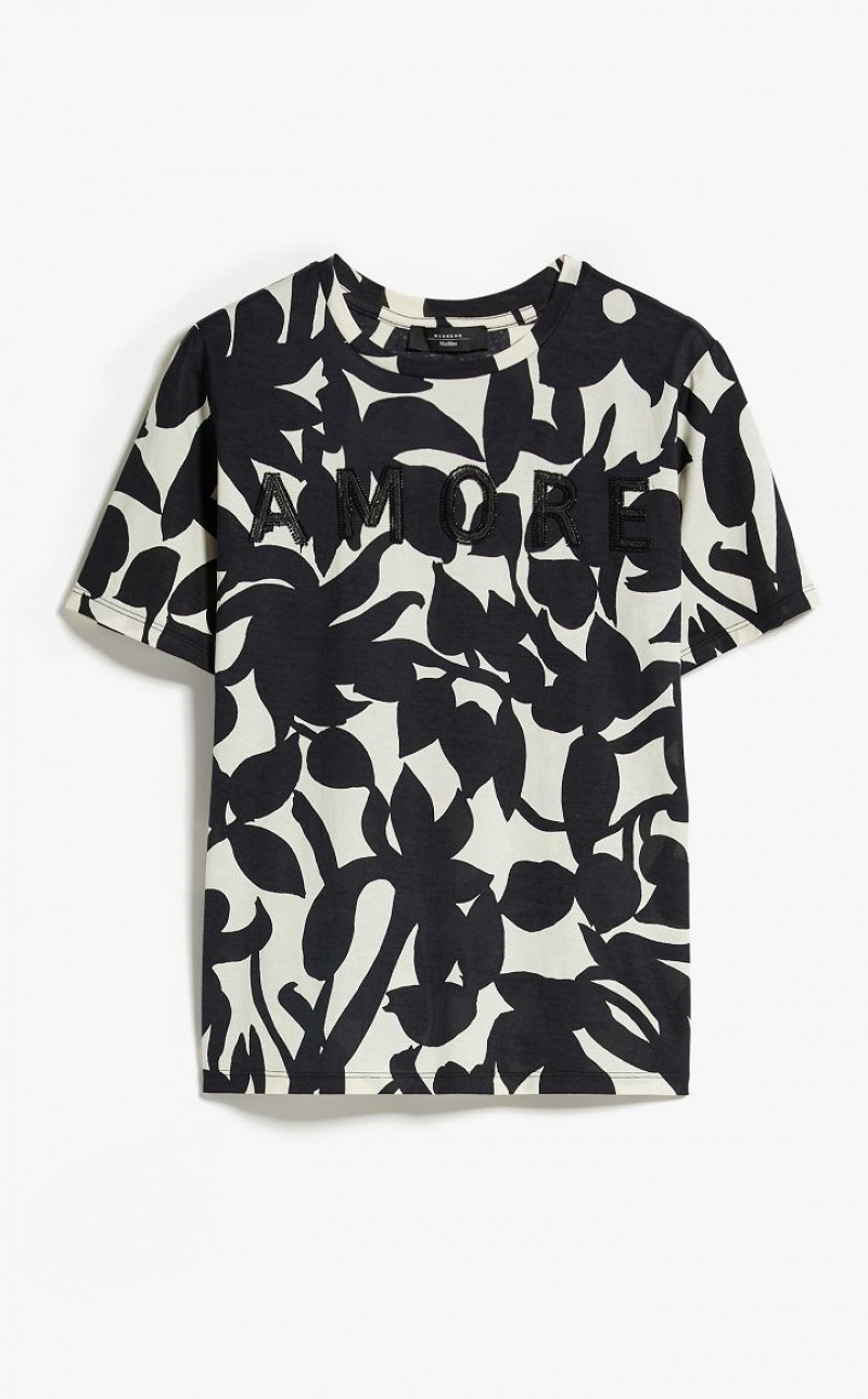 Short-sleeved T-shirt in soft cotton jersey with all-over print. Straight style with small slits at the hem, embellished with AMORE lettering embroidered on the front.