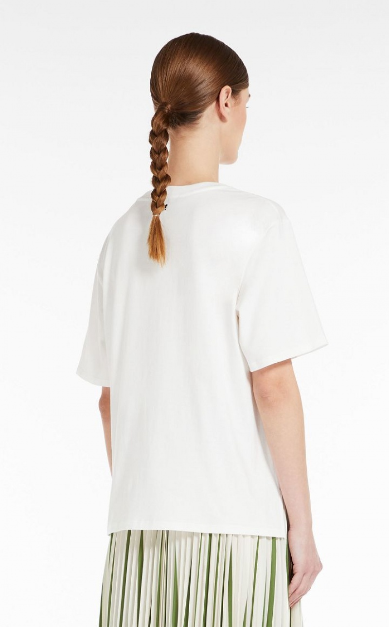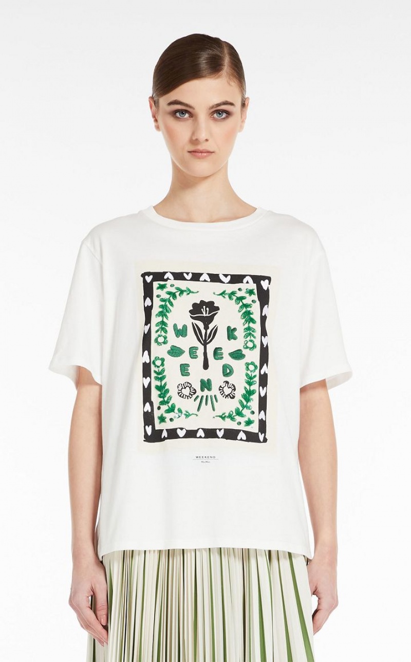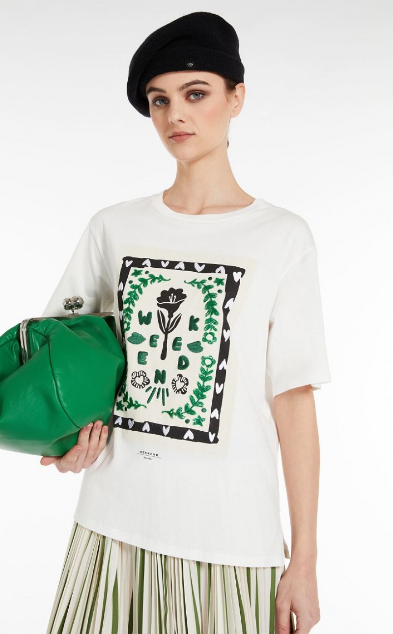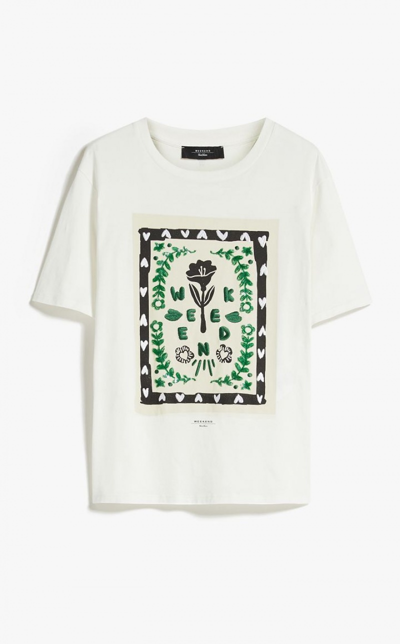 Short-sleeved T-shirt in soft pure cotton jersey. Straight style featuring a printed motif and embroidered details on the front. With side slits at the hem and small butterfly logo printed on the back of the neck.