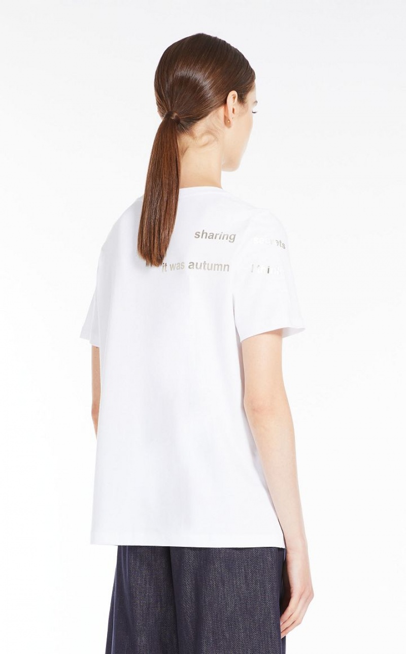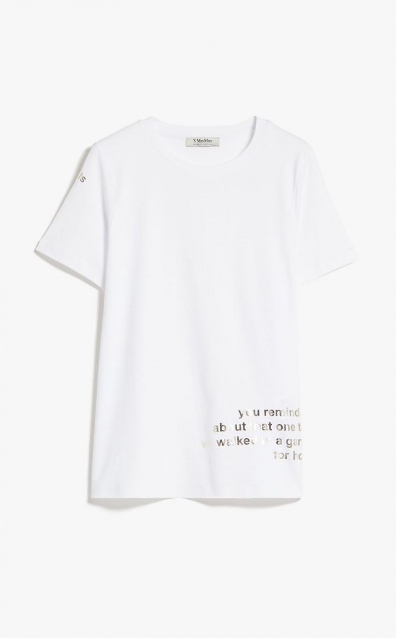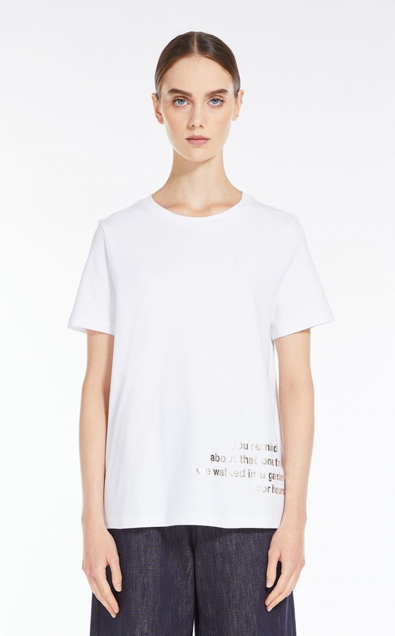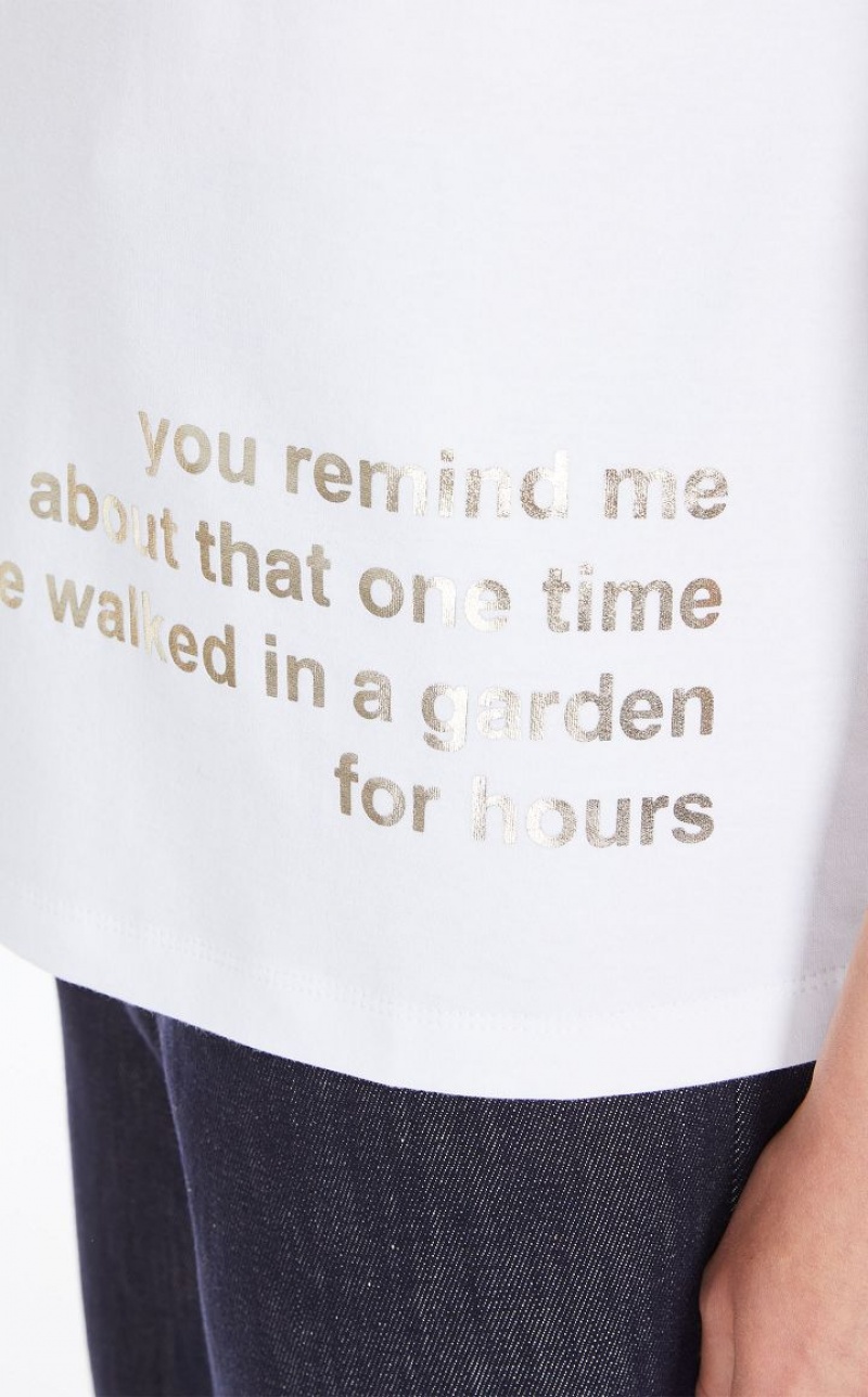 Short-sleeved crew-neck T-shirt in soft pure cotton jersey fabric. Each model is customised with a laminated print composed of poetic-inspired lettering. Length: 62 cm.