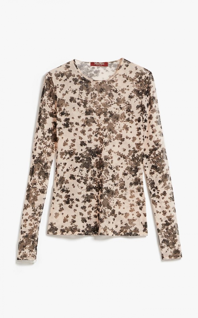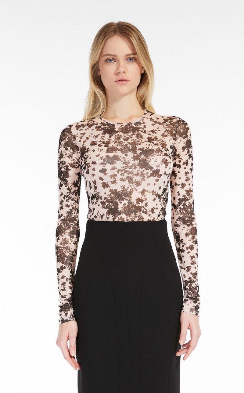 Long-sleeved crew-neck T-shirt in printed stretch tulle fabric featuring a silhouette-defining slim fit. Length: 62 cm.