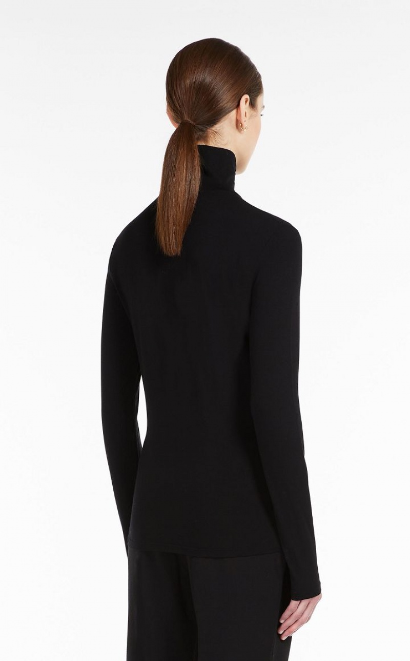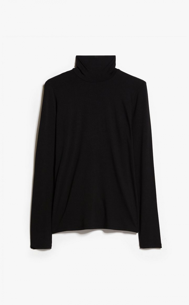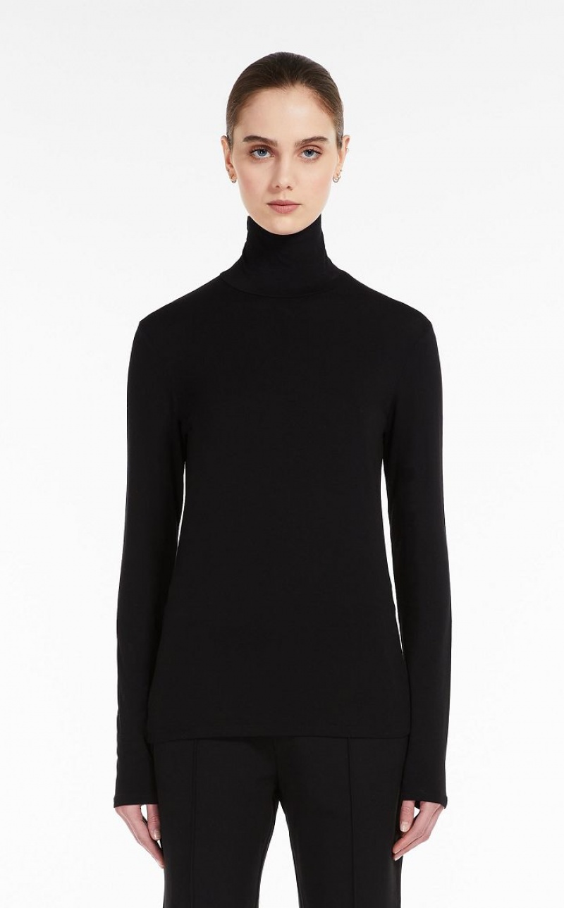 Slim fit long sleeved high neck T shirt in stretch viscose jersey fabric. The back of the neck is customised with a print.