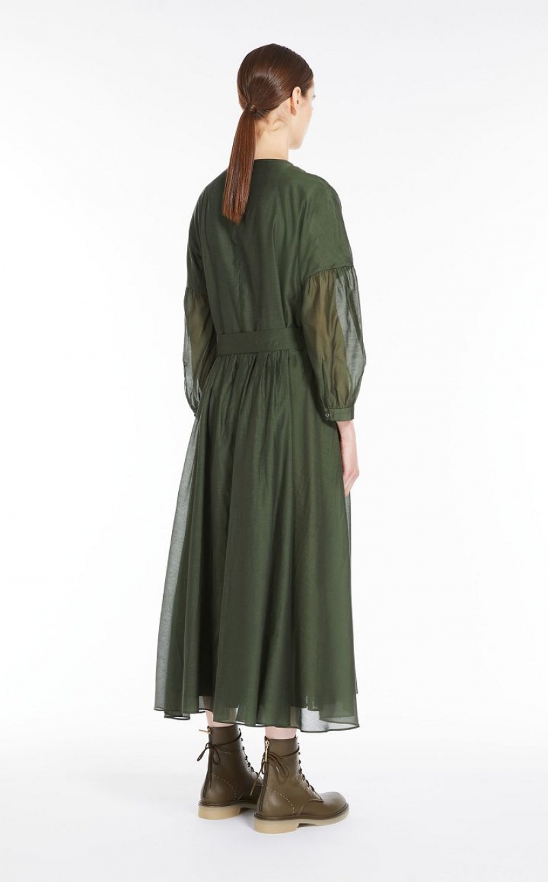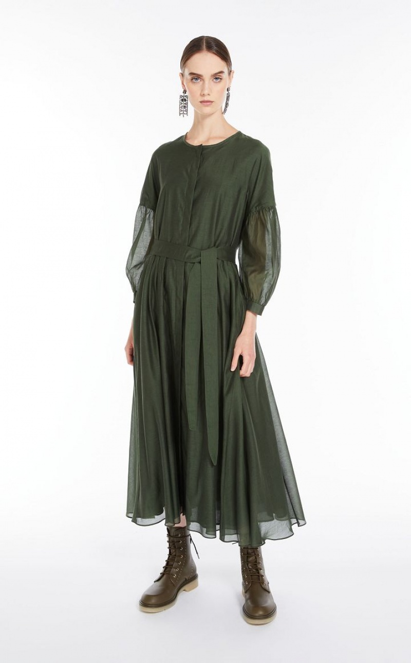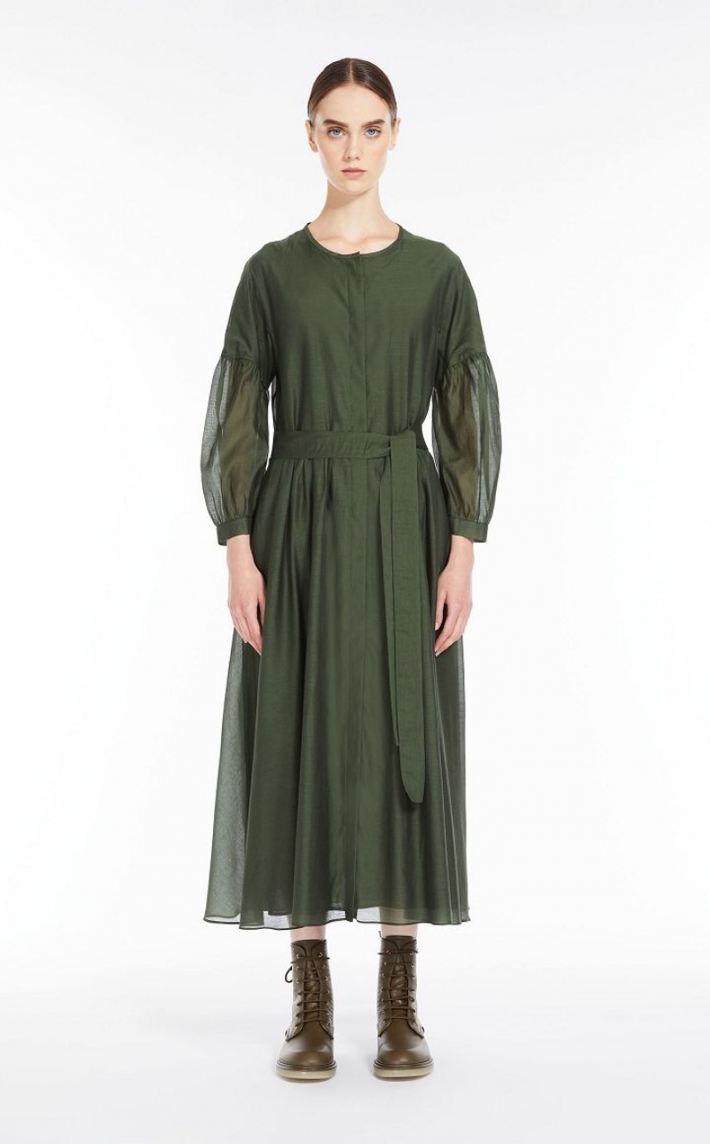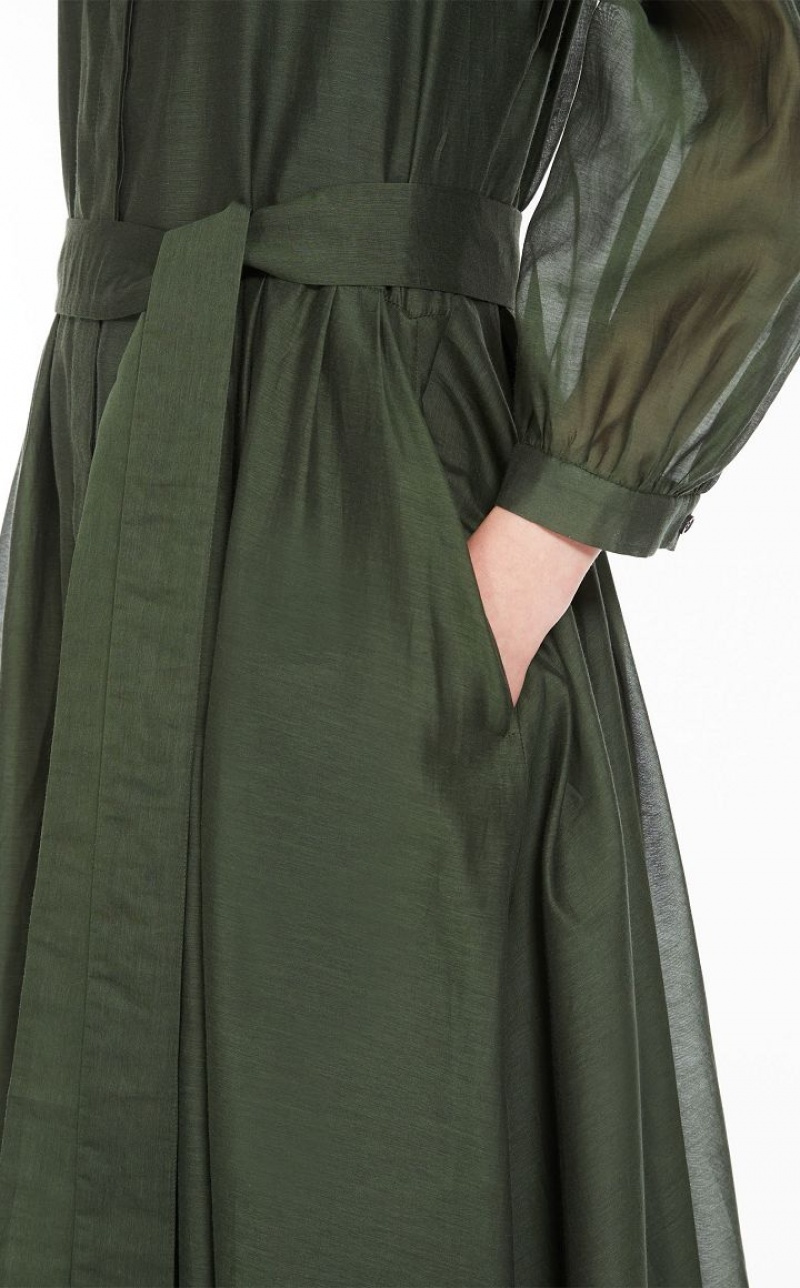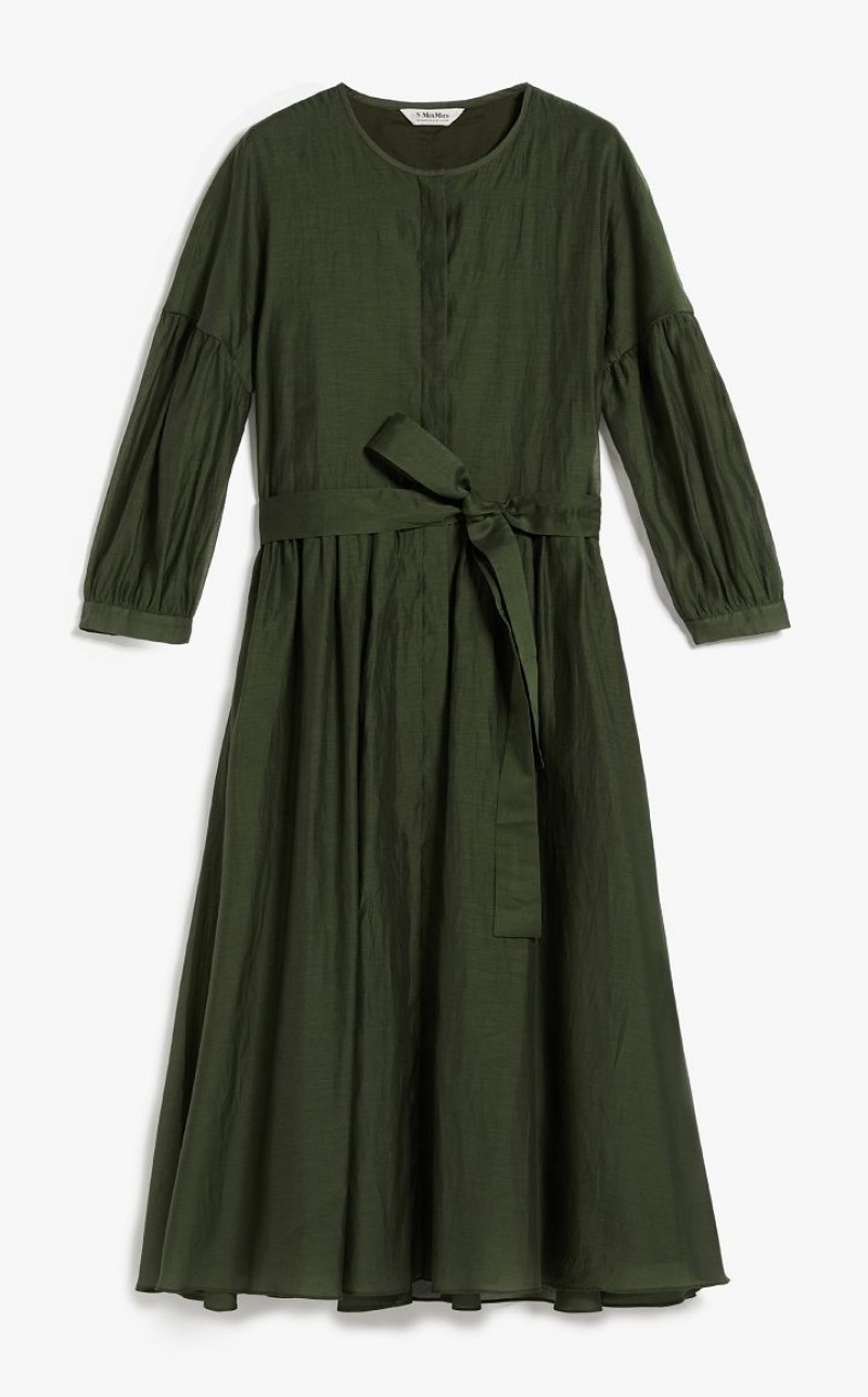 Long crew-neck dress in brushed cotton and silk voile fabric featuring a front fastening and loose-fitting long sleeves, complete with gathered detail. Waistline-accentuating matching belt. Length: 127 cm.