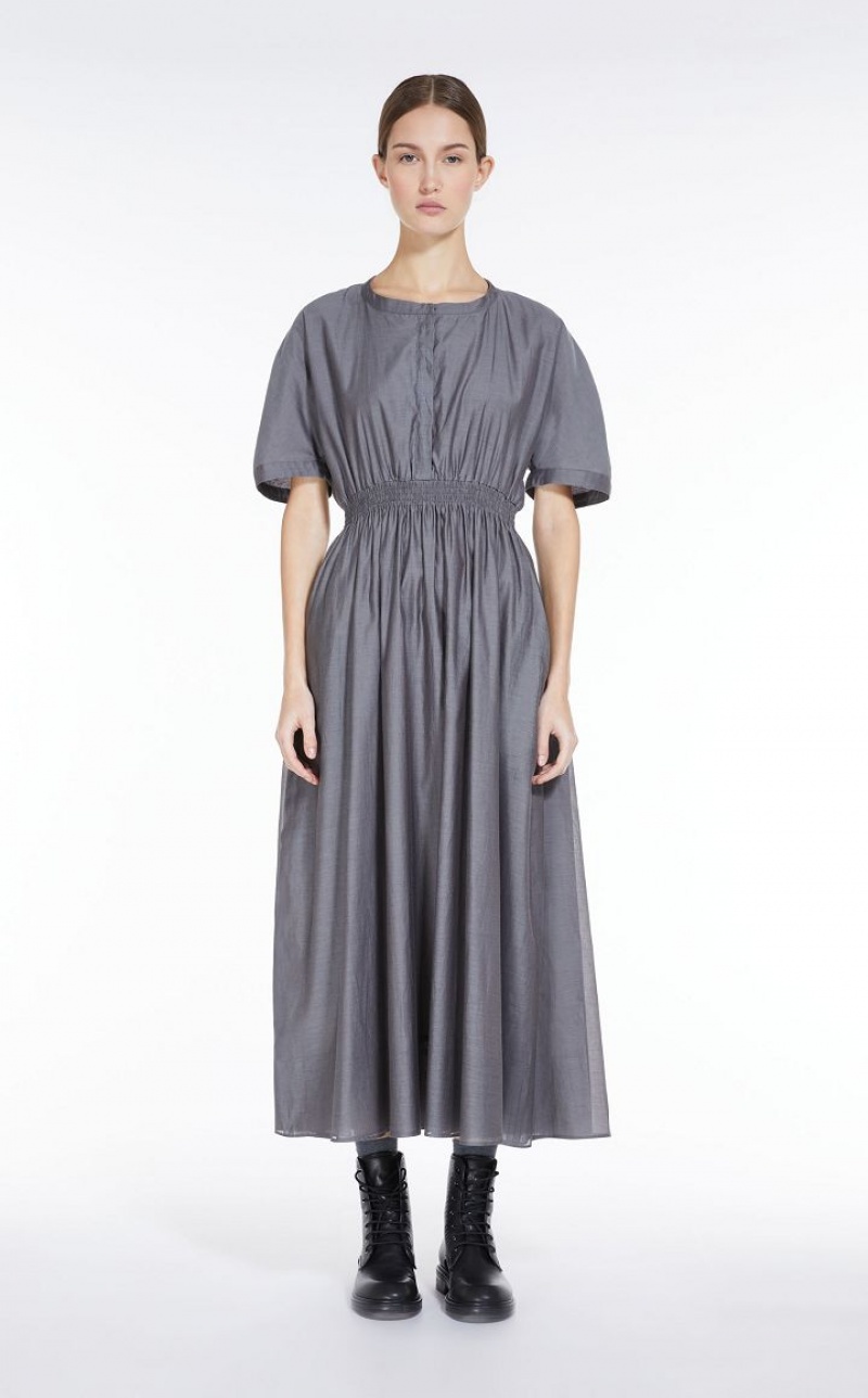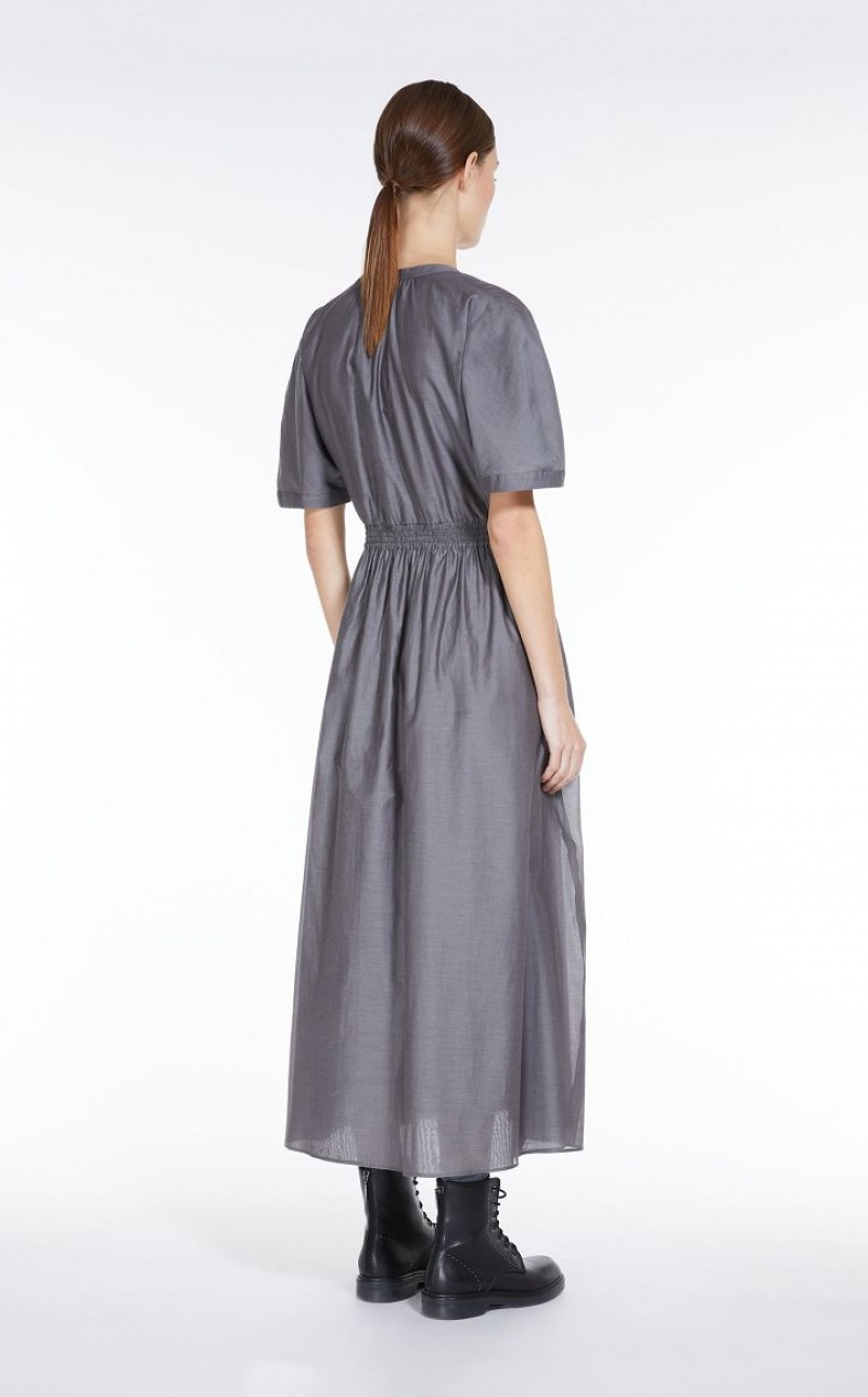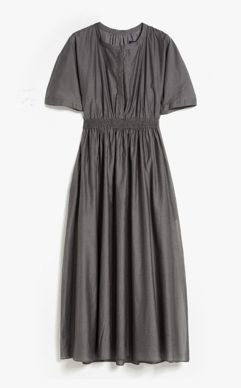 Crew-neck dress in organza-look fine cotton and silk voile fabric featuring kimono sleeves, an elasticated waist and a flared skirt. Front zip. Length: 132 cm.