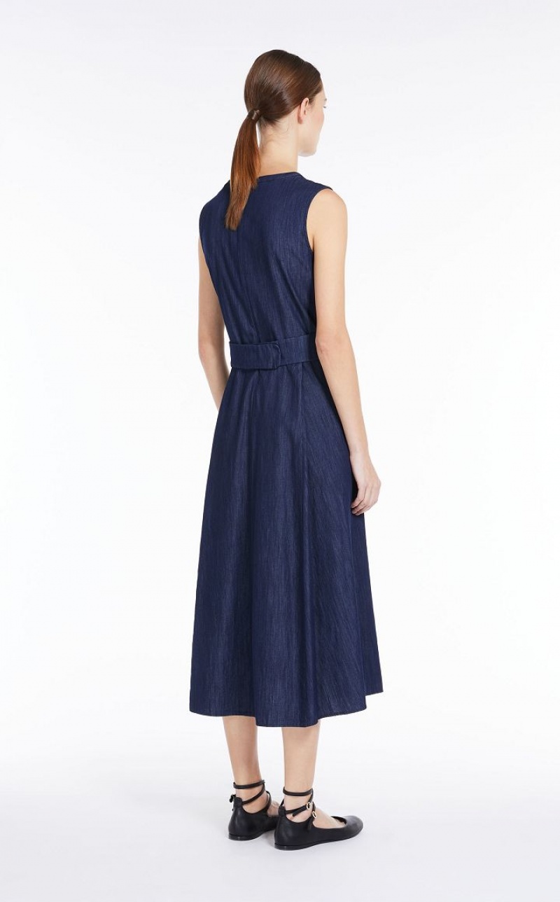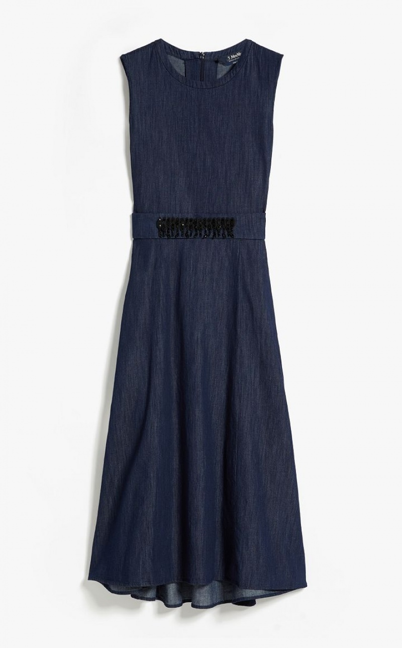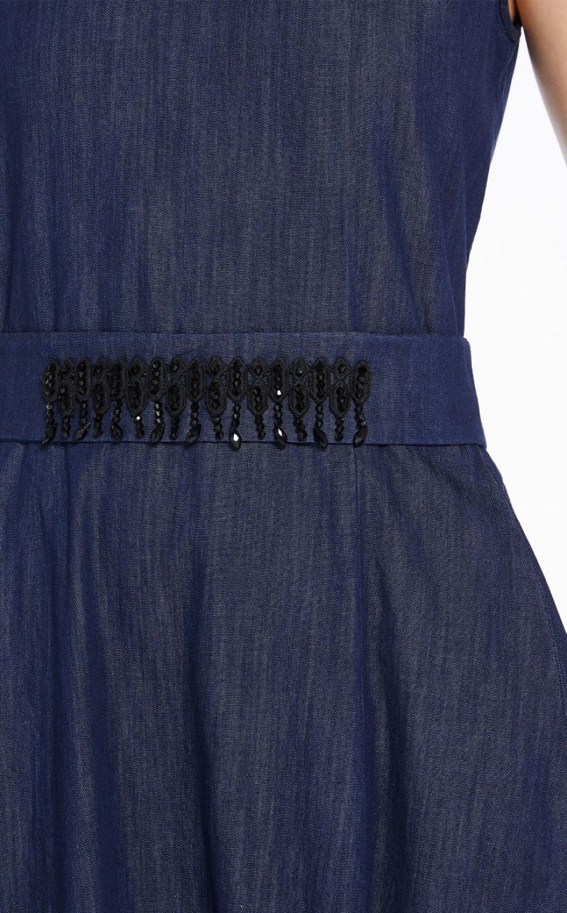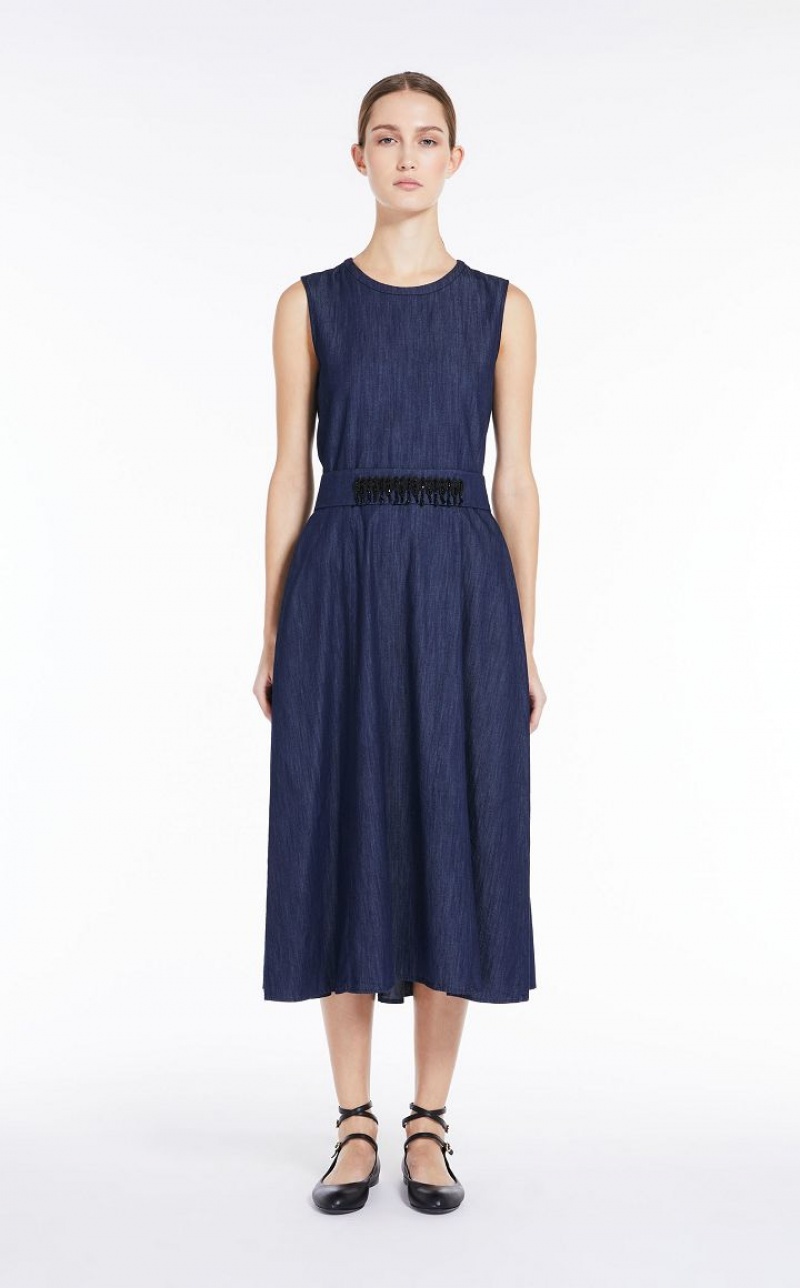 Flared sleeveless crew-neck dress in lightweight pure cotton denim fabric featuring waist-secured pleated detail on the skirt, in addition to side pockets. The removable embroidery-embellished matching belt is perfect for accentuating the waistline. Length: 124 cm.