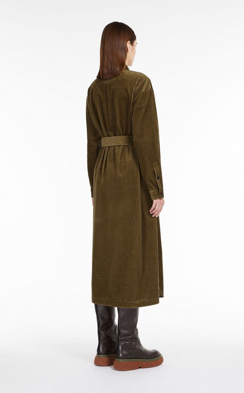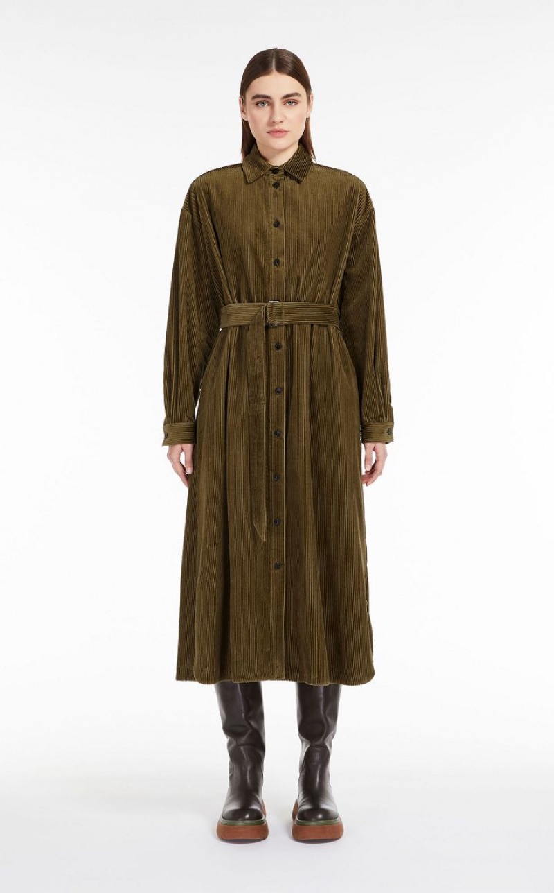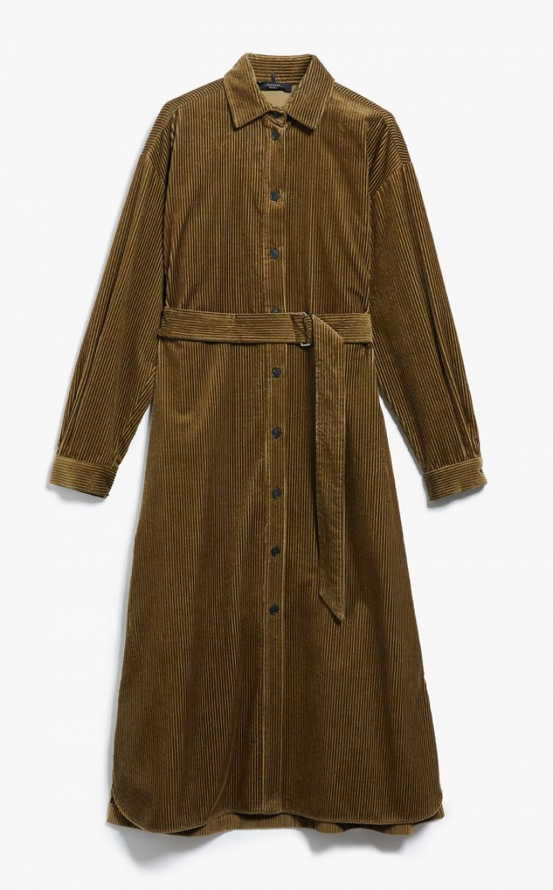 Shirt dress in pure cotton velvet fabric featuring a regular collar, cuff embellished long sleeves and in seam side pockets. Button fastening and a waist tie belt. Length: 124 cm.