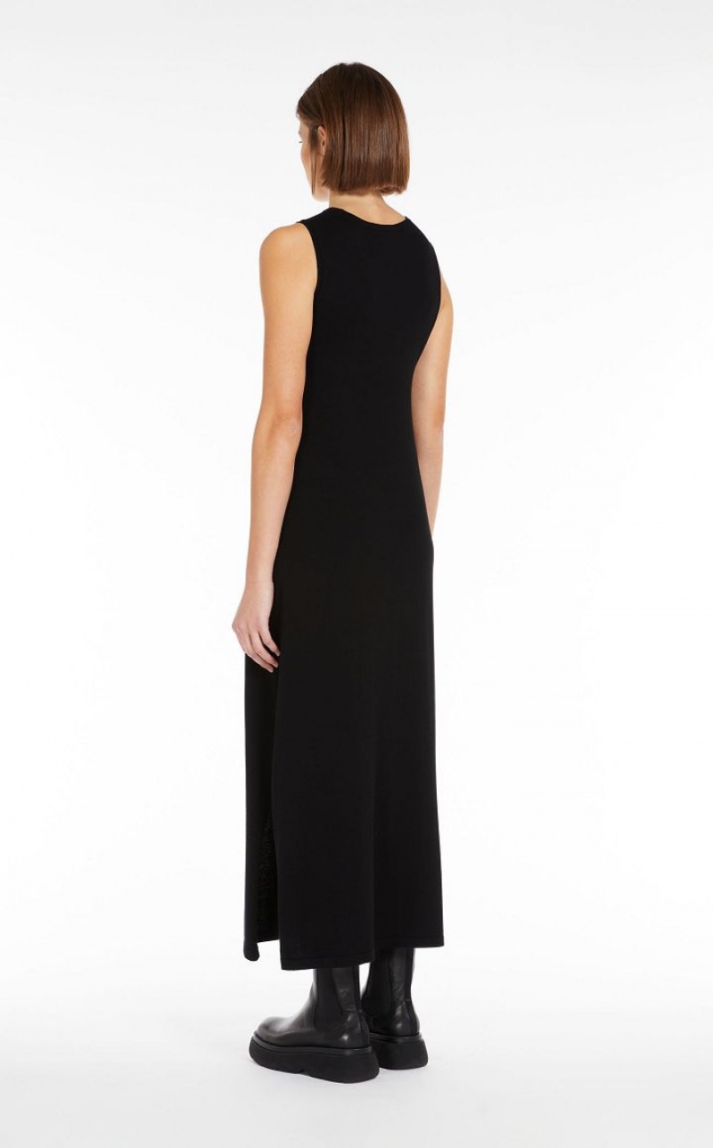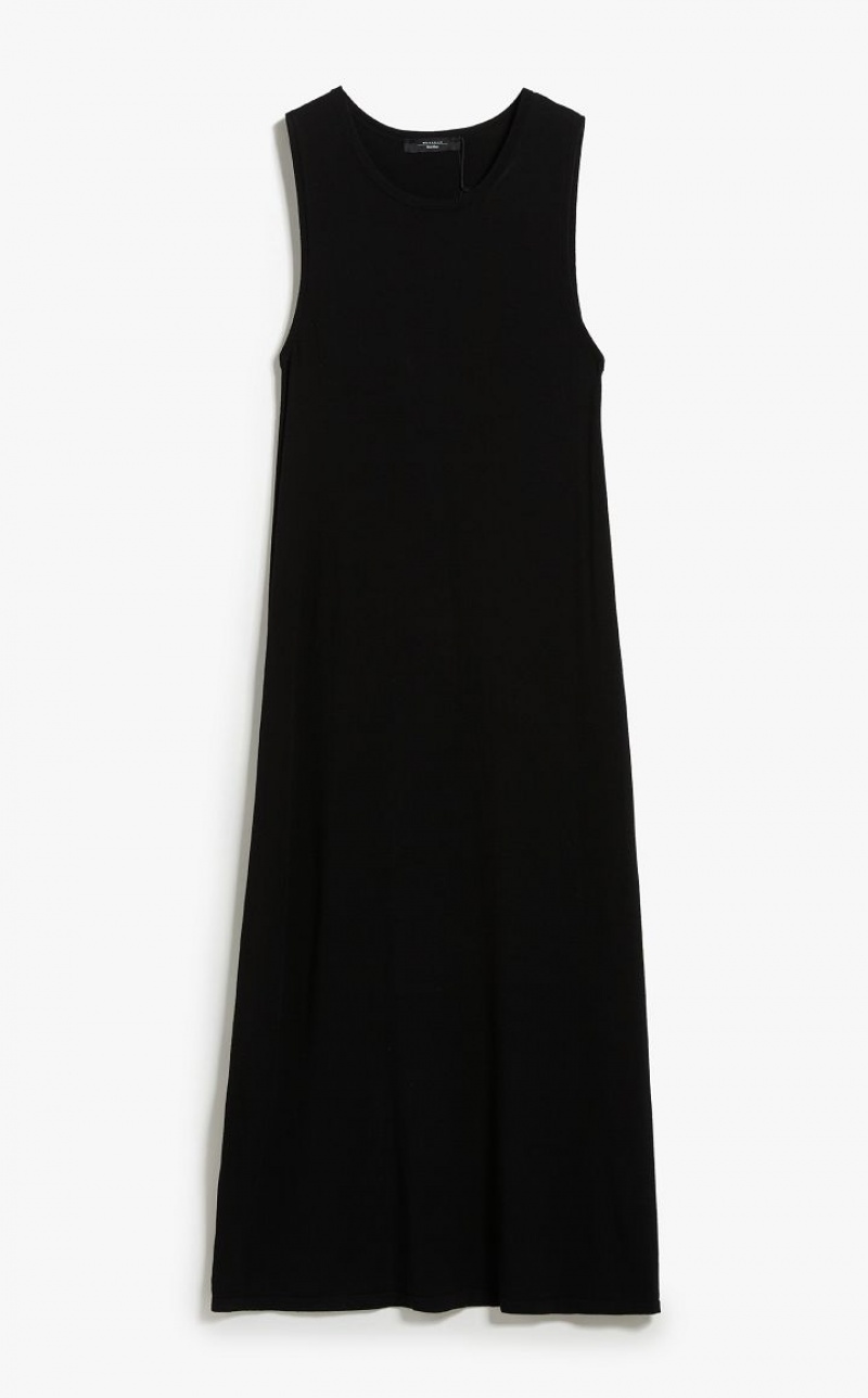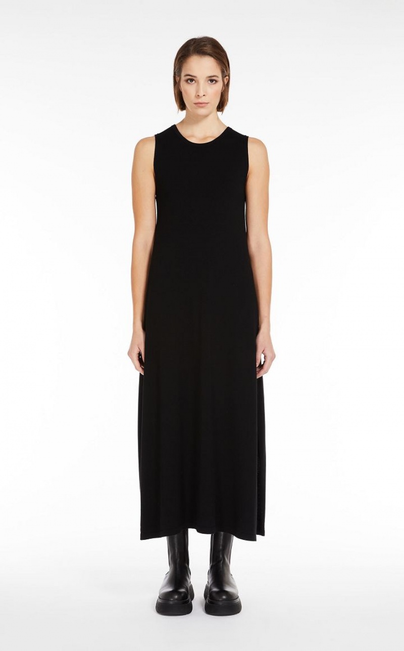 Long sleeveless dress in plain-knit stretch viscose. A-line style with a loose fit, featuring a round neck and slit on the left side.