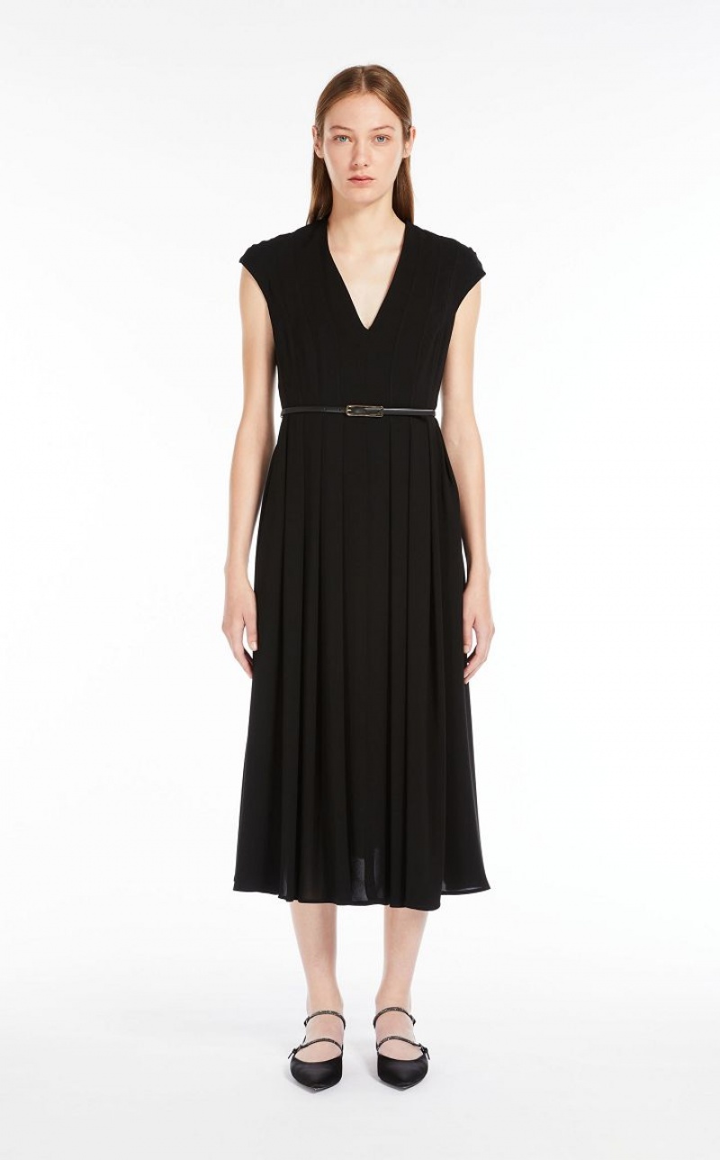 Long V-neck dress in lightweight cady fabric featuring cap sleeves, in addition to feminine silhouette-accentuating elegant vertical dart detail. Waistline-accentuating matching belt. Lined model. Length: 122 cm.
