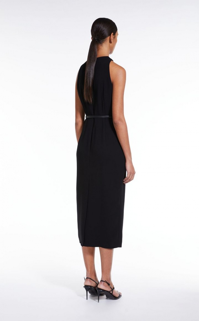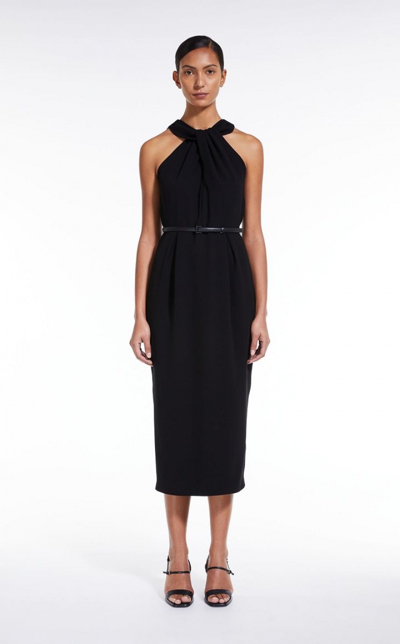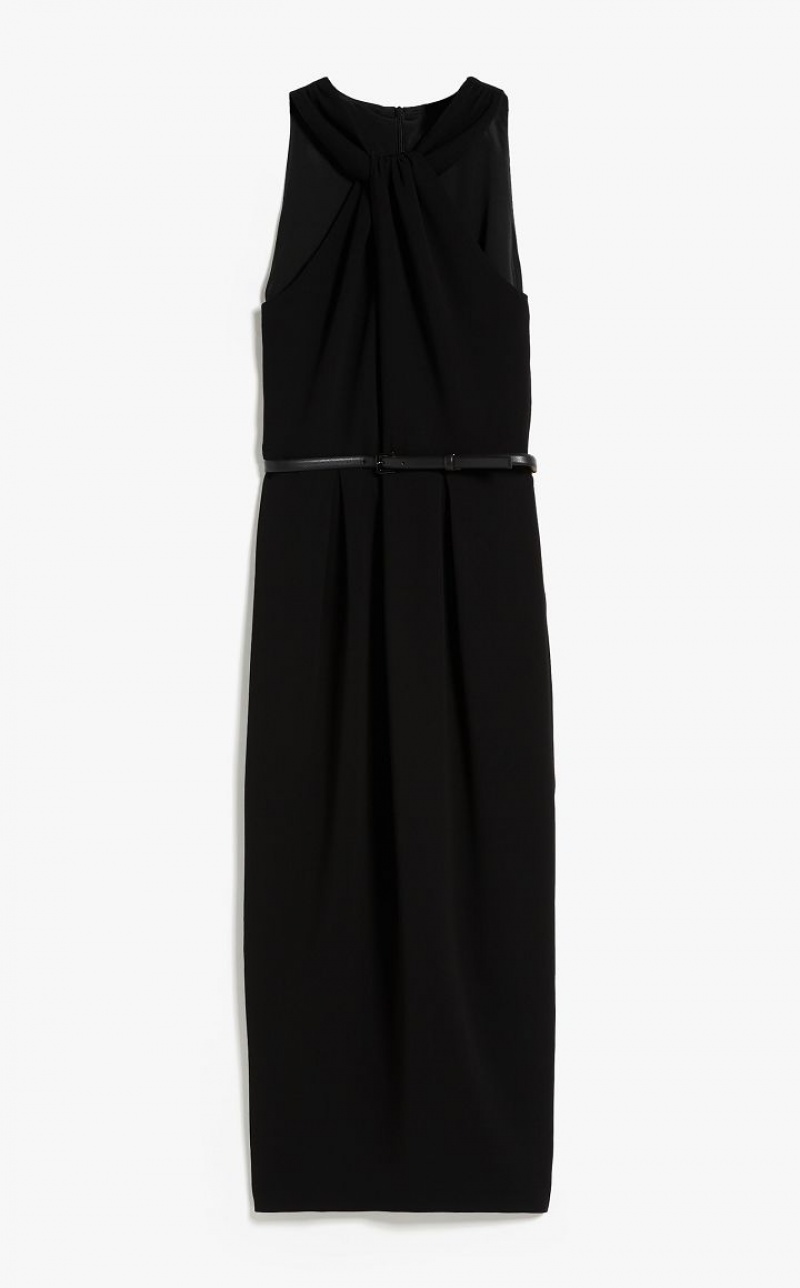 Sleeveless dress with a flowing line made of elegant solid-colour cady. The ultra-feminine silhouette features a draped halter neckline, front pleats, central slit on the back and fitted waist with a small matching leather belt. Invisible zip fastening on the back. Length: 125 cm.