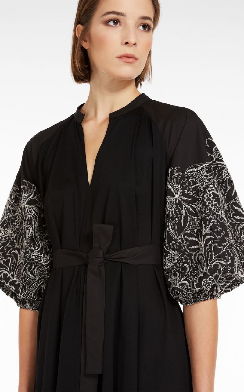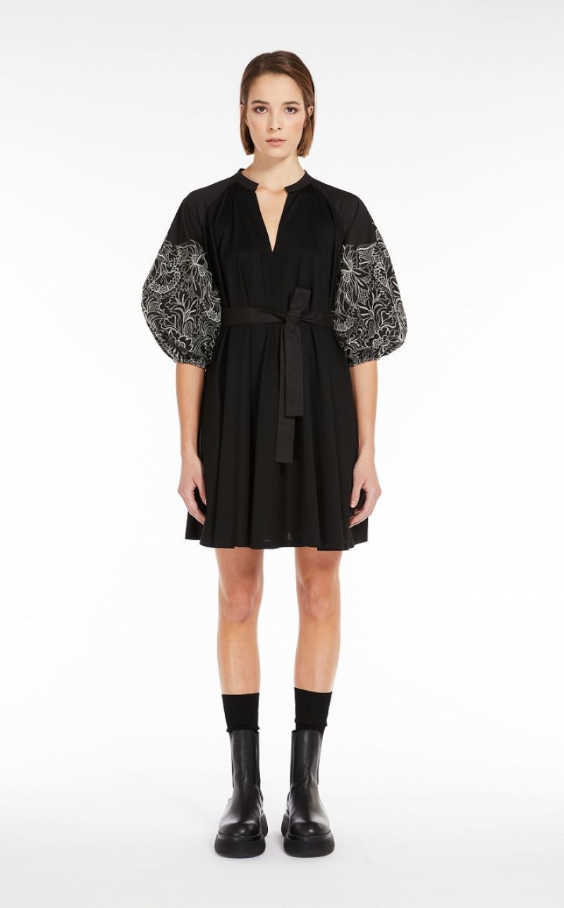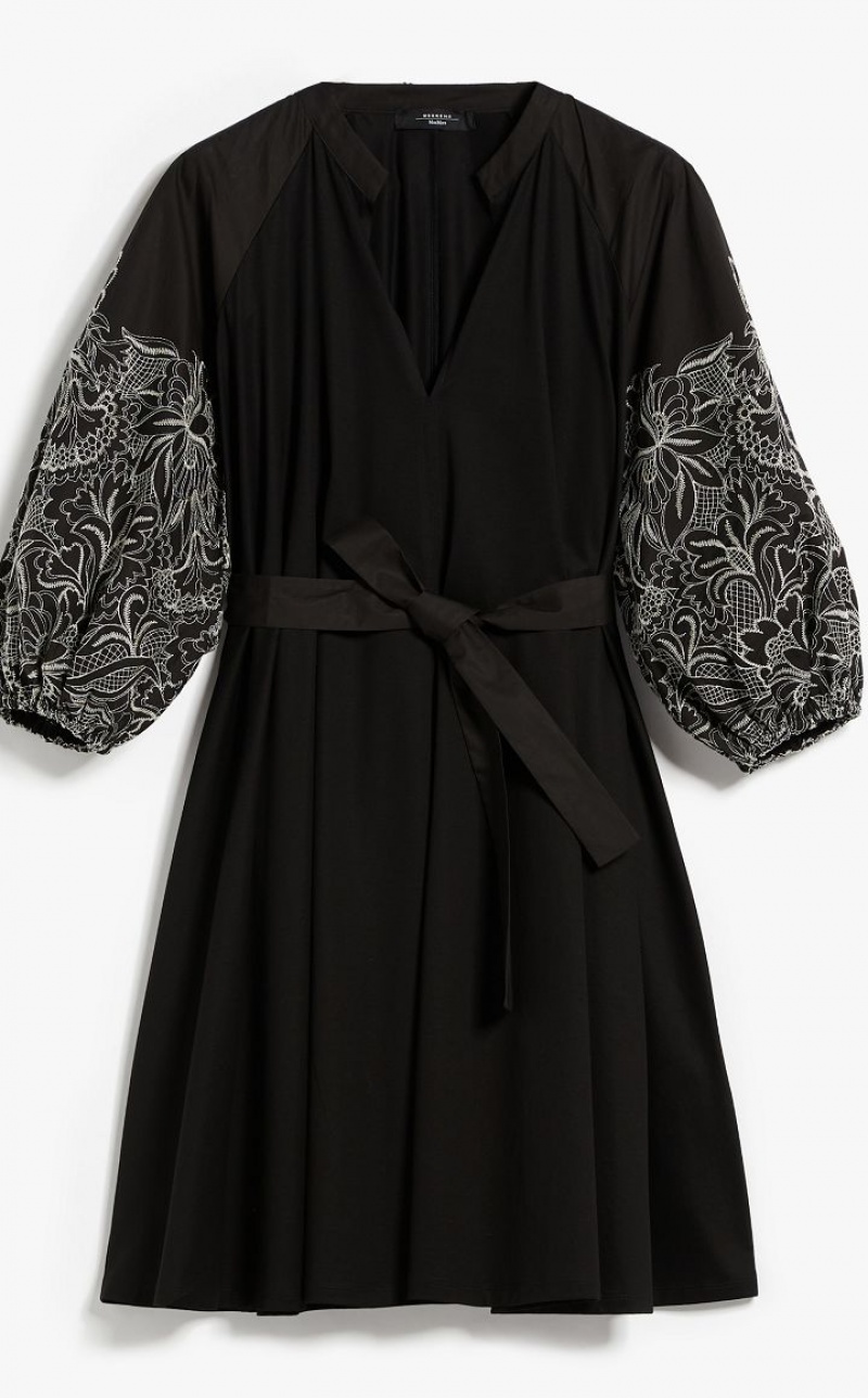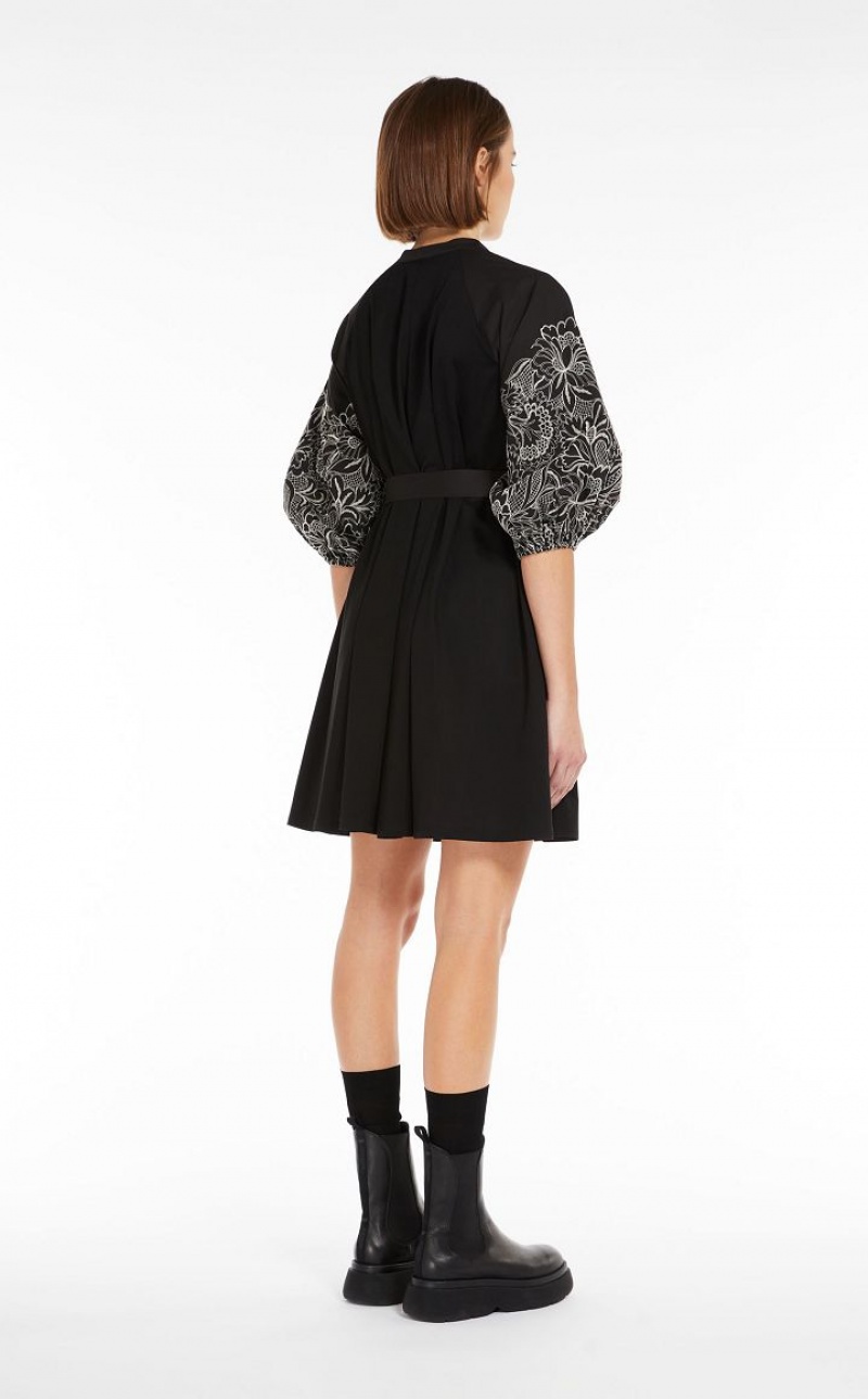 Short dress in soft cotton jersey with V neck and mandarin collar in cotton poplin. The flared silhouette features full puffed sleeves embellished with delicate lace-effect embroidery. The matching belt emphasises the waistline.