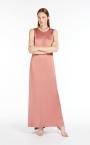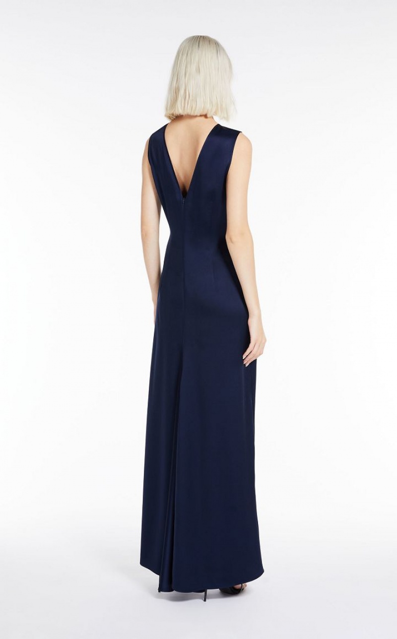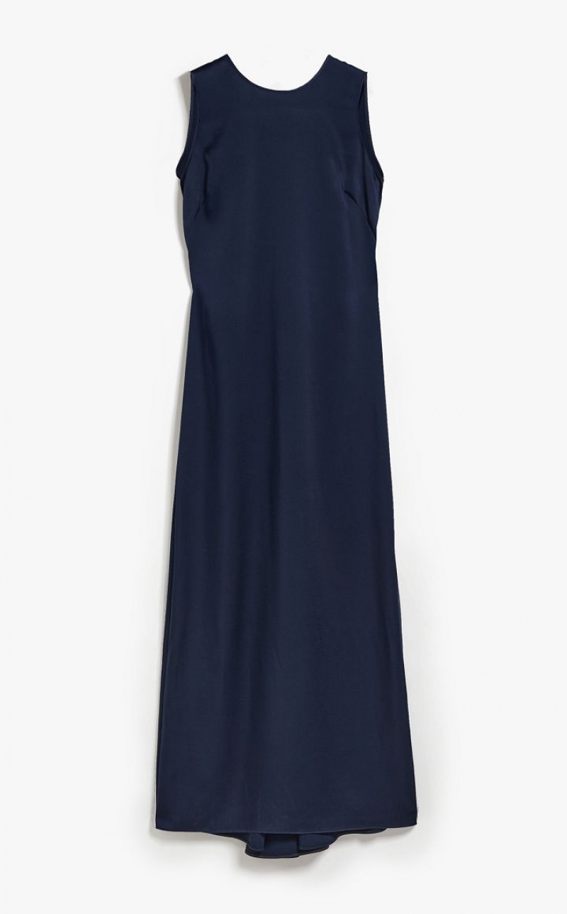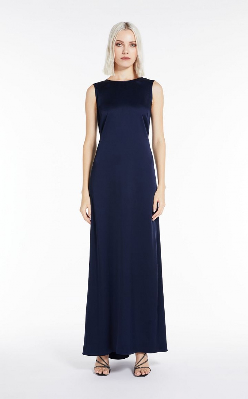 Sleeveless dress in fine shiny crepe envers satin fabric. The fluid-fit model boasts an elegant bias-cut neckerchief inlay at the back, in addition to a plunging V-neckline. Length: 150 cm.
