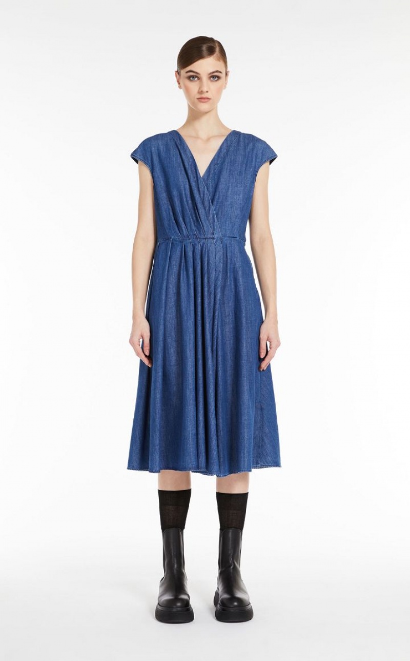Mini dress in pure cotton denim with short kimono sleeves and pockets set into the side seams. The silhouette features a crossover V neck with draped pleats and a wrap skirt.