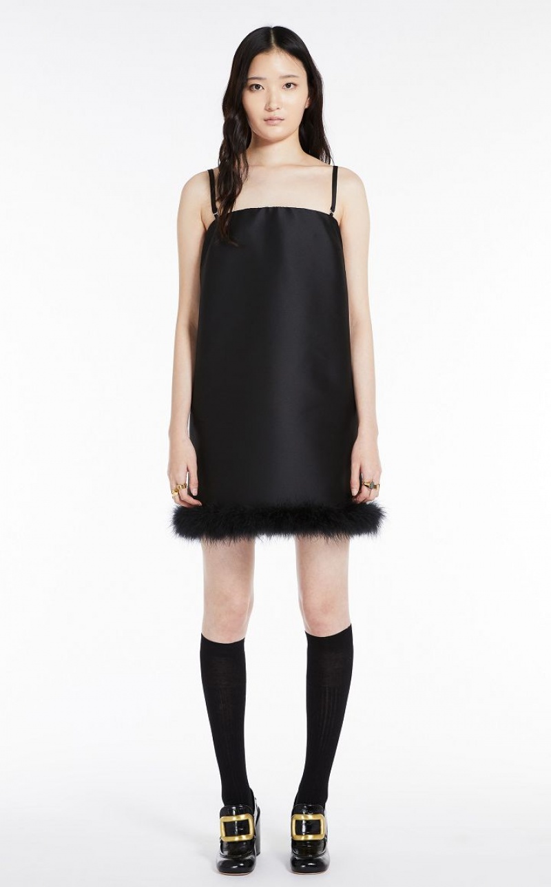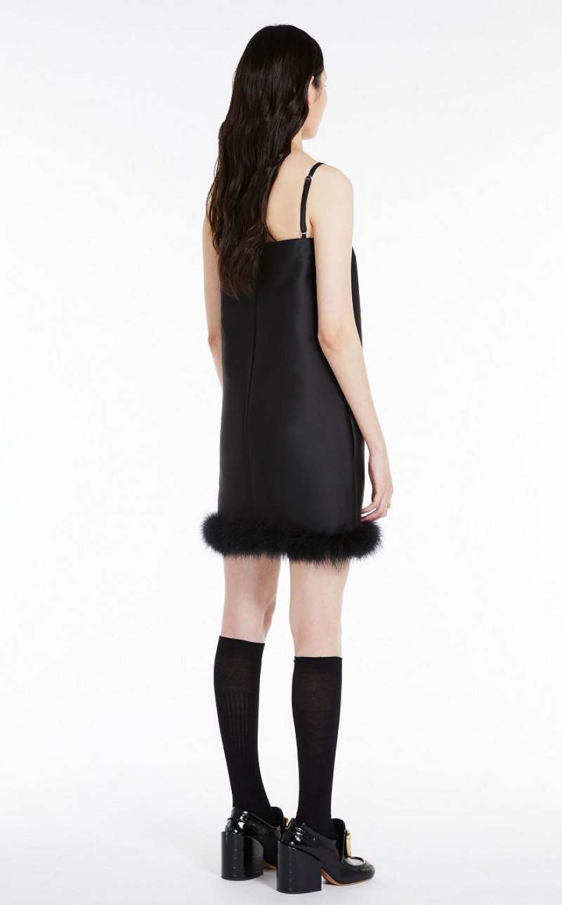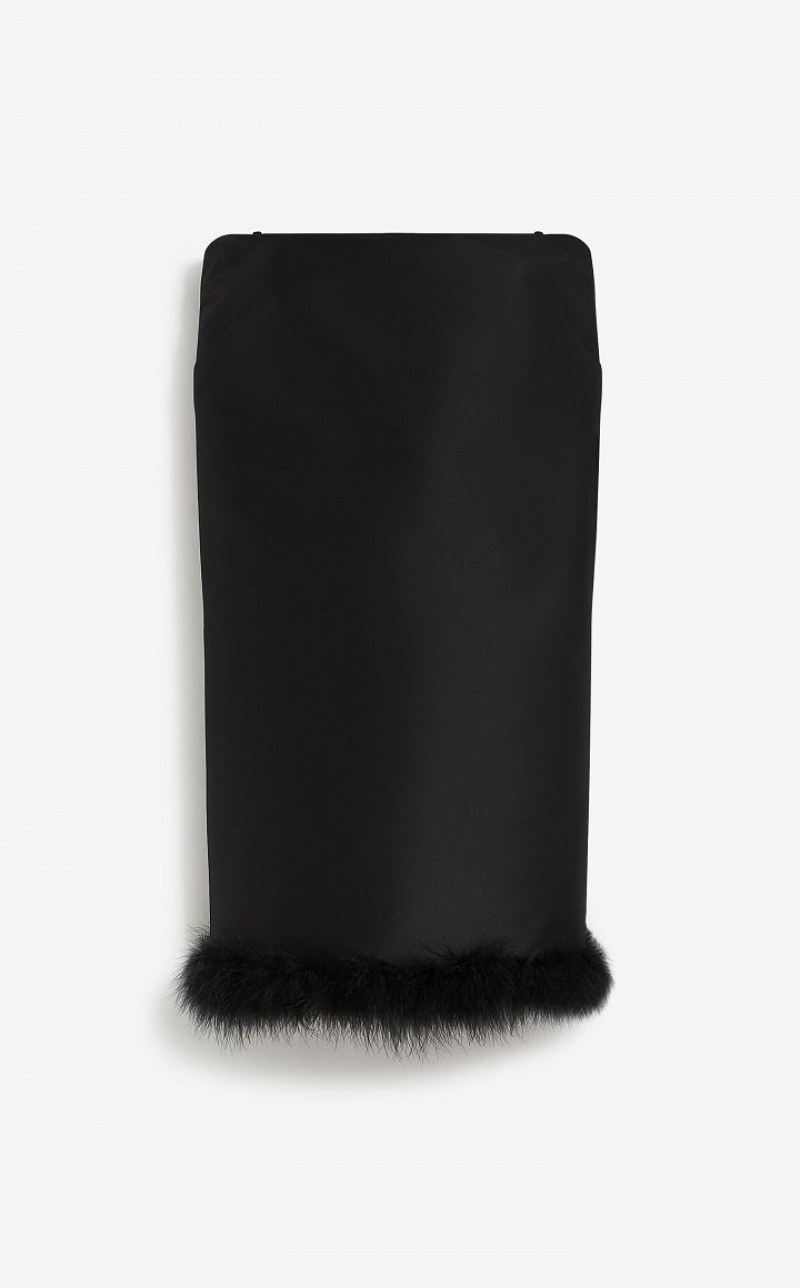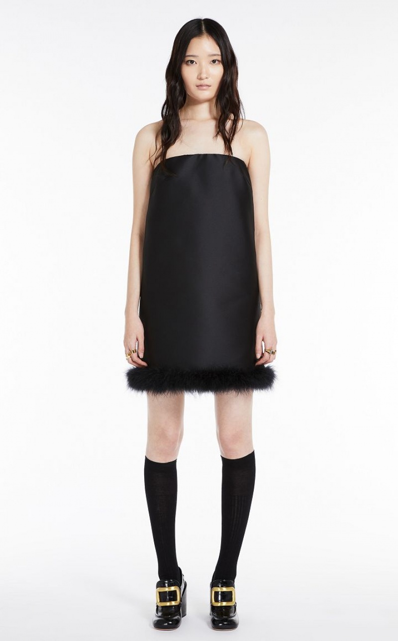 Bustier mini dress made of technical stretch twill with a shiny finish. The neckline is completed by internal silicone ribbon and adjustable, removable straps for two different styling options. Straight cut over the figure and garment hemline decorated with an on-tone feather insert. Easy to wear thanks to the concealed zip on the back. Lined.