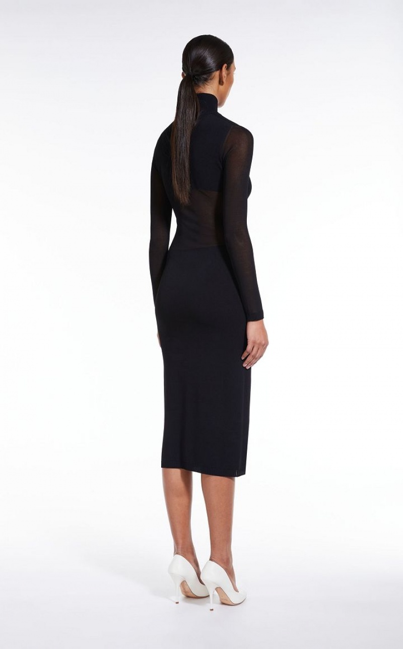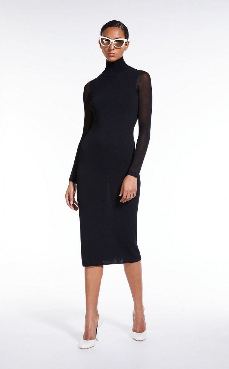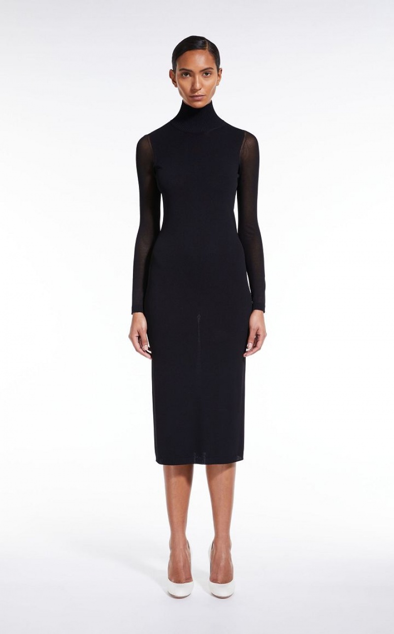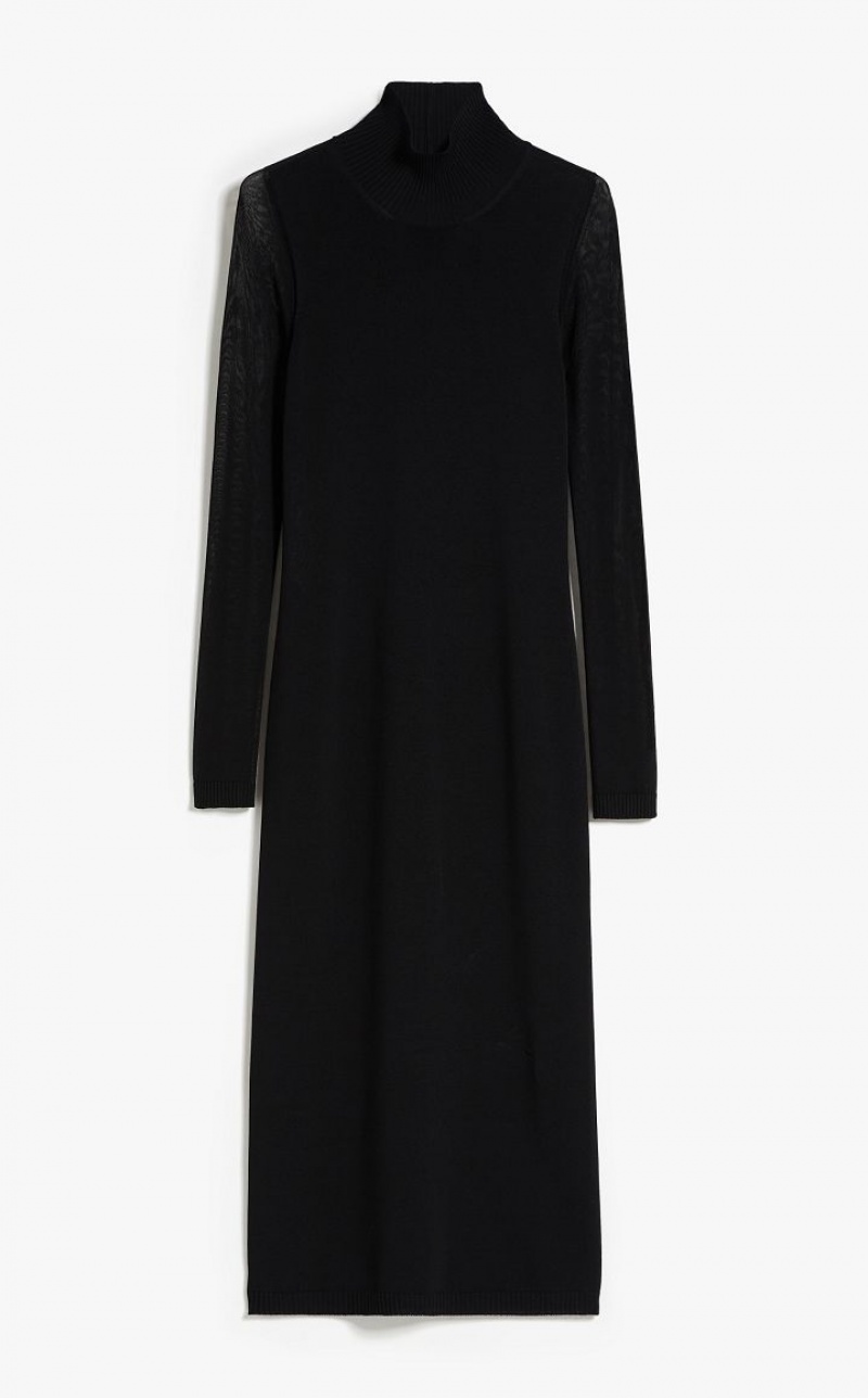 Fitted polo neck dress made of stretch viscose yarn, featuring a seamless knit and a delicate sheer pattern on the sleeves. Ribbed collar finish. Length: 112 cm.
