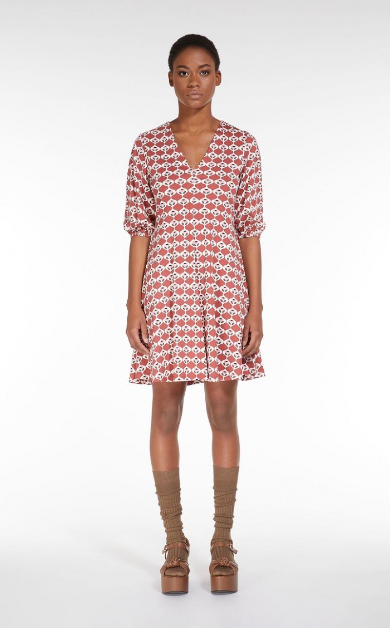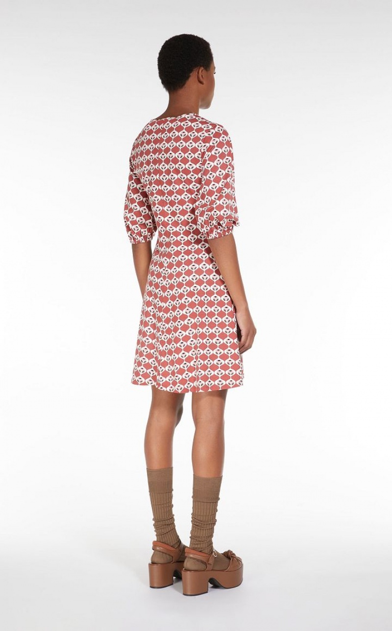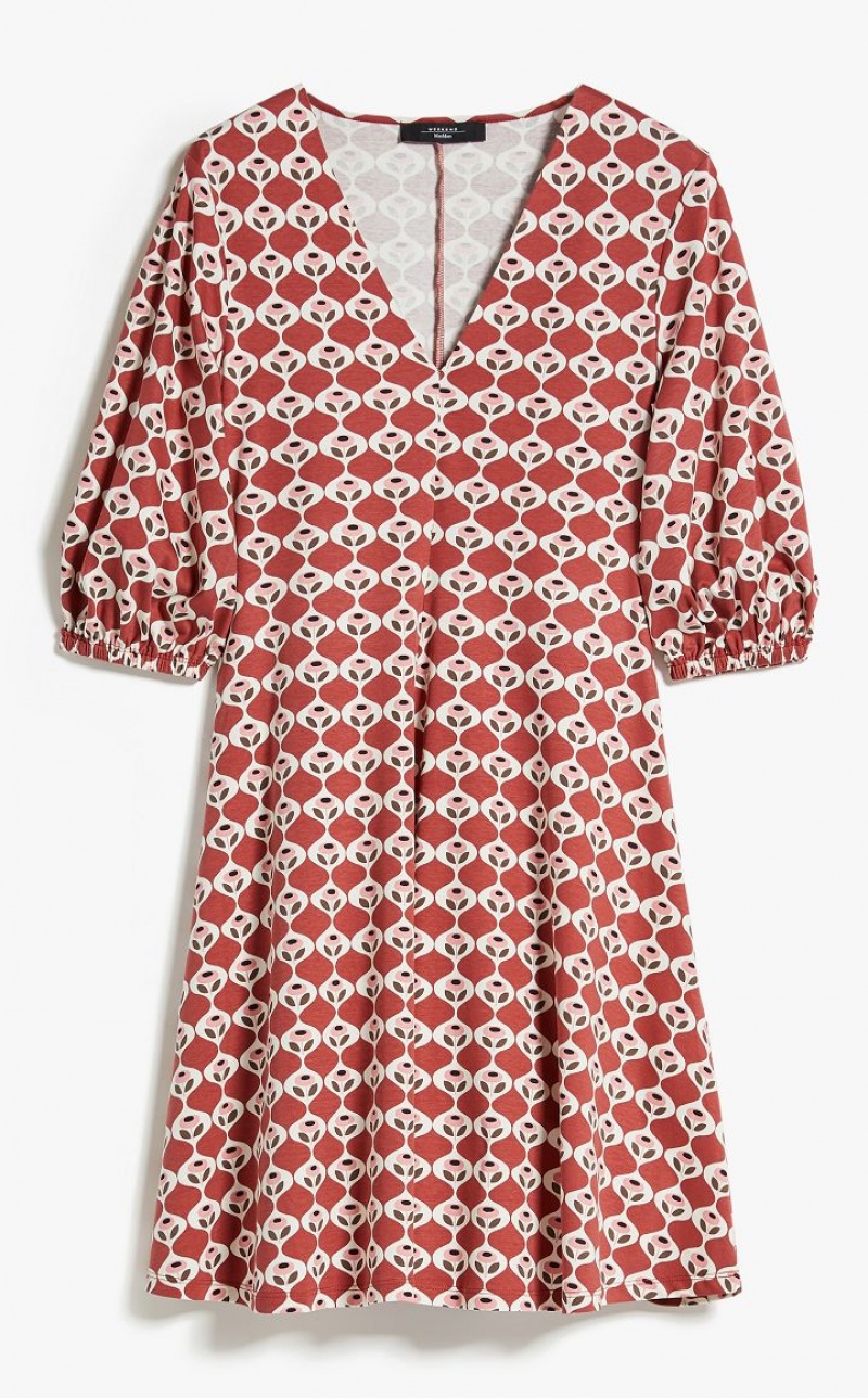 Short dress in soft cotton jersey with all-over print. Style with a fitted silhouette that flares at the hem, V neck and 3/4 sleeves with subtle gathering at the wrists to create volume.