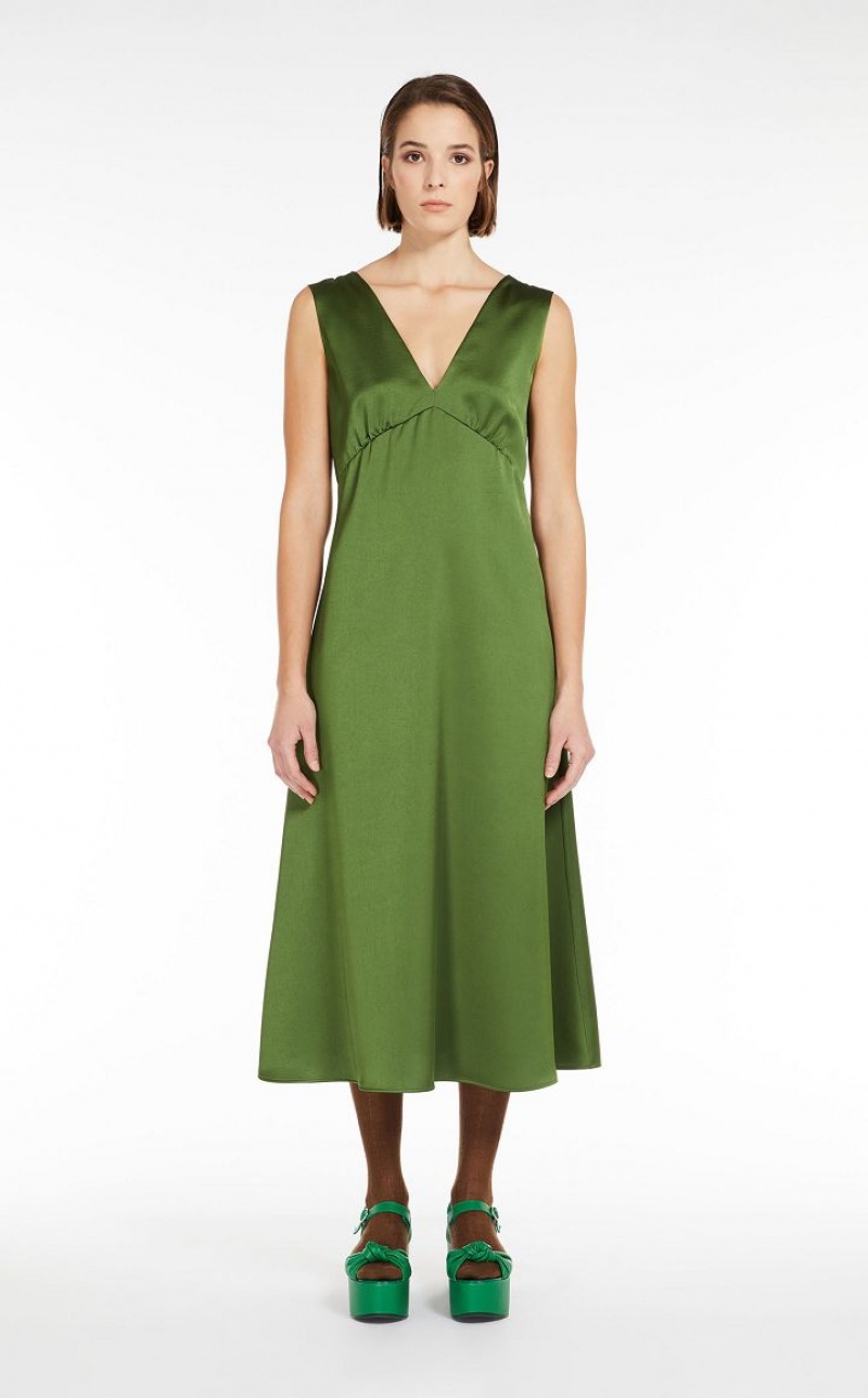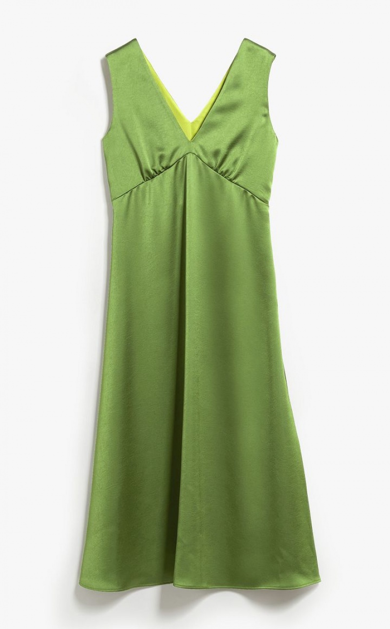 Long sleeveless dress in glossy luxe satin. The silhouette has a highly feminine semi-fitted line, with V neck and loose skirt. Lined.