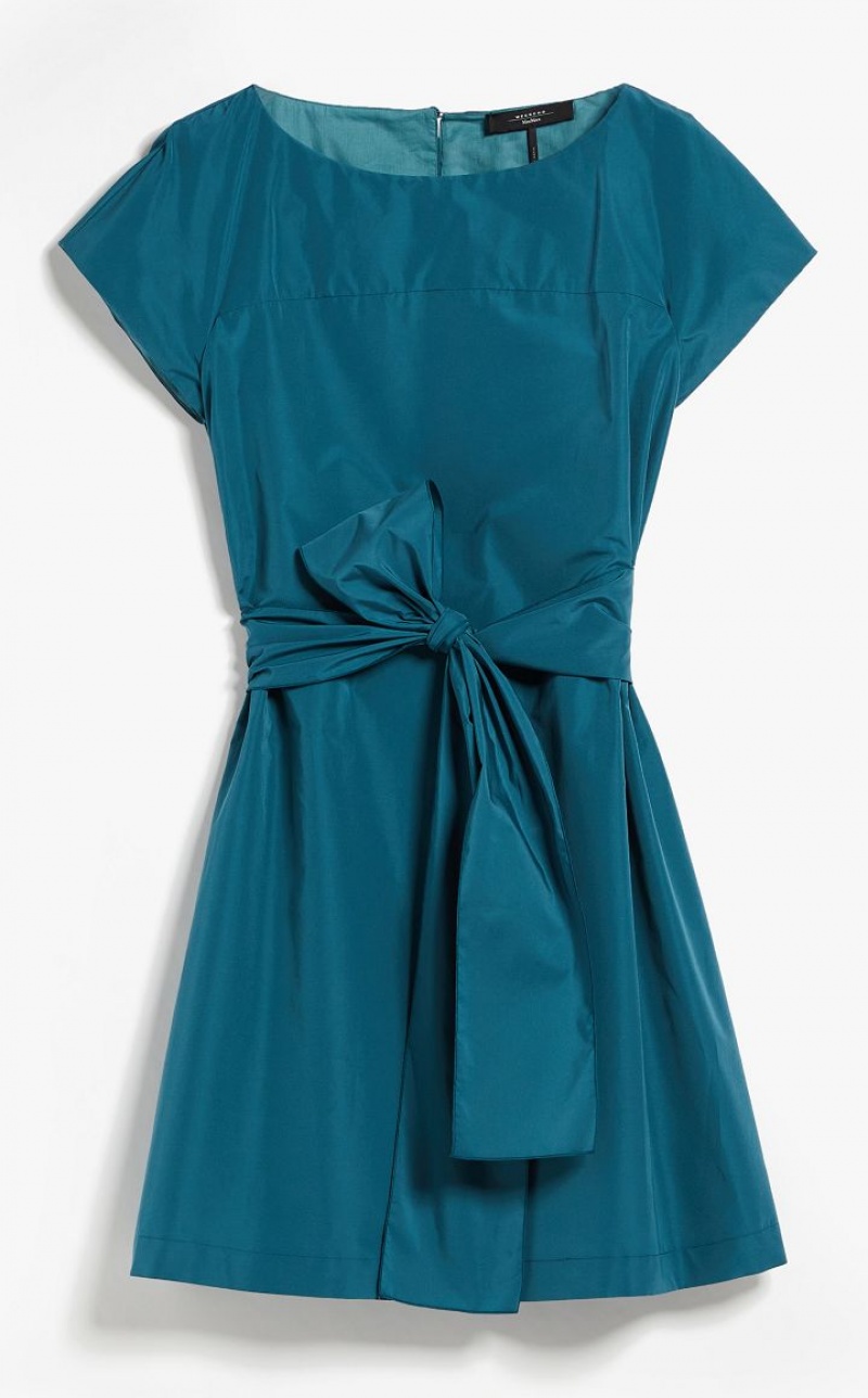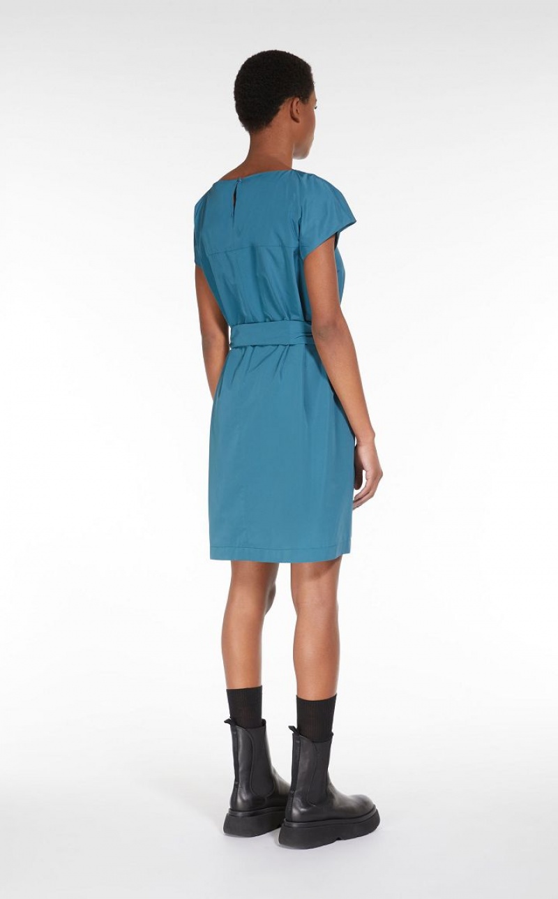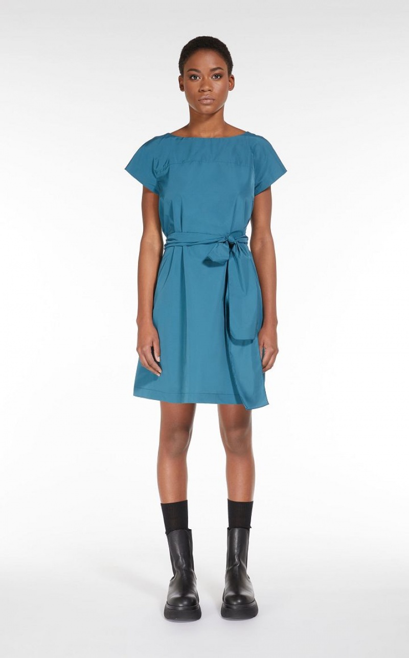 Short dress in lightweight cotton blend taffeta, with boat neck, short kimono sleeves and side pockets. This style has a straight line, flaring slightly at the bottom. Teardrop fastening on the back and matching belt to emphasise the waistline.