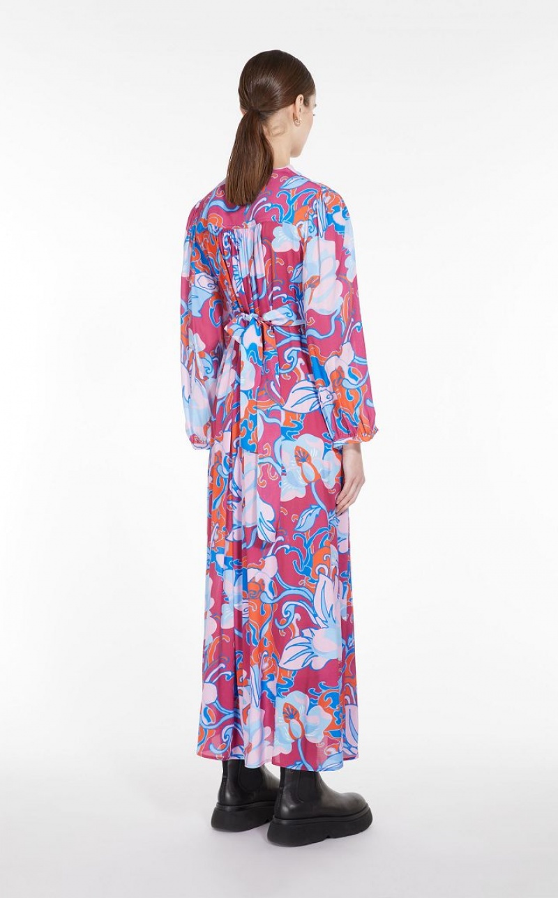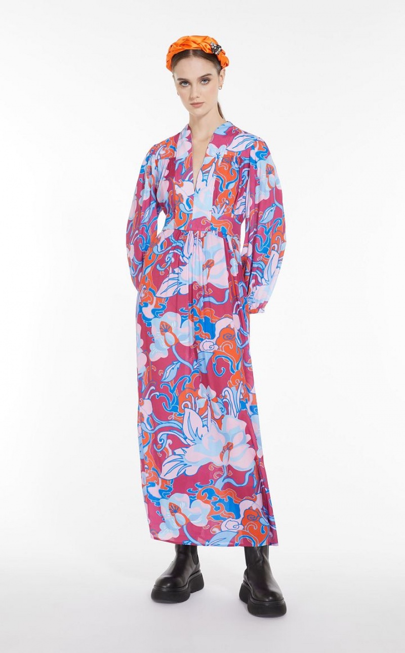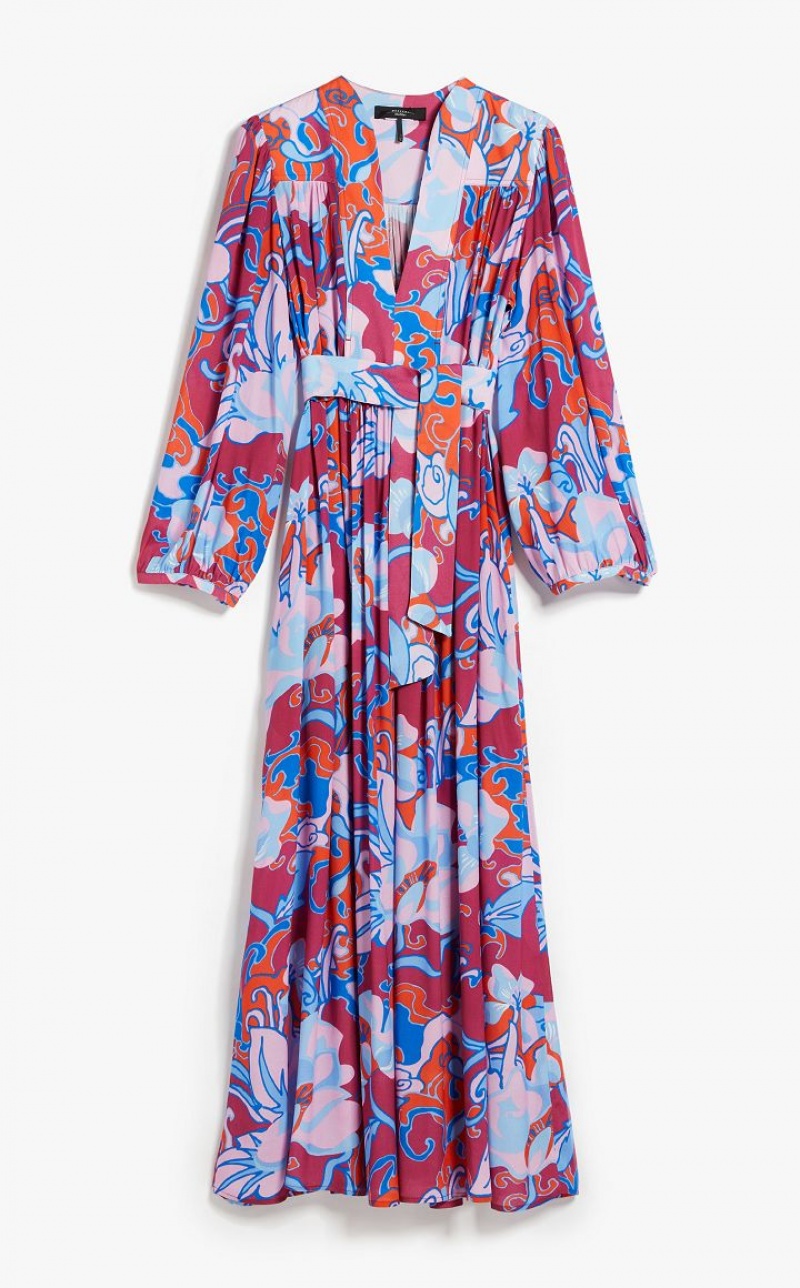 Long dress in a luxe printed viscose georgette. The feminine silhouette features a seam at the waist and a belt that ties at the back of the waist to define the figure. Features a wide V neck with gathering, long full sleeves with elasticated cuffs, and a loose flared skirt.