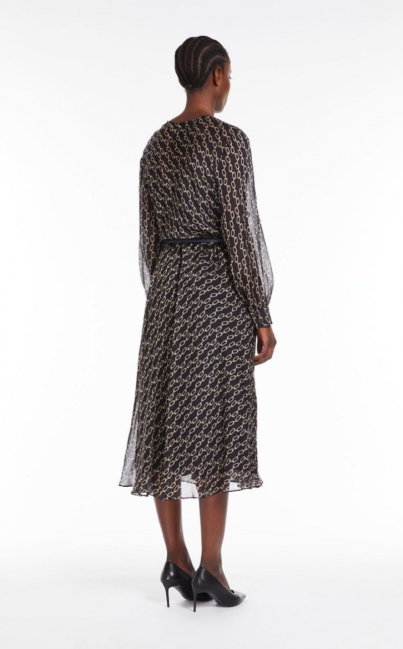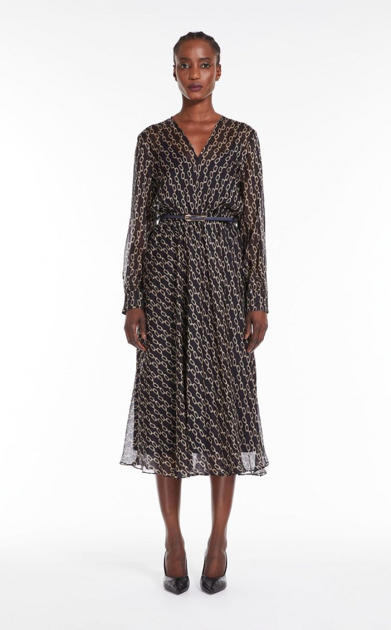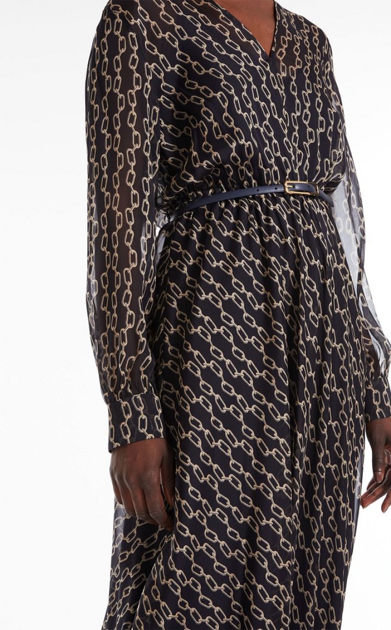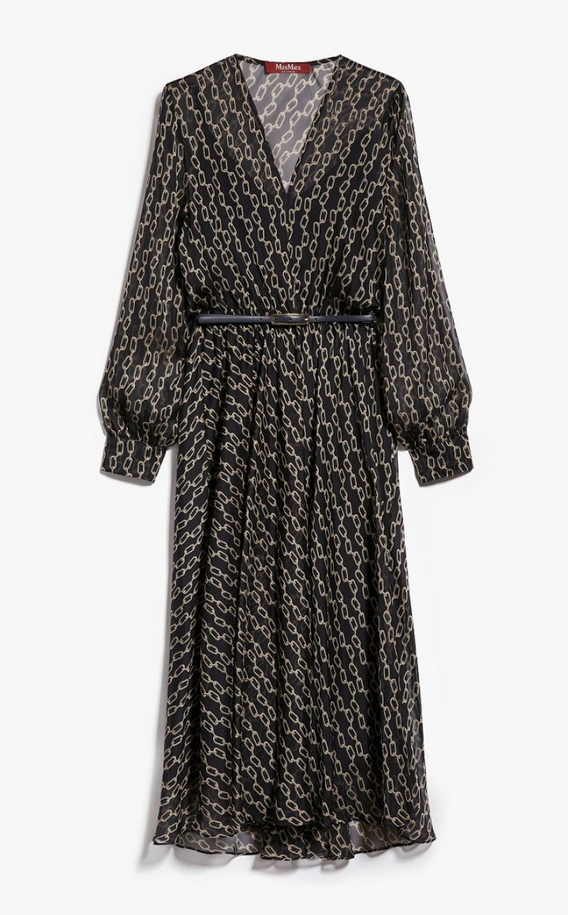 Dress with a flowing, feminine silhouette made of printed, pure silk lightweight chiffon, with a wide skirt, long sleeves with shirt cuffs and a belt to accentuate the waist. The style features a matching slip. Length: 120 cm.