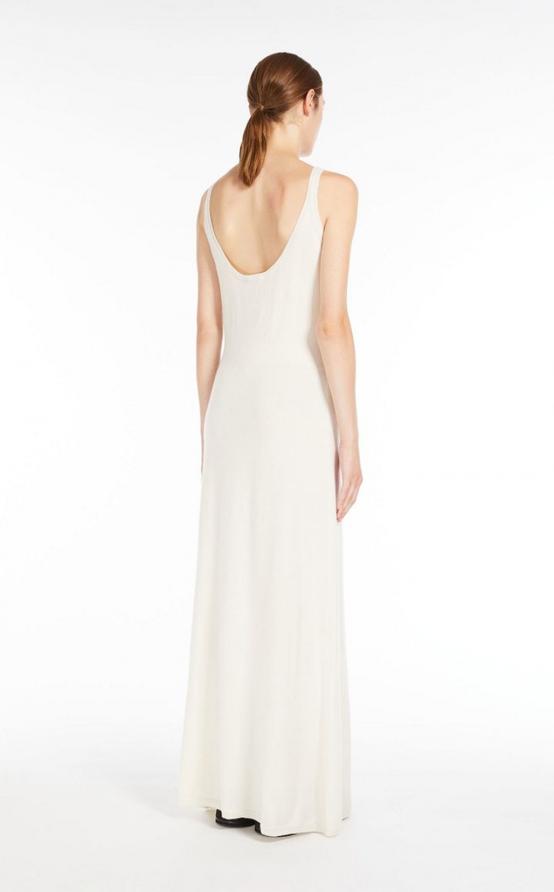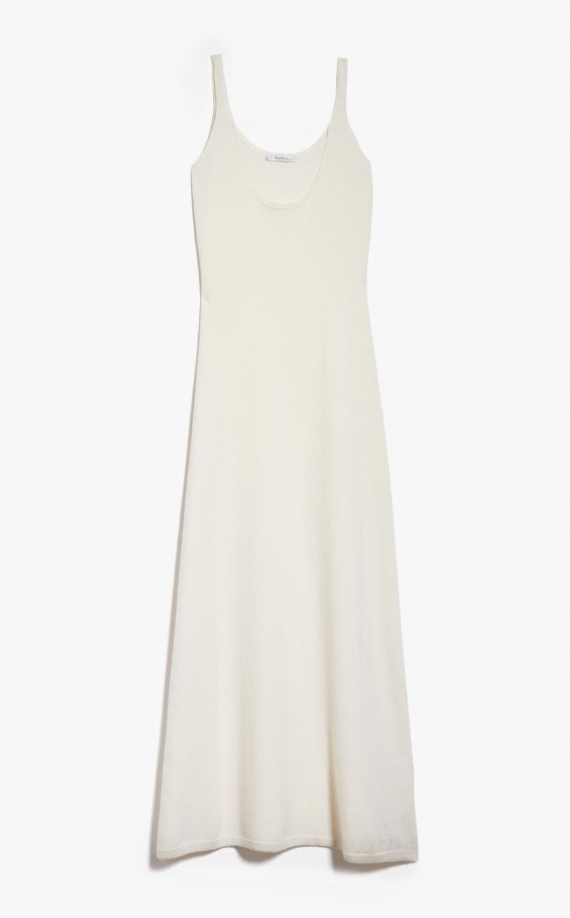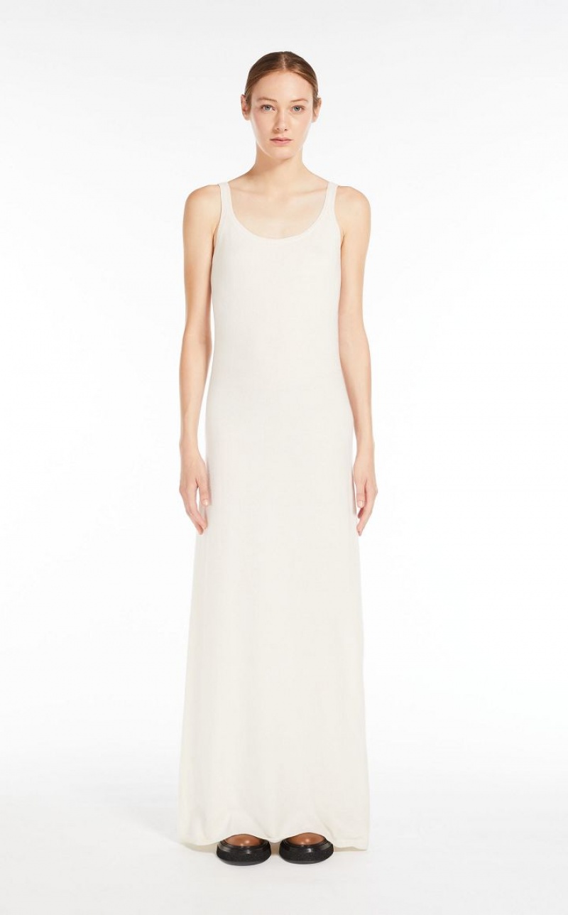 Long sleeveless dress in fine wool and cashmere yarn, with thin shoulder straps and wide round neckline on the front and back. Slip dress style with a loose, feminine silhouette, flared at the hem. Finished with ribbed edges. Length: 155 cm.