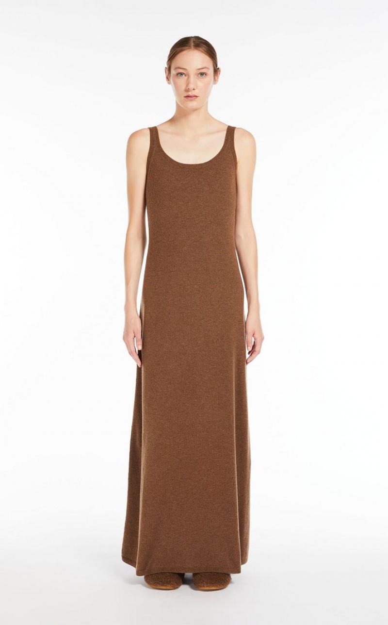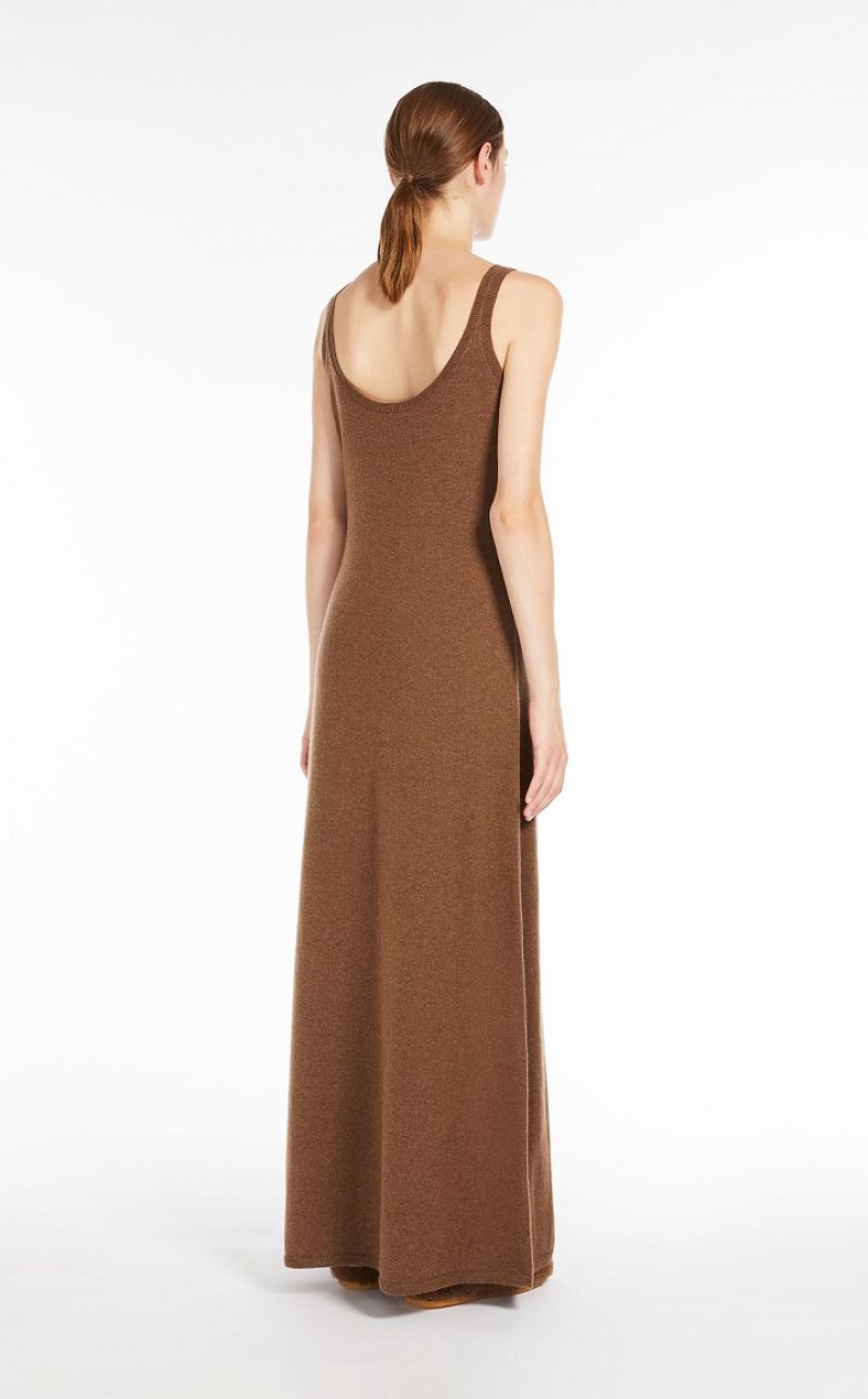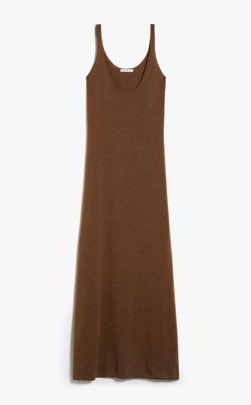 Long sleeveless dress in fine wool and cashmere yarn, with thin shoulder straps and wide round neckline on the front and back. Slip dress style with a loose, feminine silhouette, flared at the hem. Finished with ribbed edges. Length: 155 cm.