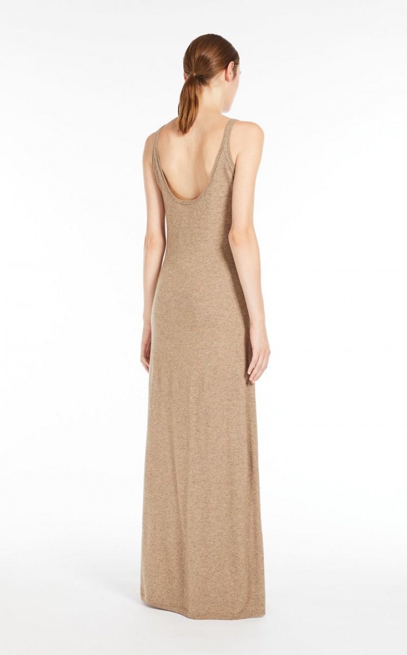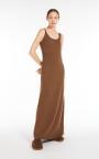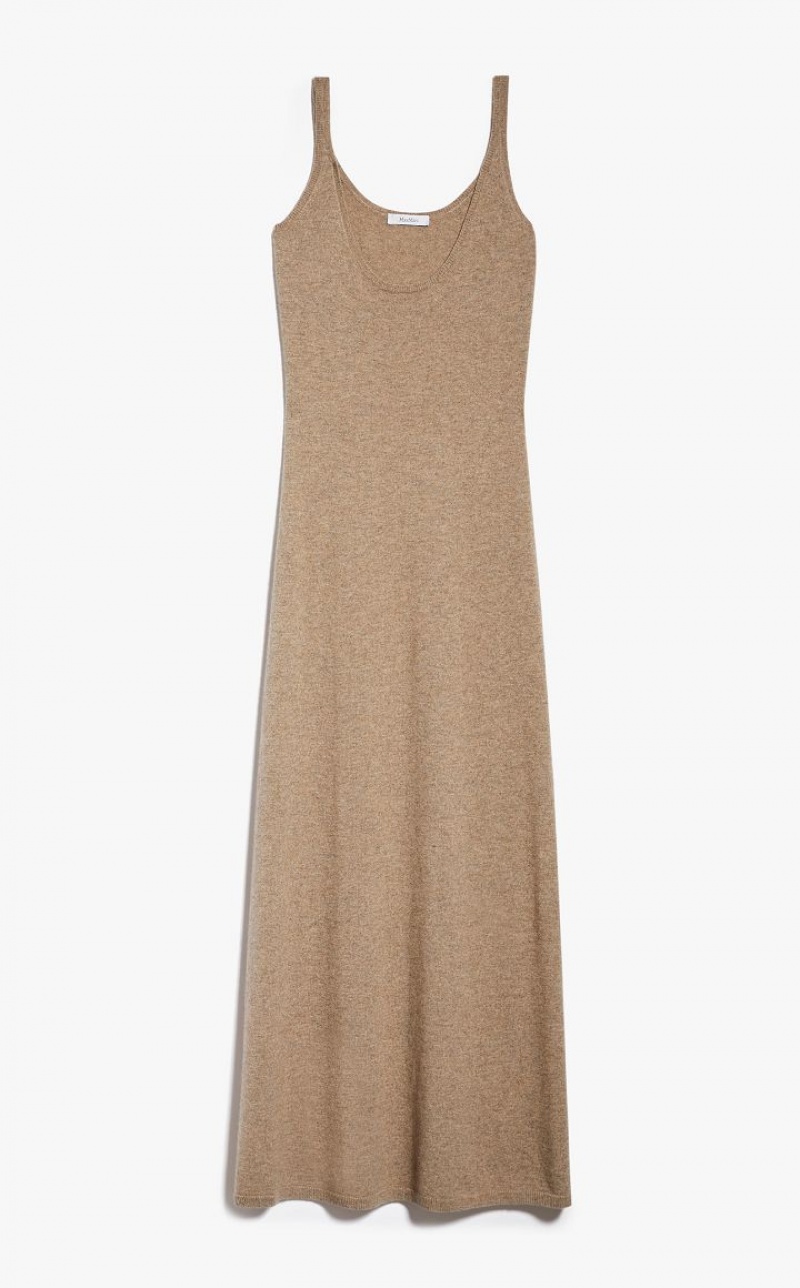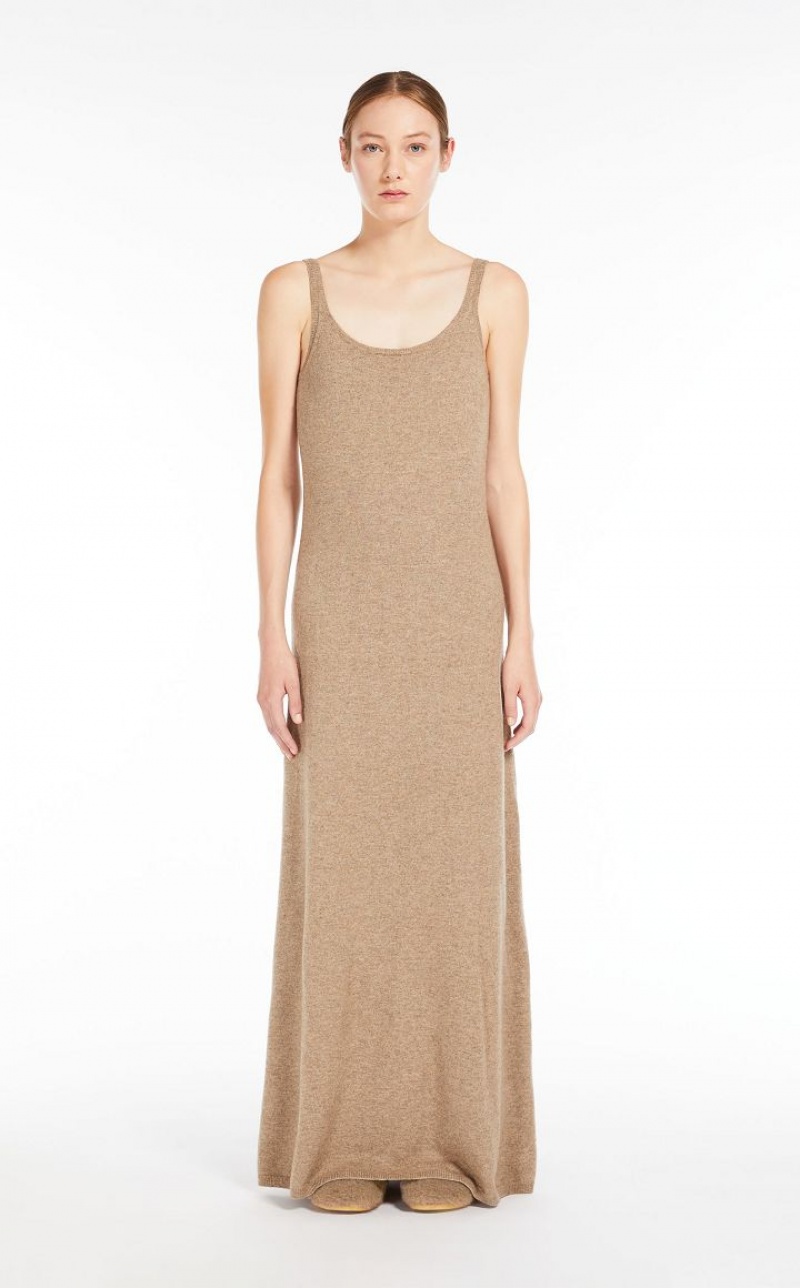 Long sleeveless dress in fine wool and cashmere yarn, with thin shoulder straps and wide round neckline on the front and back. Slip dress style with a loose, feminine silhouette, flared at the hem. Finished with ribbed edges. Length: 155 cm.