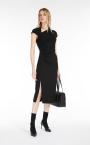 Elegant long sleeveless dress in cady fabric featuring a slim fit, refined gathered detail at the side, an asymmetrical geometric neckline and a small kimono sleeve. Lined model. Length: 118 cm