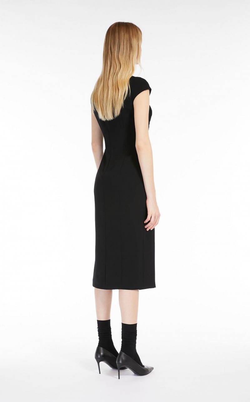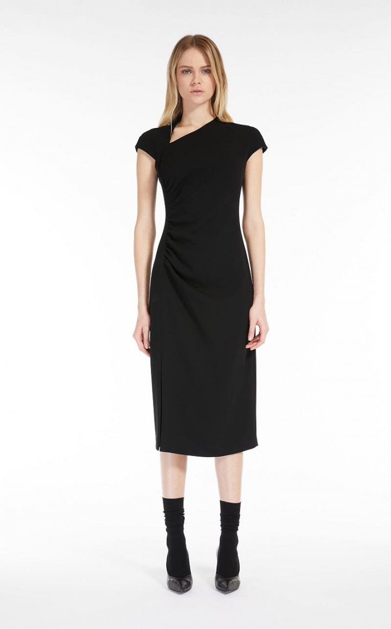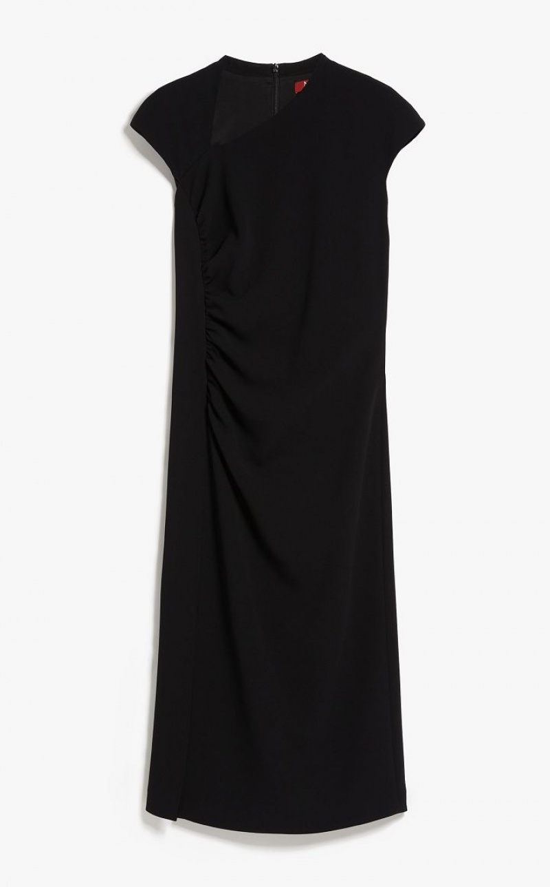 Elegant long sleeveless dress in cady fabric featuring a slim fit, refined gathered detail at the side, an asymmetrical geometric neckline and a small kimono sleeve. Lined model. Length: 118 cm