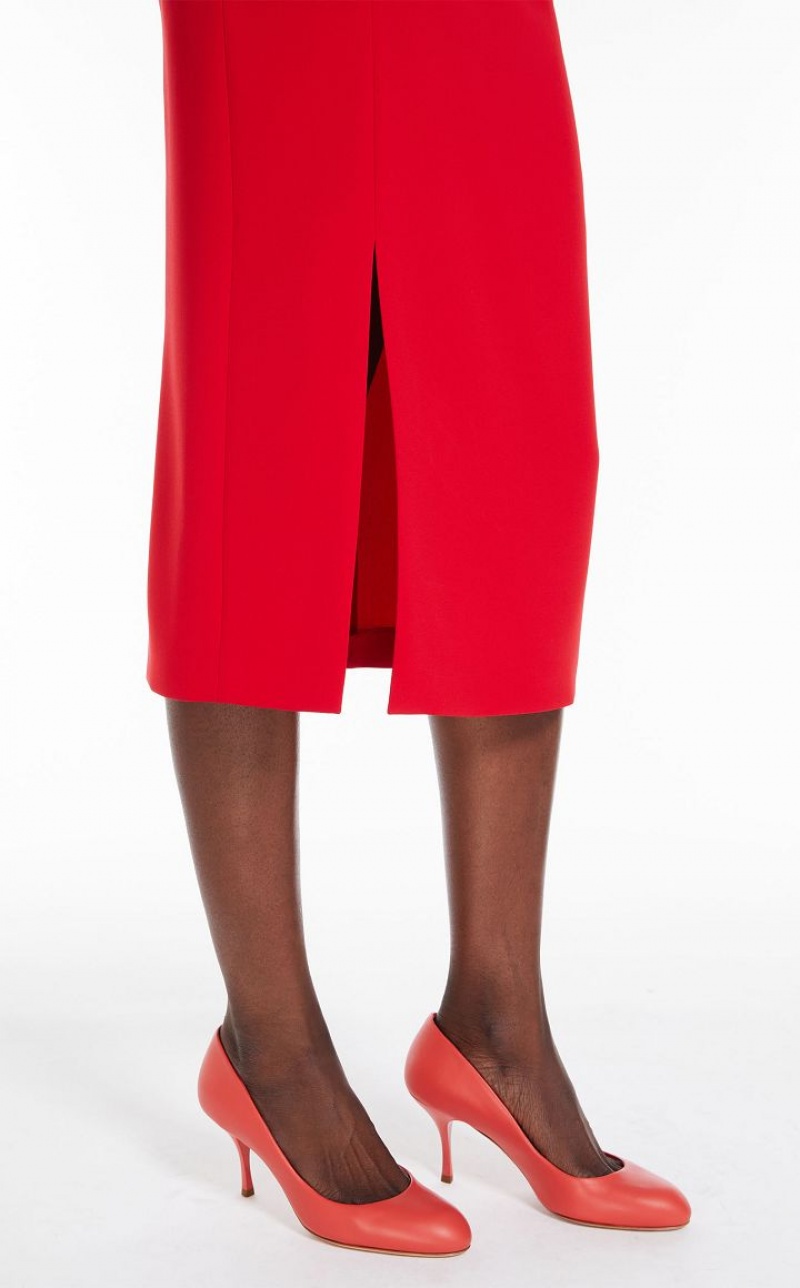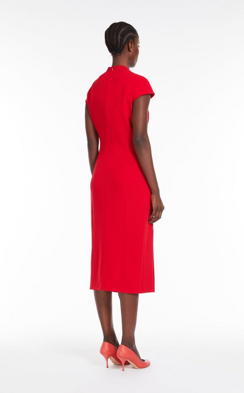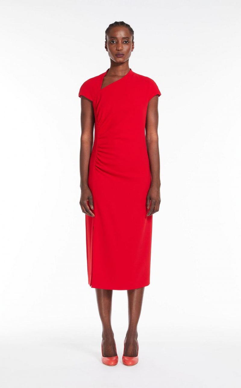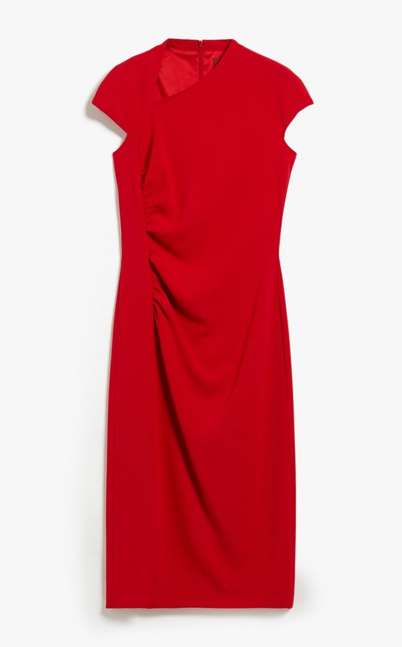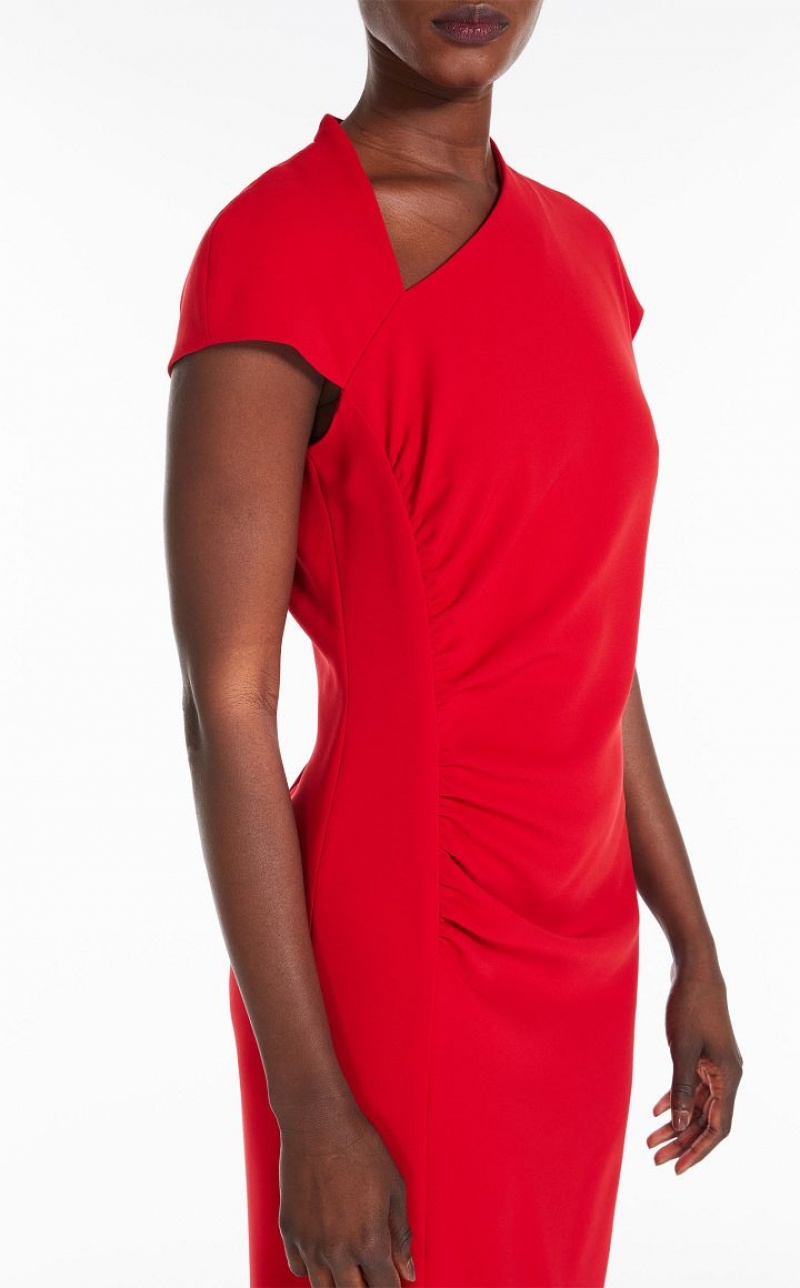 Elegant long sleeveless dress in cady fabric featuring a slim fit, refined gathered detail at the side, an asymmetrical geometric neckline and a small kimono sleeve. Lined model. Length: 118 cm