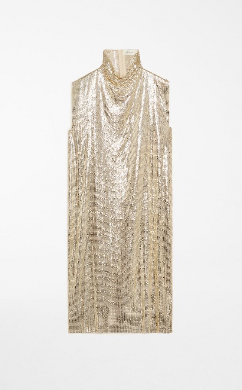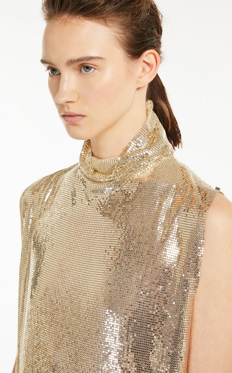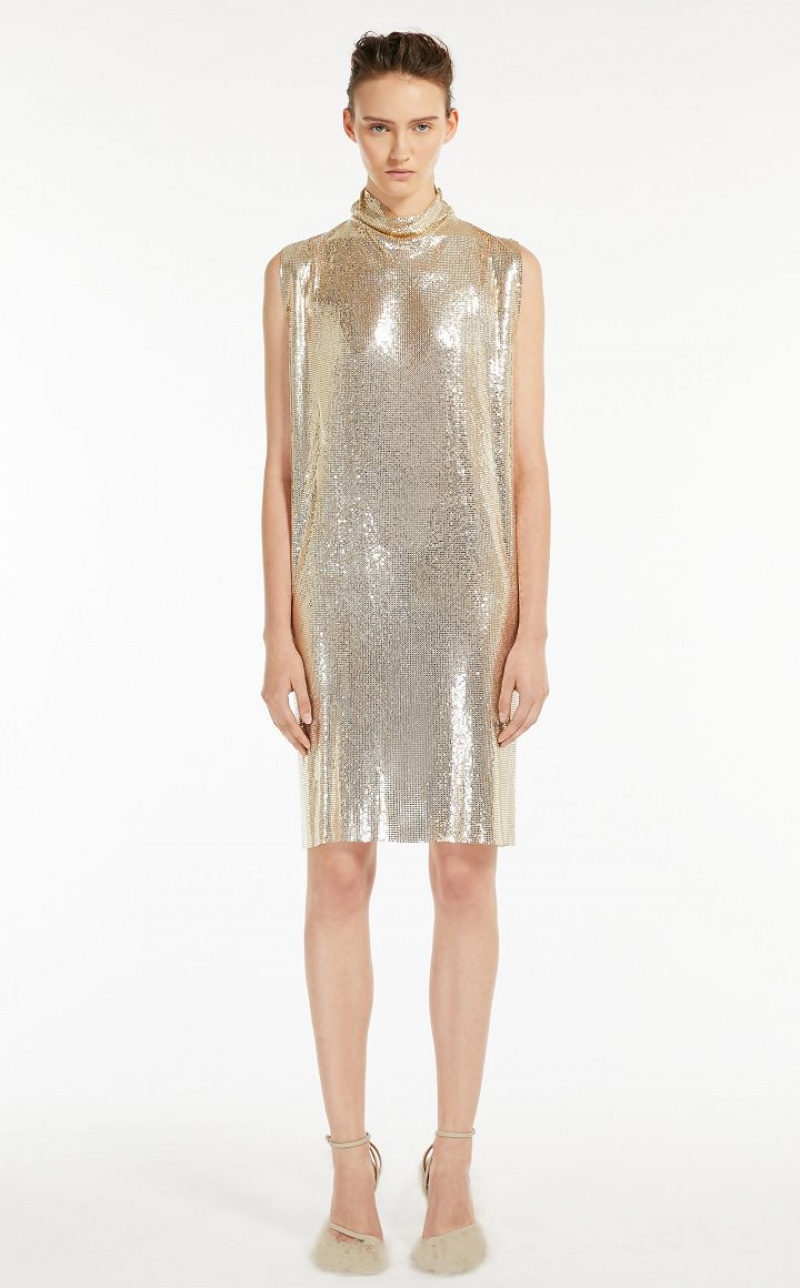 Metallic-knit sleeveless high-neck dress. The feminine, tight-fitting garment boasts delicate drape-creating cut-out detail at the waist
