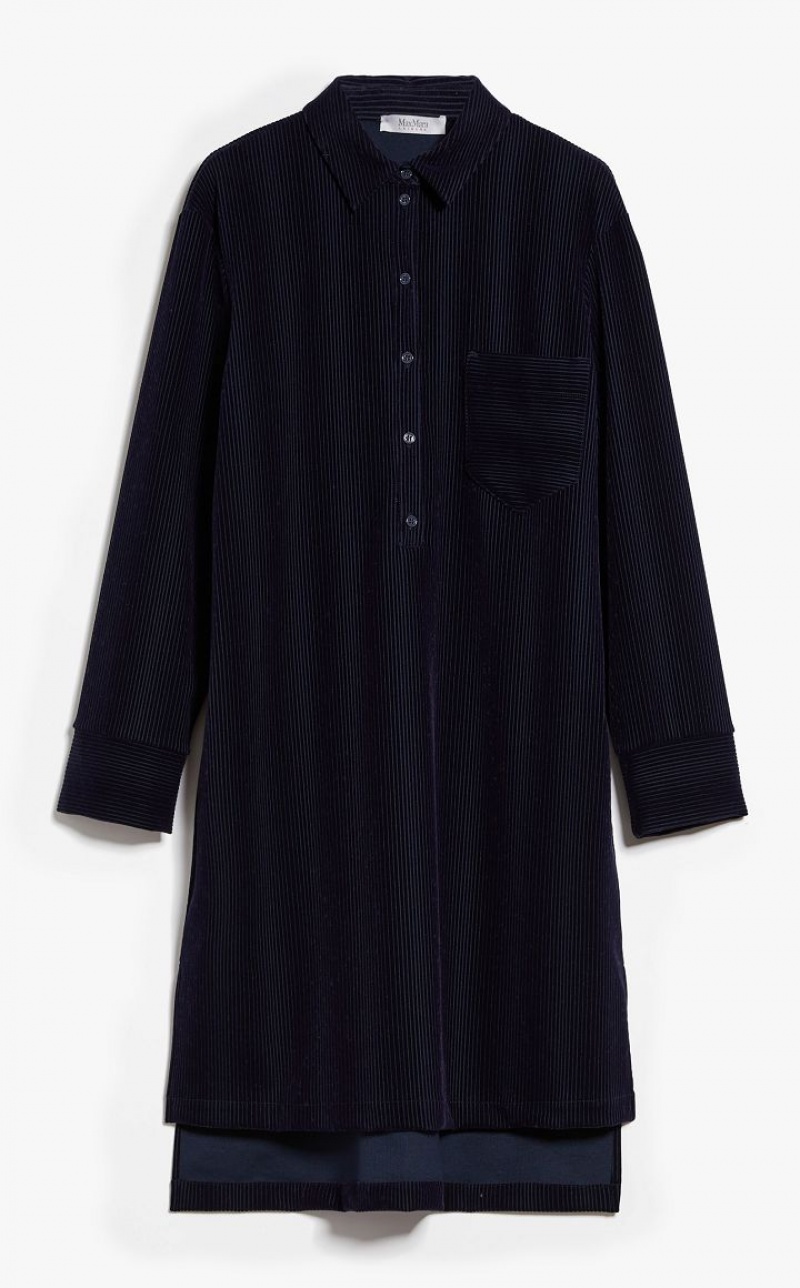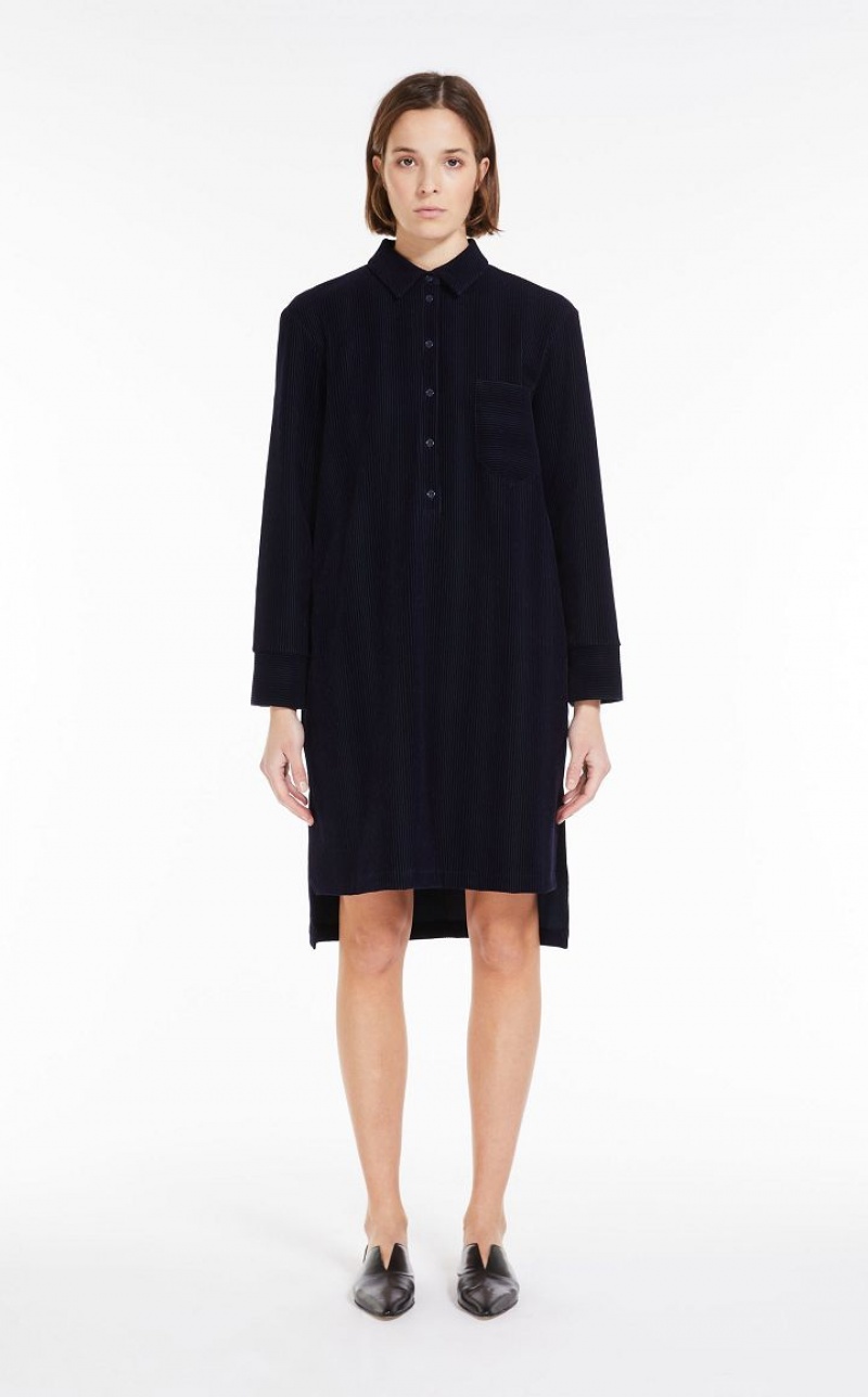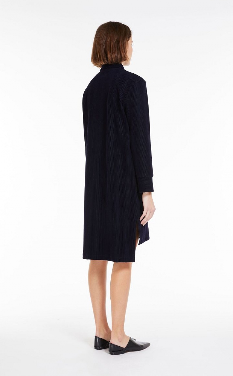 Short shirt dress in flocked Milano-knit with a corduroy effect. Straight fit with side slits, set-in sleeves with cuffs and high pocket on the front. Asymmetrical hem that is longer at the back. Polo fastening with buttons. Length: 104 cm