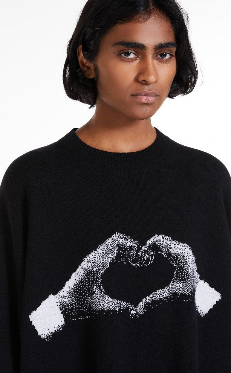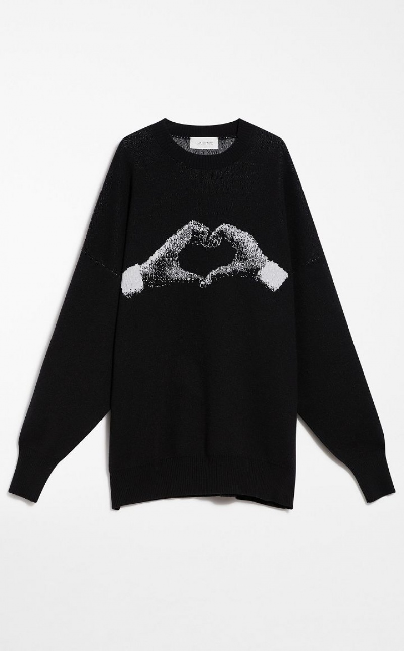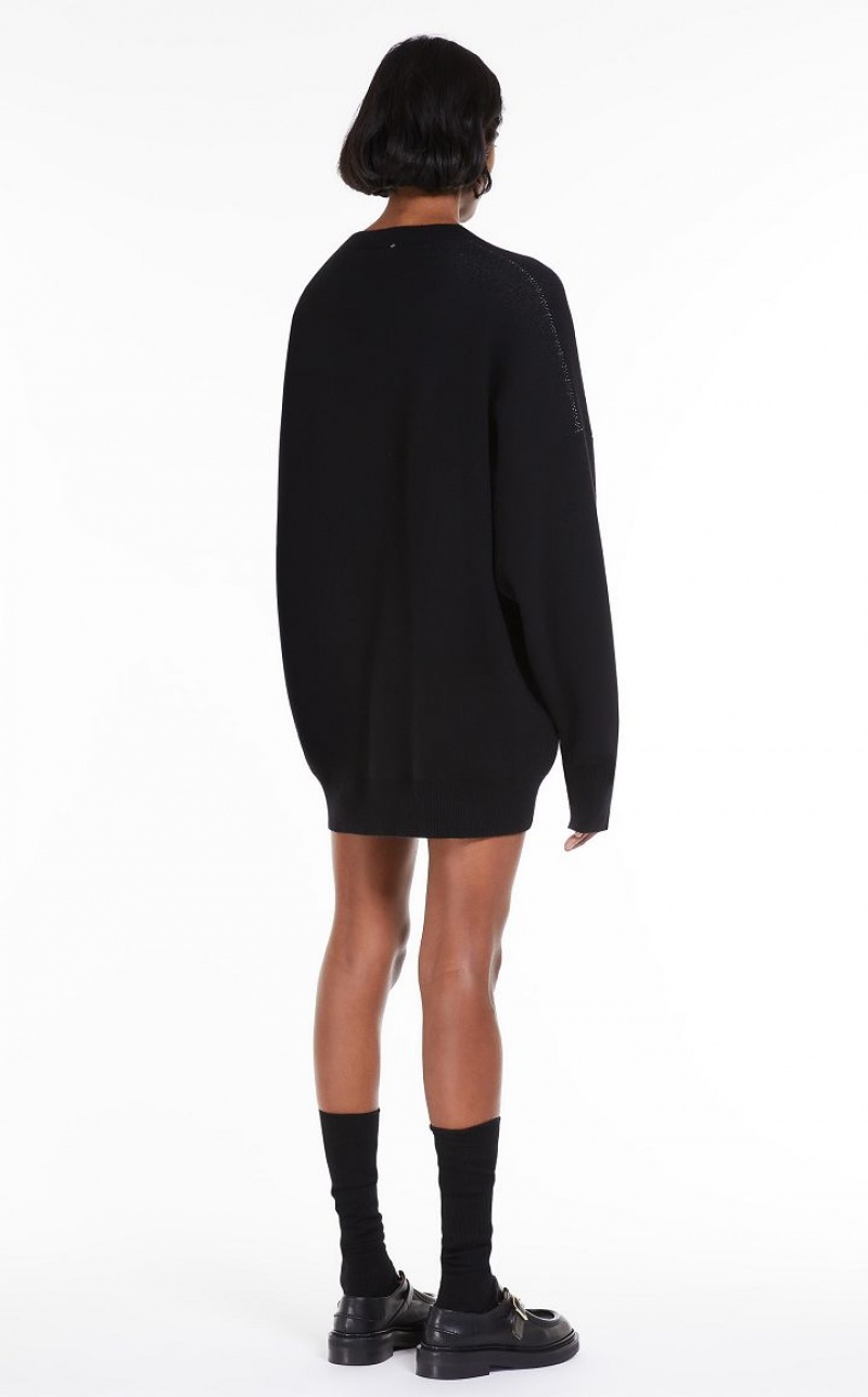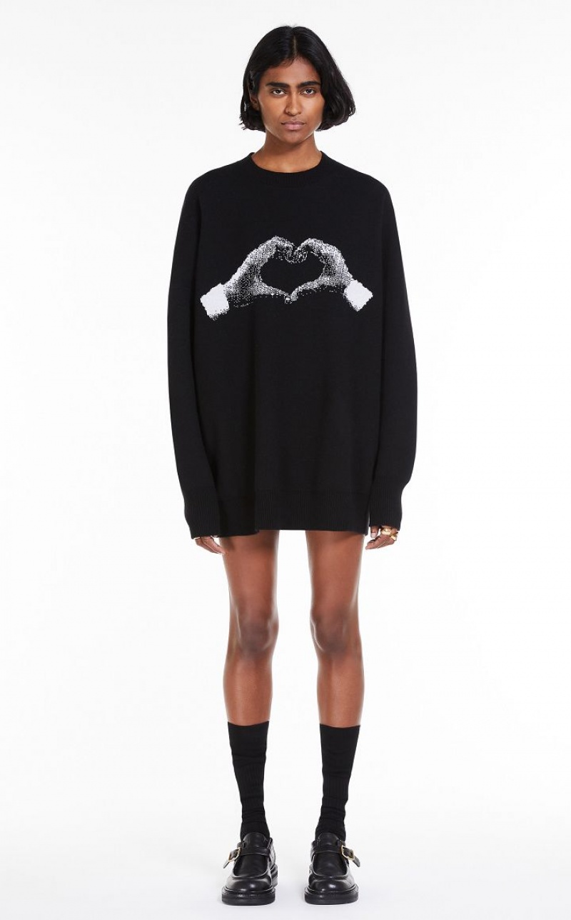Oversized dress in a warm, soft, wool and cashmere knit. Featuring a pixel-effect graphic design on the chest in a contrasting colour. Wide, straight line, with a rib-knit crew neck, cuffs and hem. Hits mid-thigh.