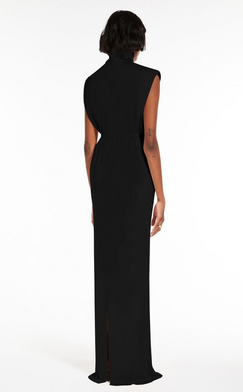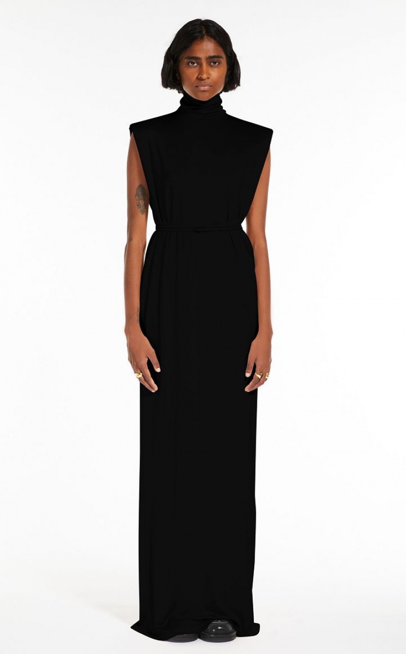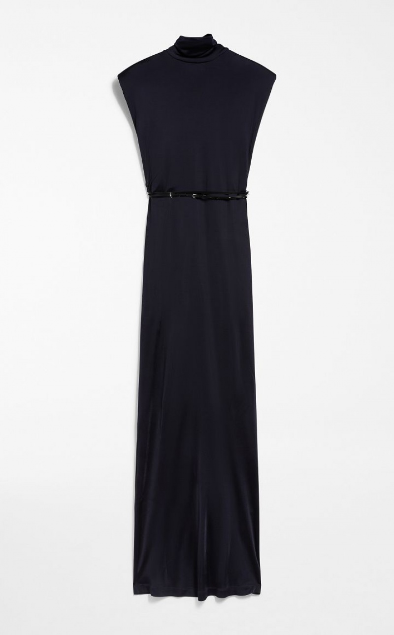 Sleeveless, high-neck dress made of interlock jersey with a shiny finish. Straight cut, with padded shoulder strap, flowing line and soft volume. Slim double-wrap belt to cinch in at the waist. Pockets inserted along the sides and deep slit on the back.