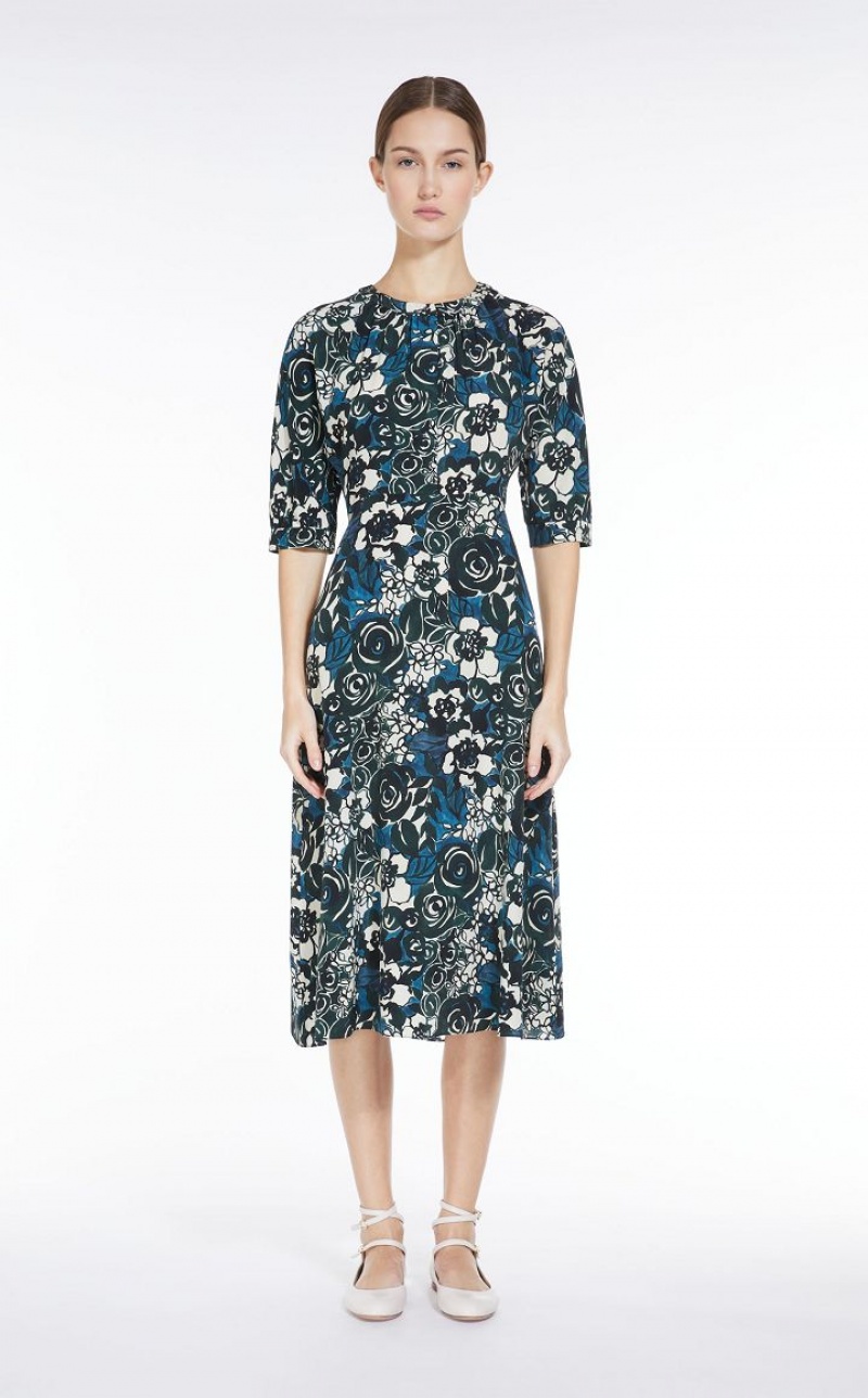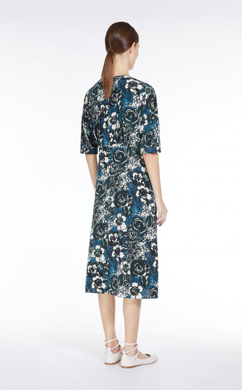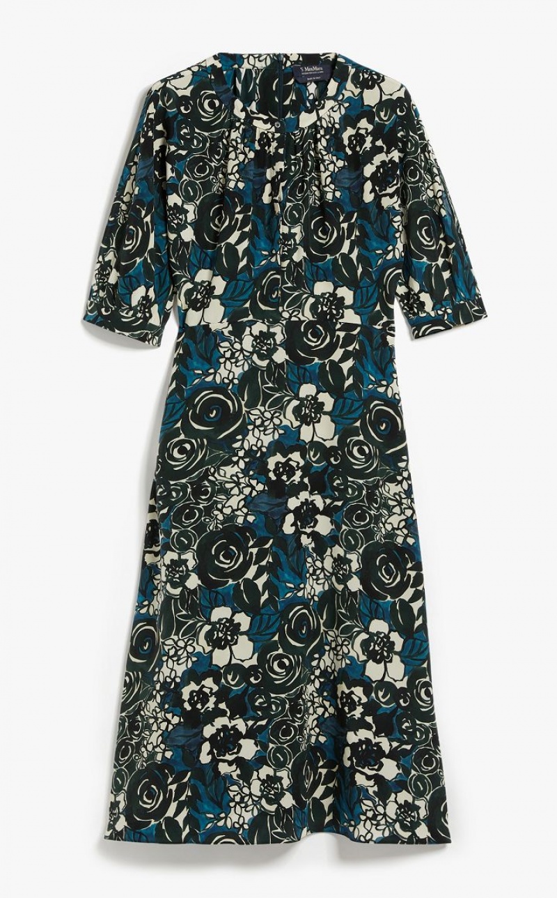 Crew-neck dress in fine printed pure silk crepe de chine fabric featuring short balloon sleeves and a lightly gathered neckline. Waist-up front fastening. Length: 116 cm.