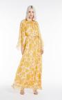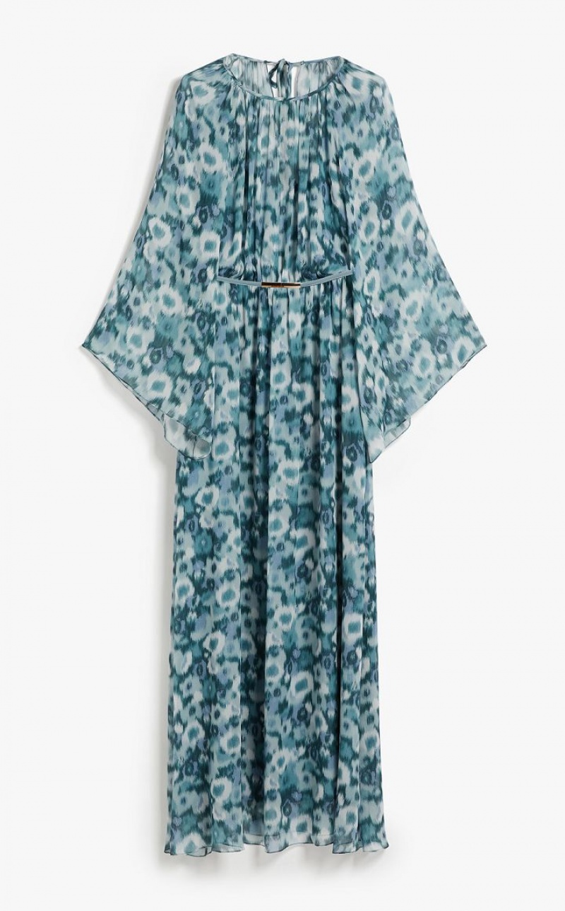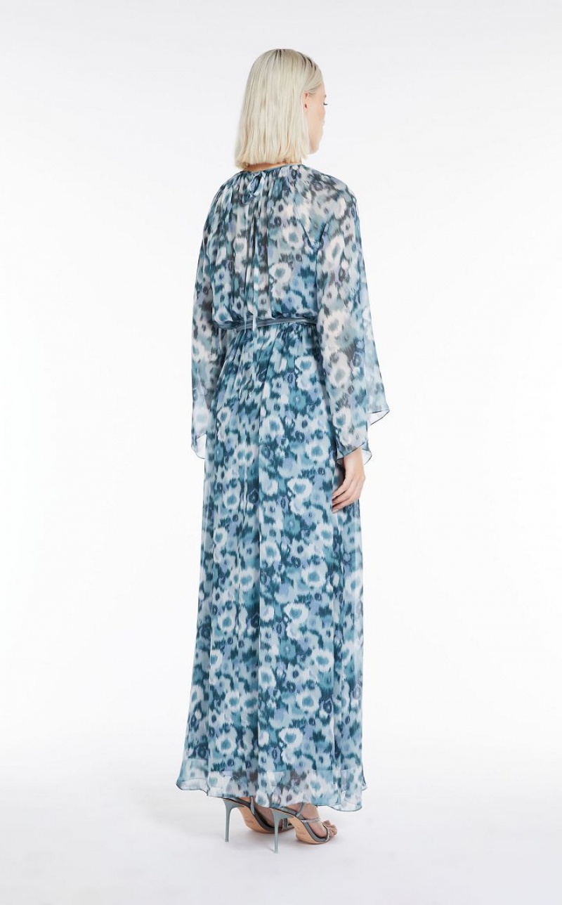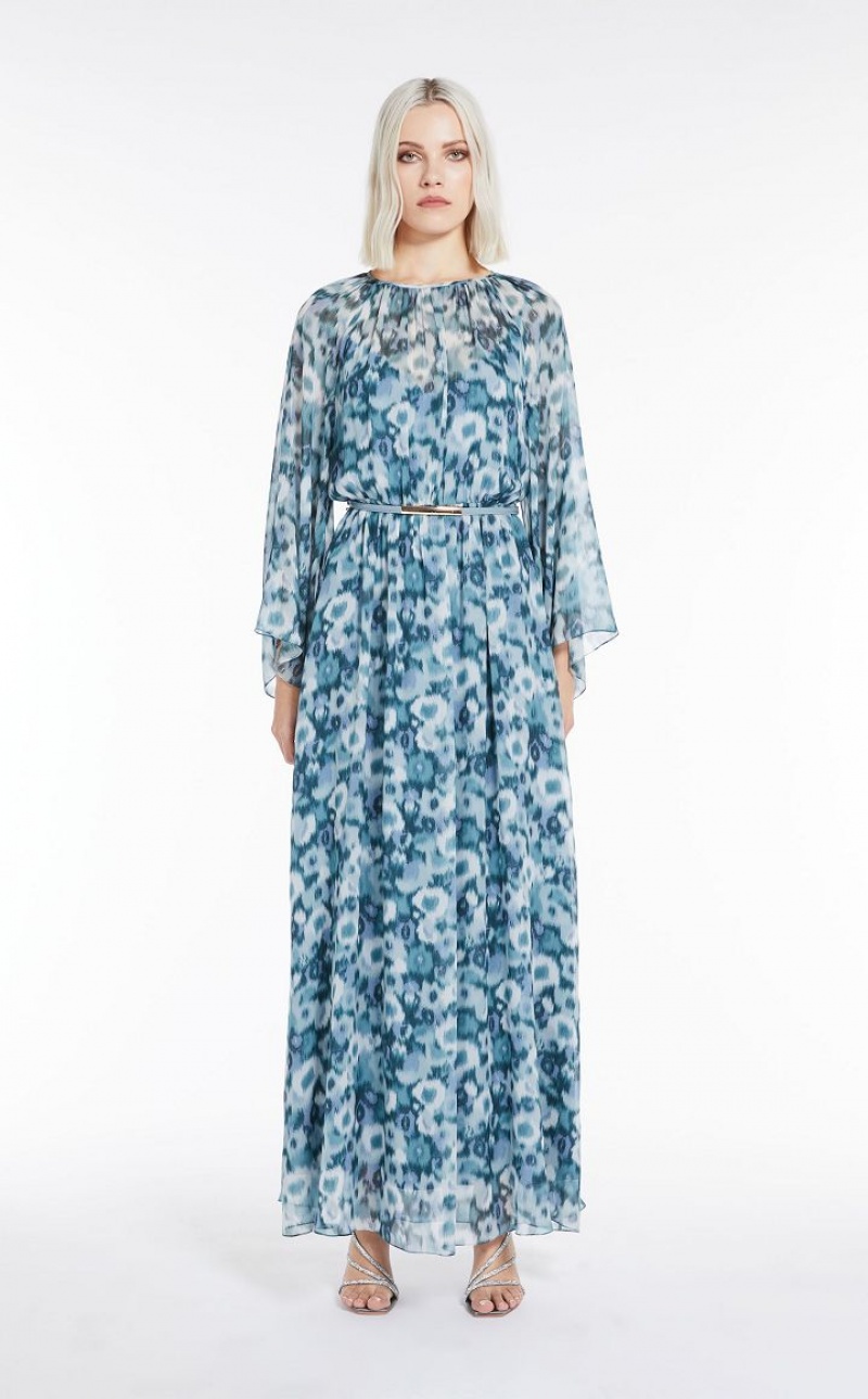 Long dress in fine printed pure silk georgette fabric featuring long bell sleeves, in addition to deep keyhole detail at the back. Feminine silhouette-accentuating matching belt and waist dart. Lined model. Length: 150 cm.