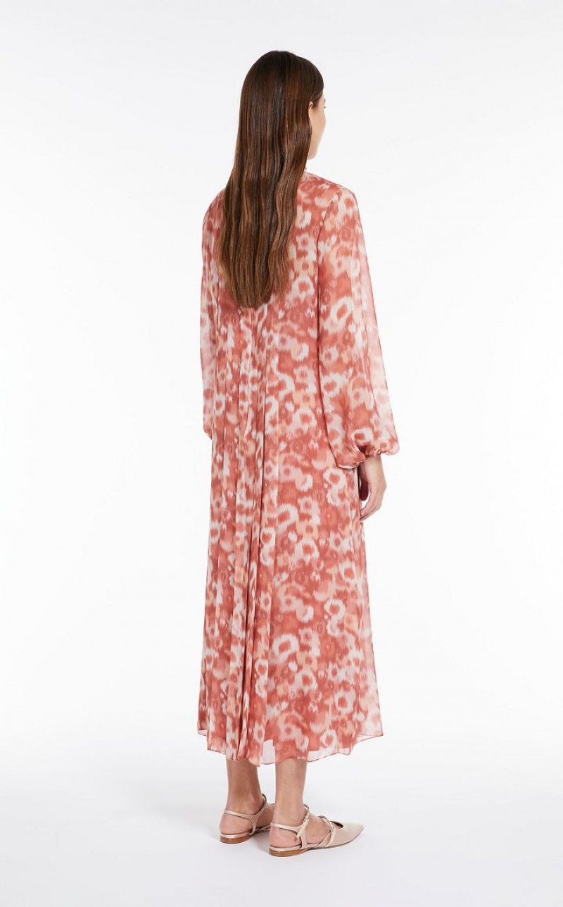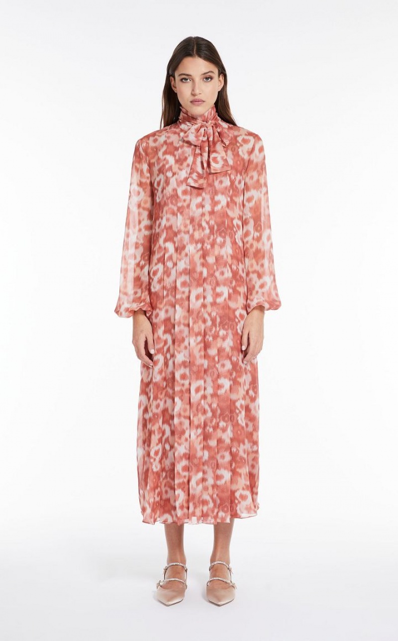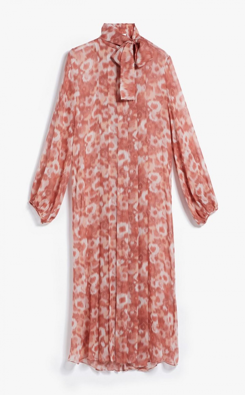 Long dress in fine printed pure silk georgette fabric featuring elegant central shirt-front detail, complete with waist-secured pleated detail on both the front and back. The fluid-fit model boasts a pussy bow-embellished crew neckline, in addition to long balloon sleeves. Matching slip. Length: 130 cm.