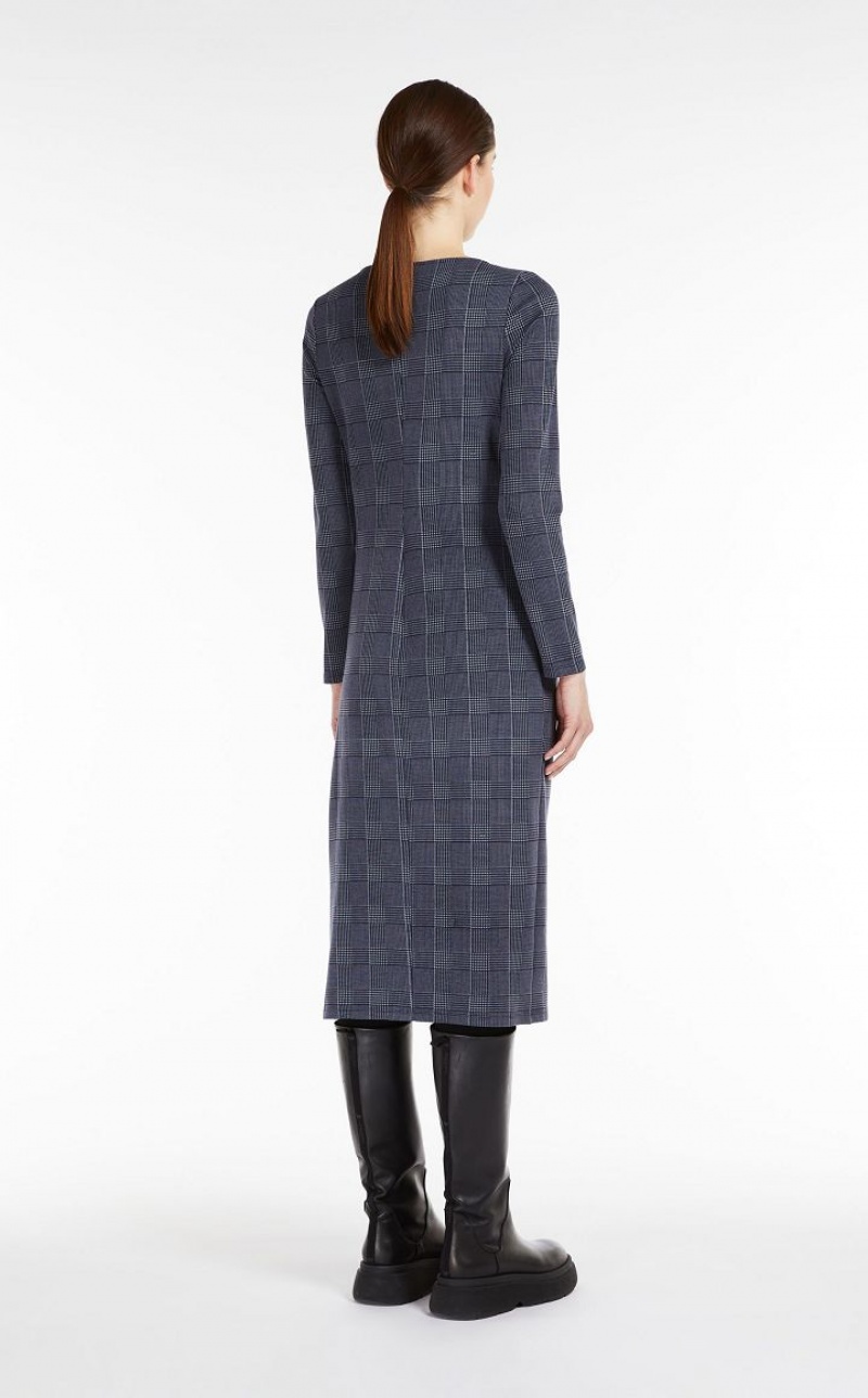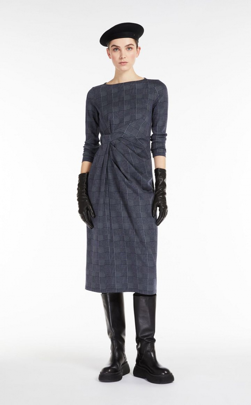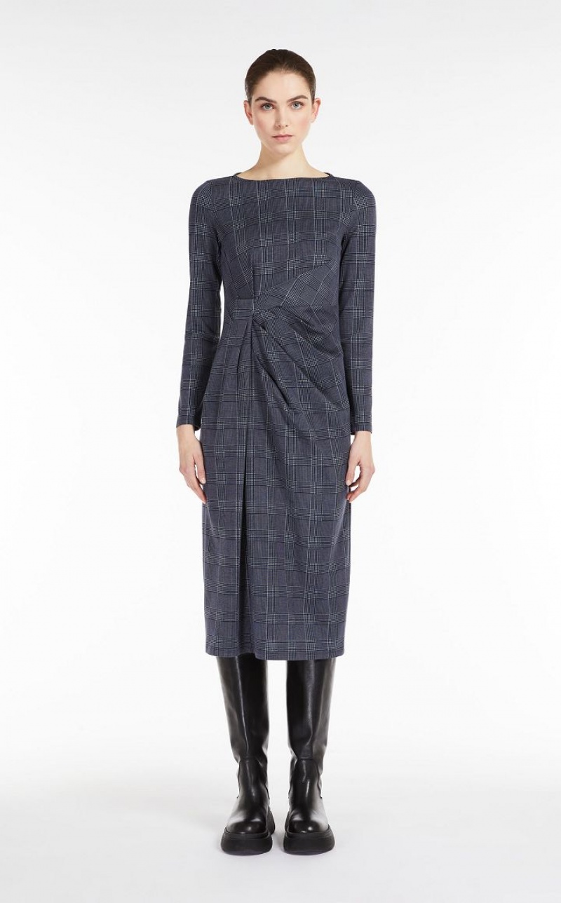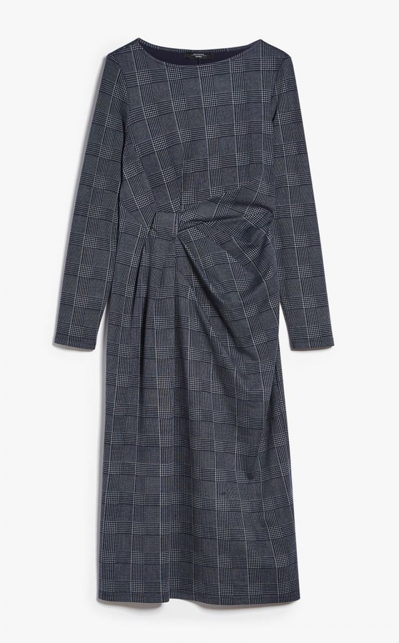 Long sleeved funnel boat neck sheath dress in printed interlock jersey fabric. Movement bestowing knot detail on one side. Length: 116 cm.