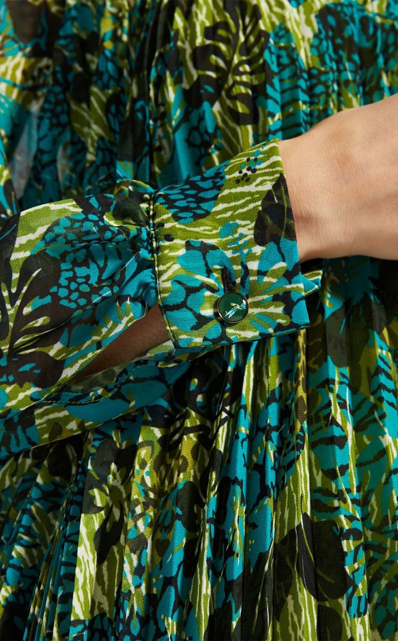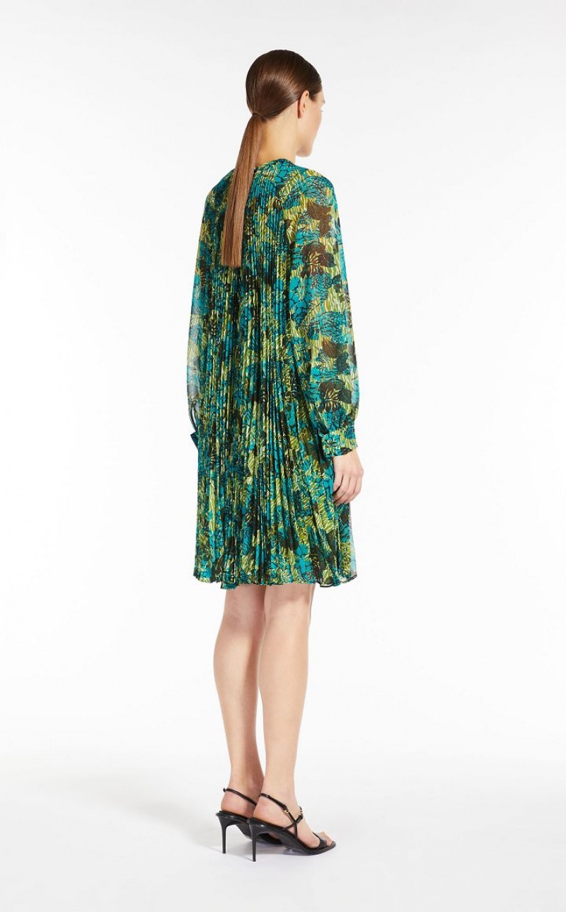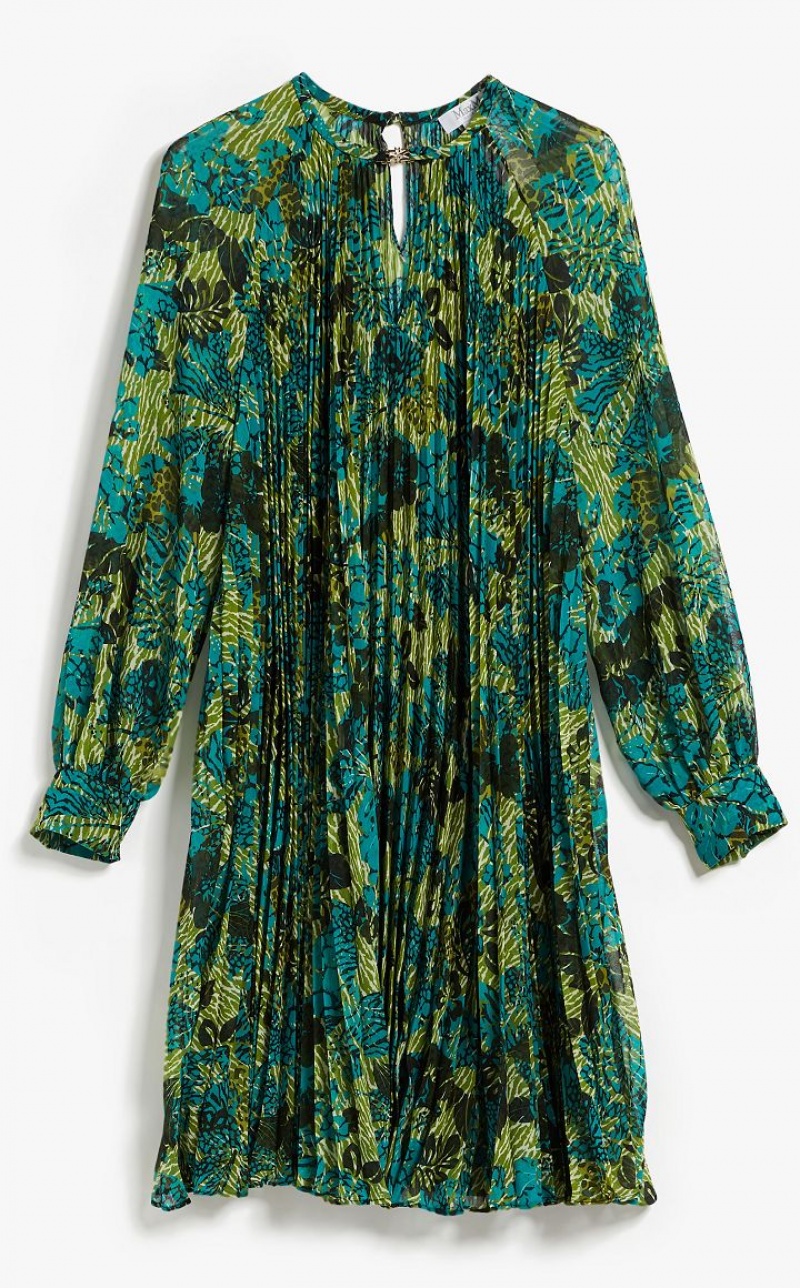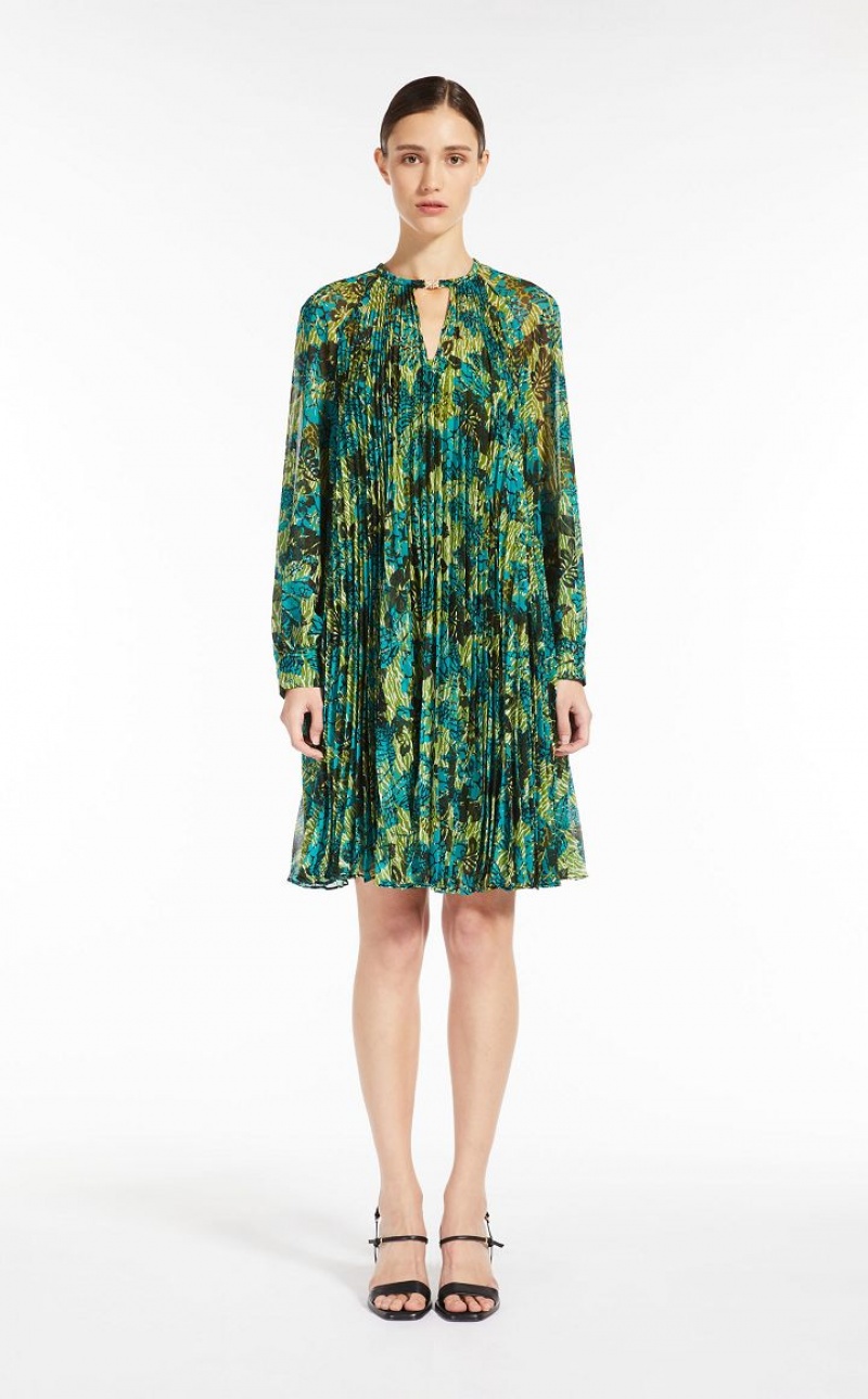 Short dress with a flared silhouette made of a playful printed georgette, featuring a pleated motif on the front and back. The style features wide raglan sleeves with shirt cuffs, a round neckline with cut-out V detail and matching slip with thin shoulder straps. Length: 95 cm.