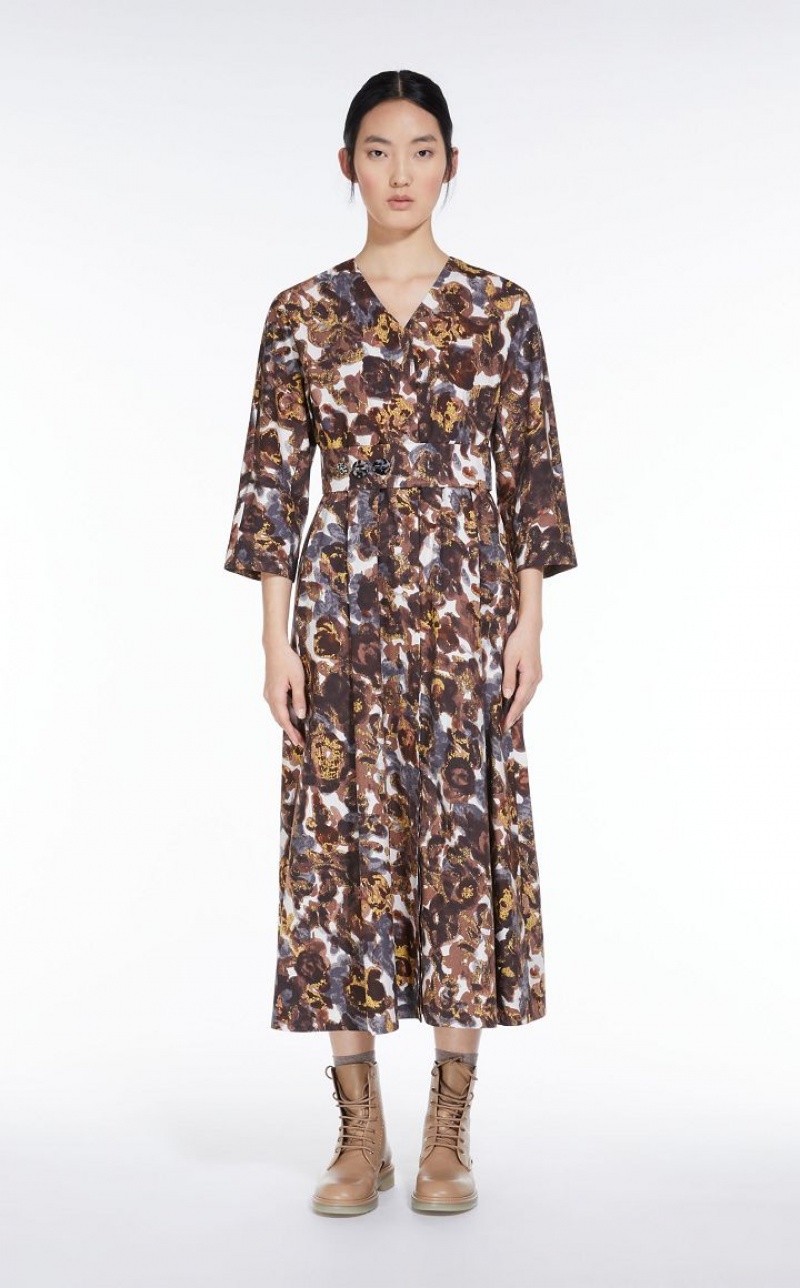 Long flared dress in printed pure cotton poplin fabric featuring a pleated skirt, V-neckline and kimono sleeves. Waistline-accentuating matching embroidered belt. Front zip. Length: 124 cm.
