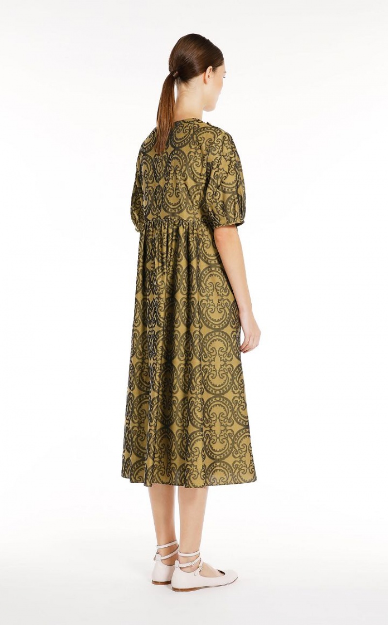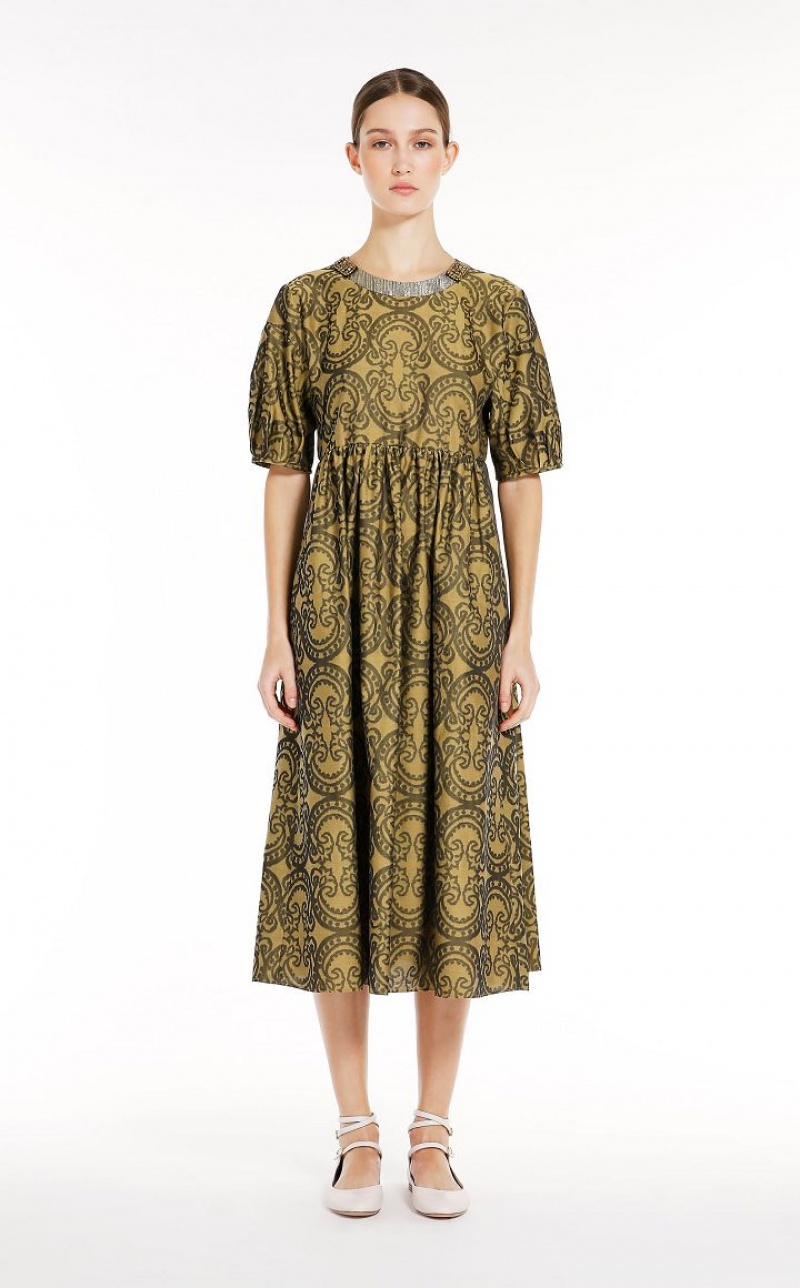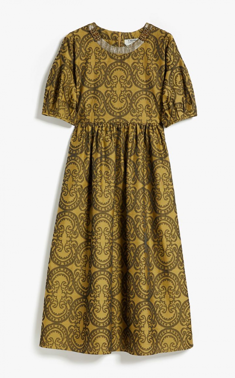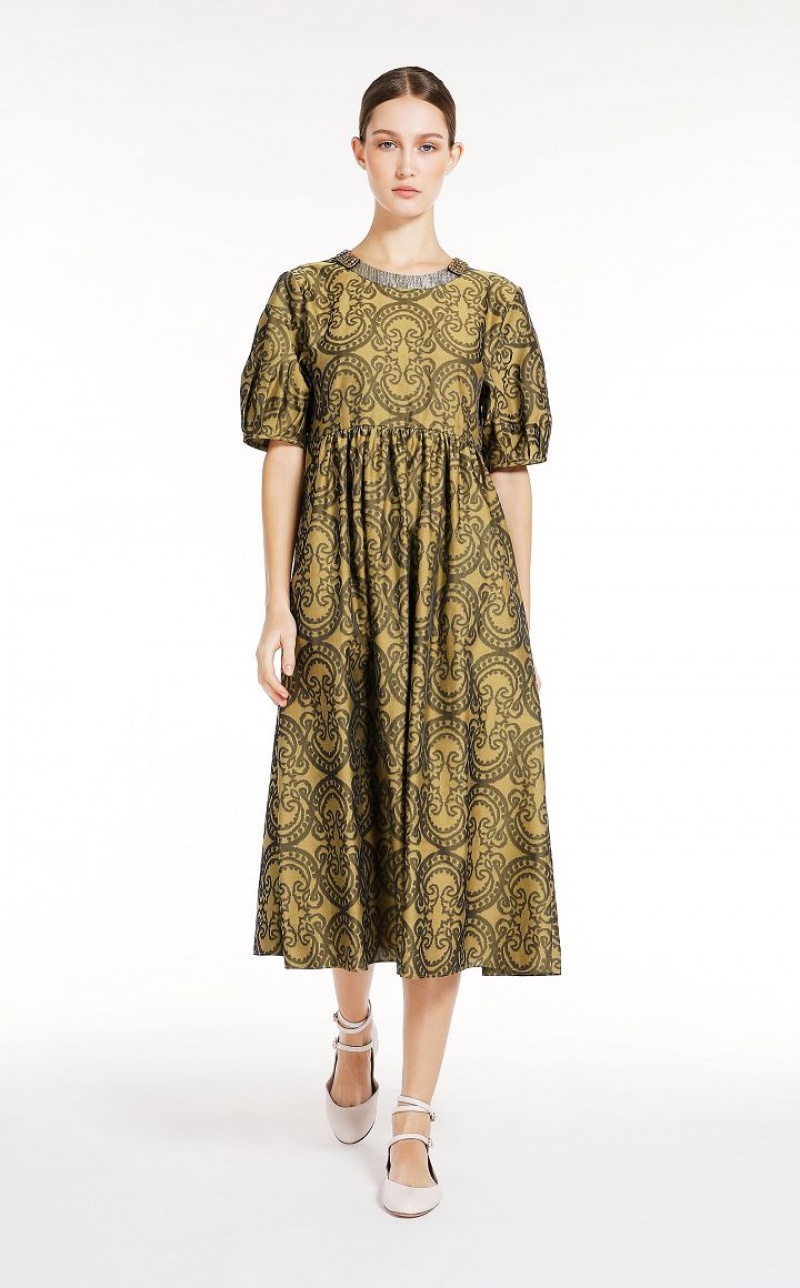 Long dress in fine jacquard fabric featuring short balloon sleeves and a flared skirt. The lurex jacquard crew neckline is embellished with removable embroidery appliqués. Length: 121 cm.