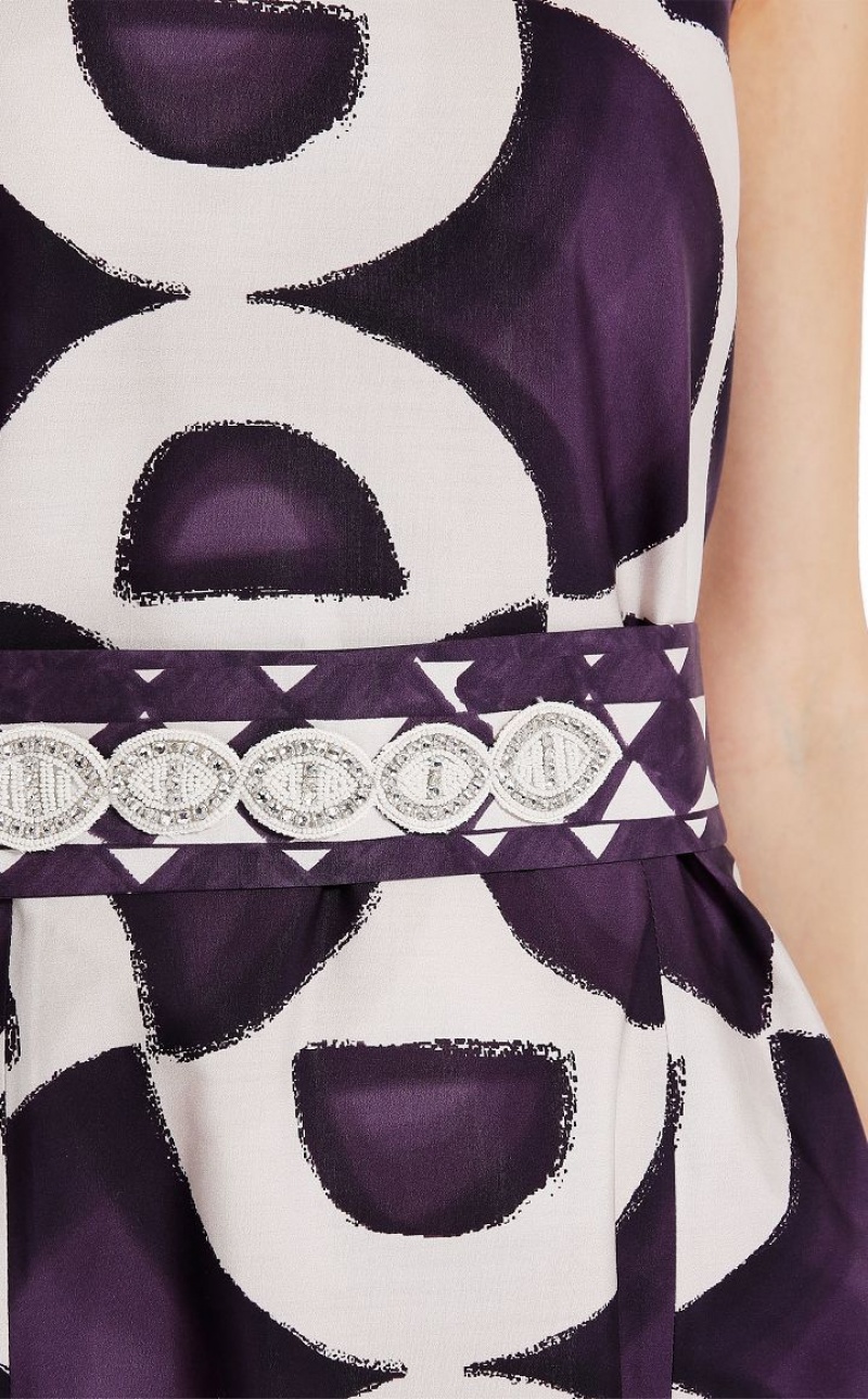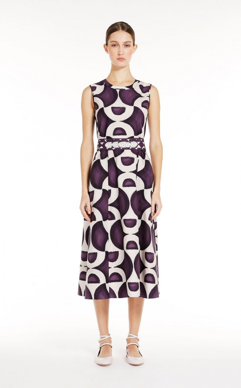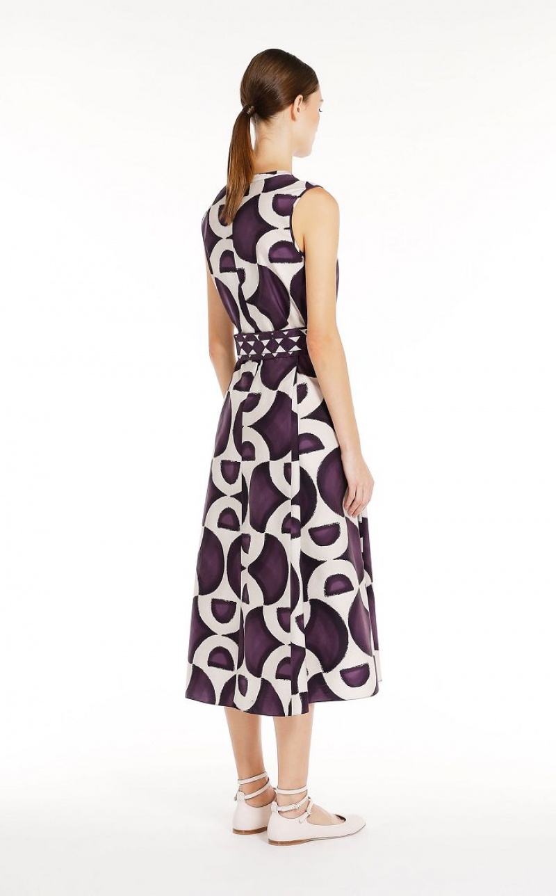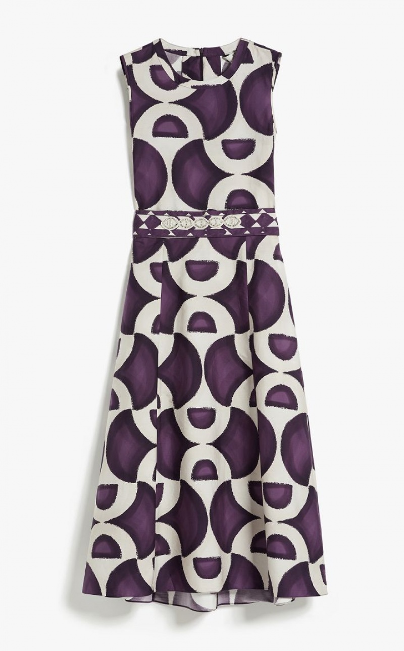 Long sleeveless dress in pure cotton poplin fabric featuring an exclusive-patterned placed print, designed specifically for the model in question. The flared model boasts a full pleated skirt, press-stud fastening and a matching belt, complete with removable embroidered detail in the centre. Length: 124 cm.