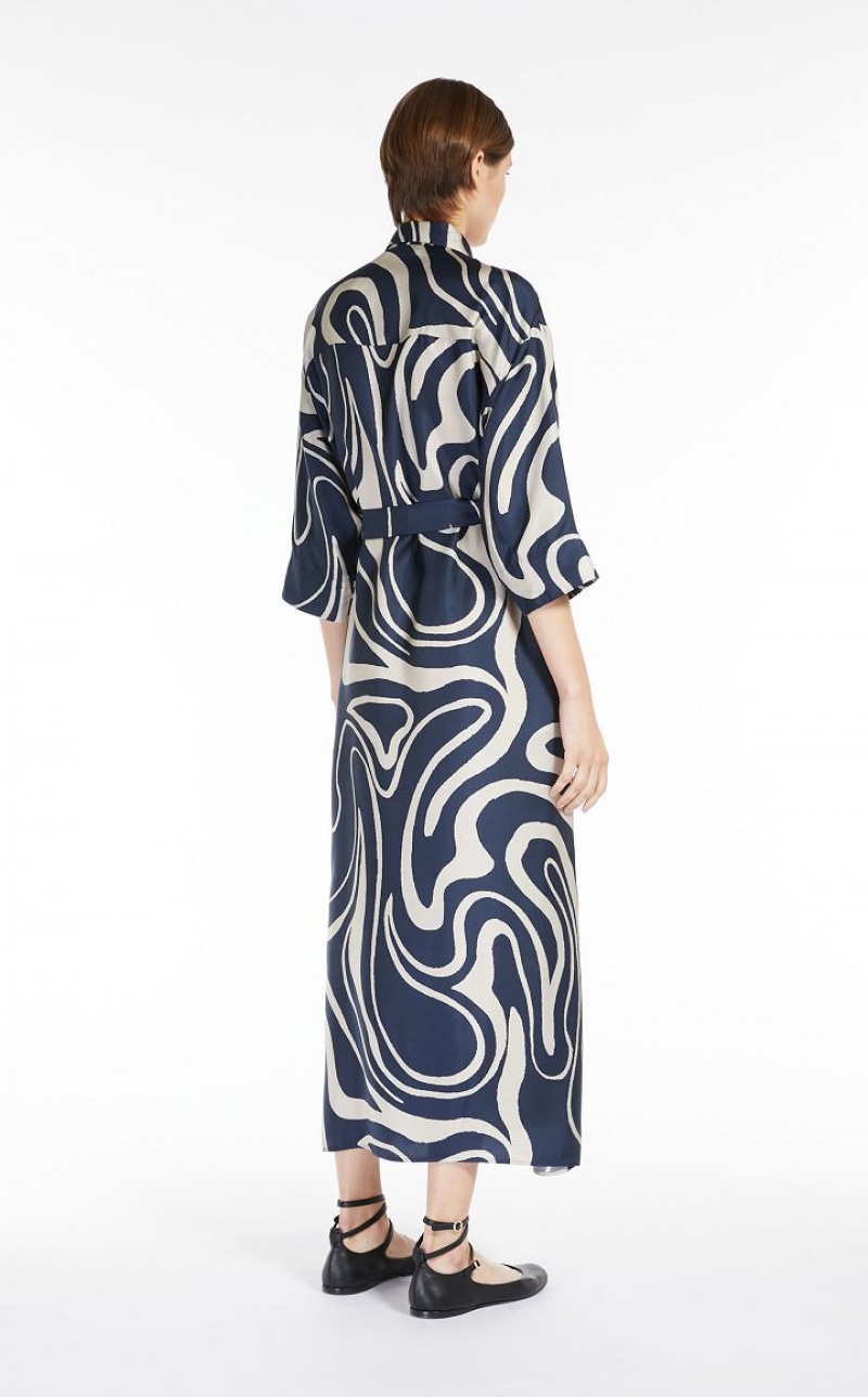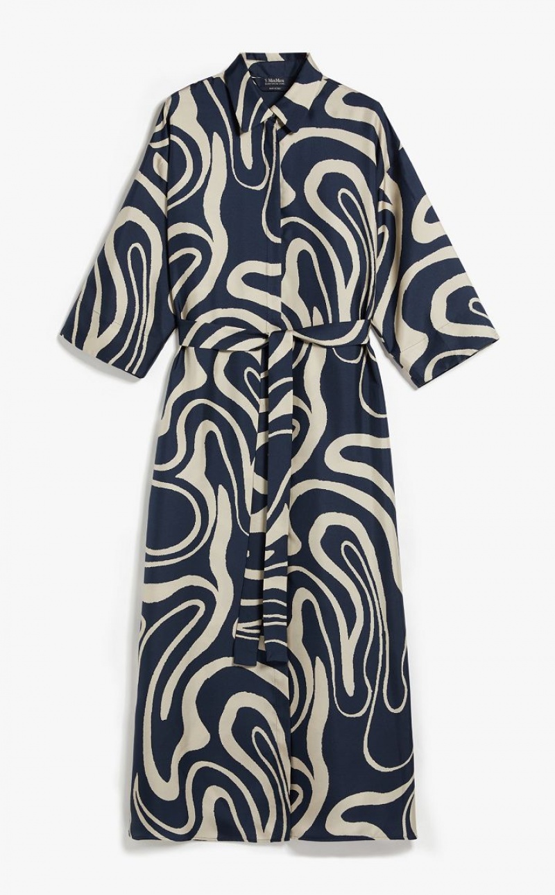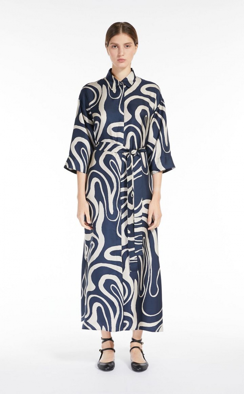 Long shirt dress in fine printed pure silk twill fabric featuring a pointed collar and long sleeves. The model boasts side slit detail, in addition to a silhouette-accentuating matching belt. Length: 132 cm.