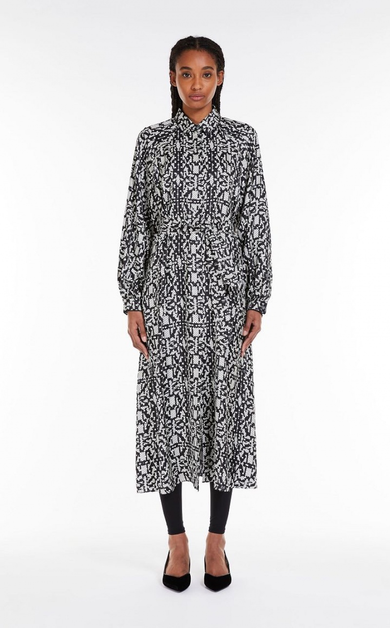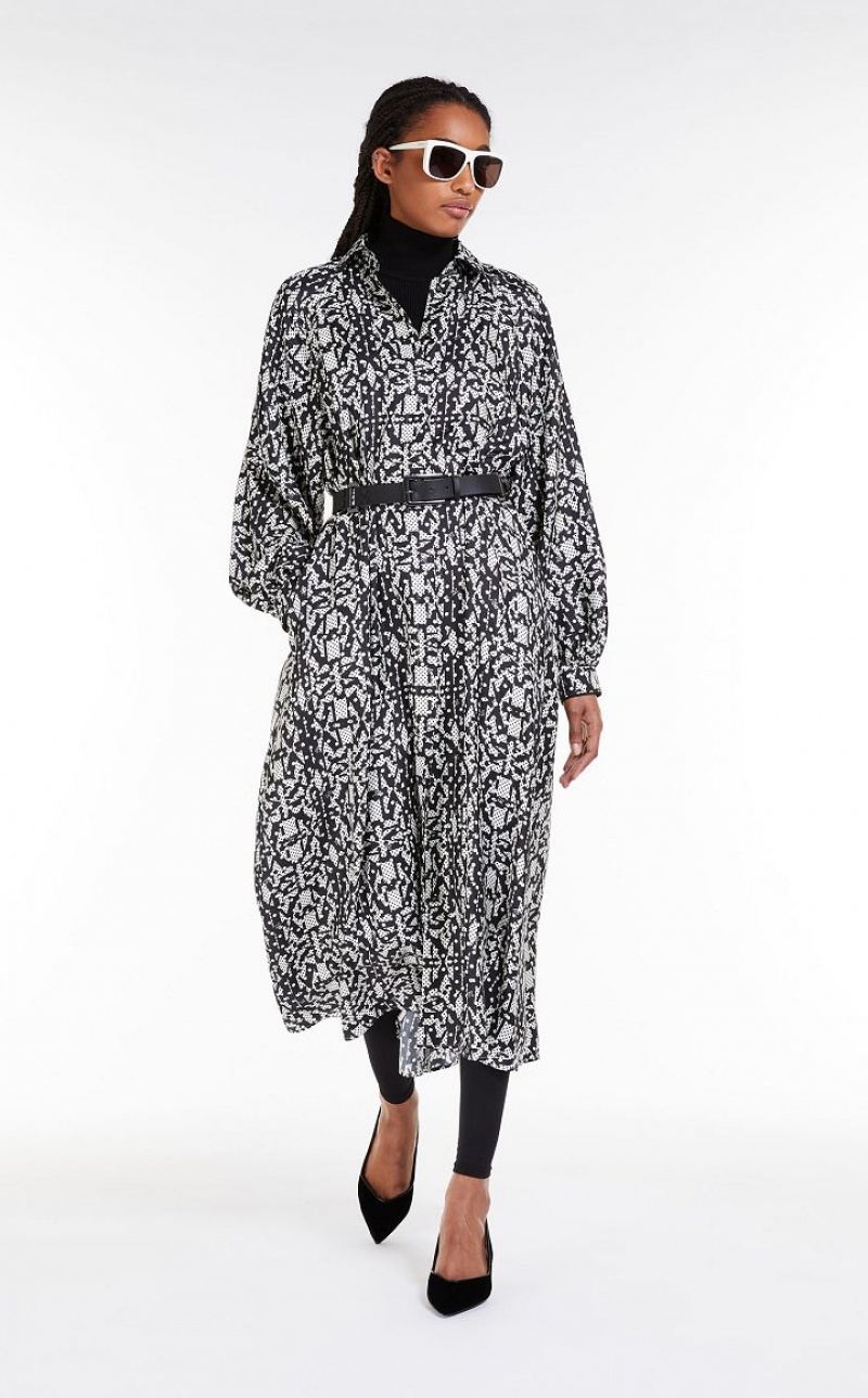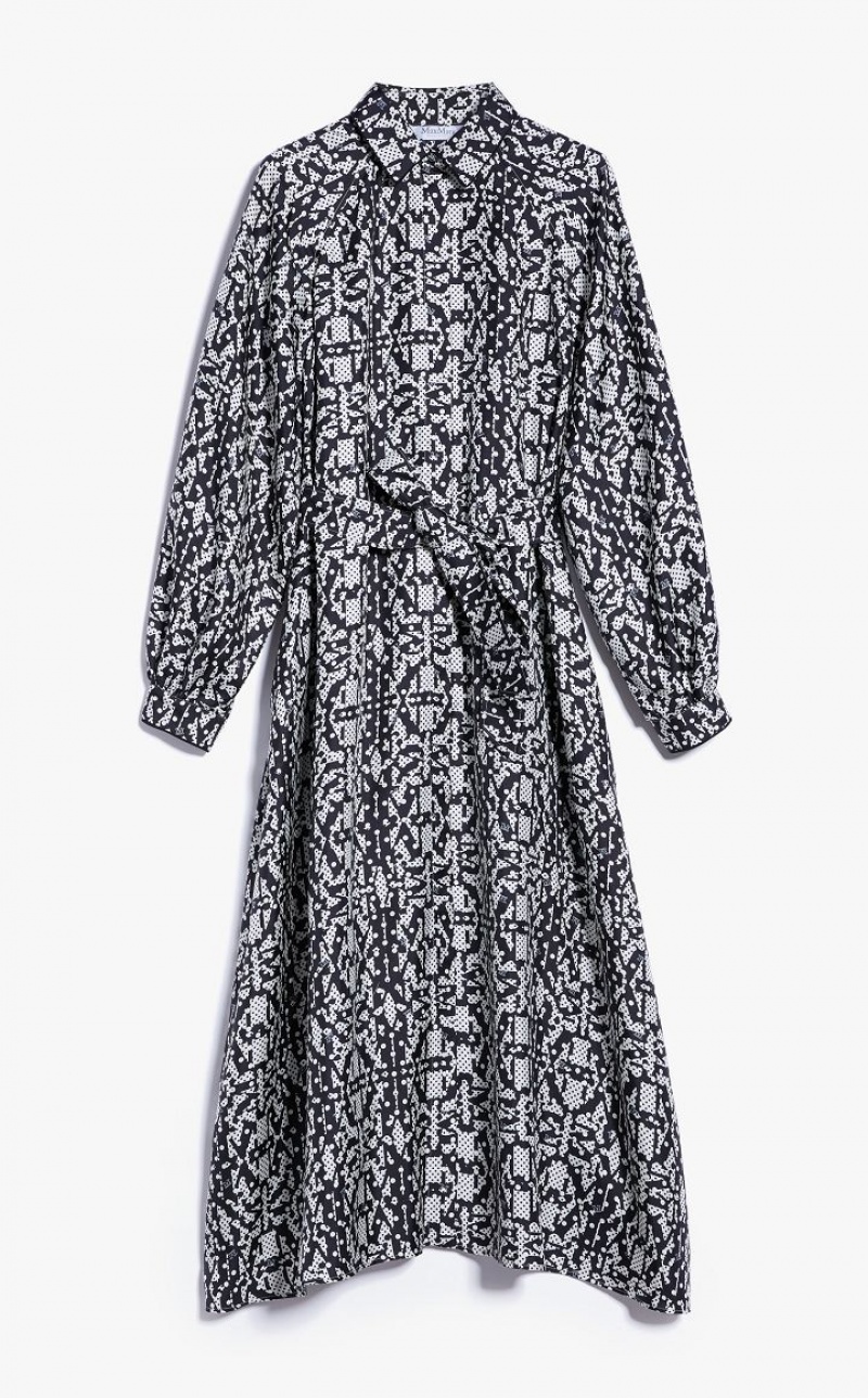 Long shirt dress made of fine printed pure silk twill. Unlined style with a flowing, feminine silhouette, shirt collar, wide balloon sleeves with cuffs closed by a monogram button, and side pockets. The matching belt allows you to accentuate the waist. Embellished with contrasting piping on the collar and cuffs. Concealed button fastening at the front. Length: 125 cm