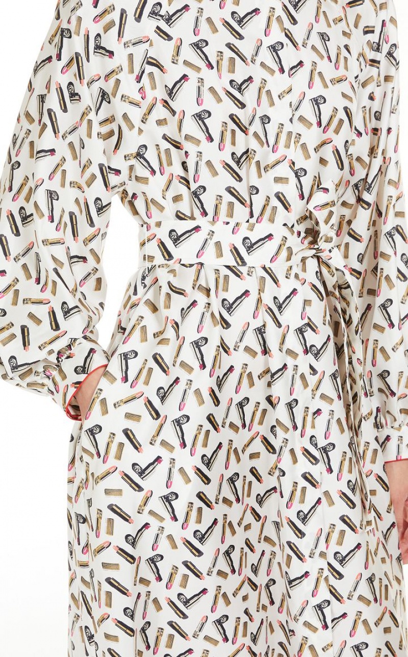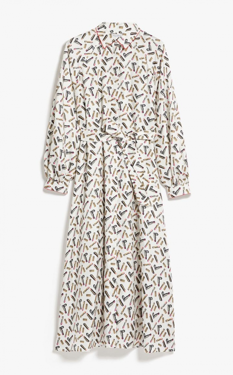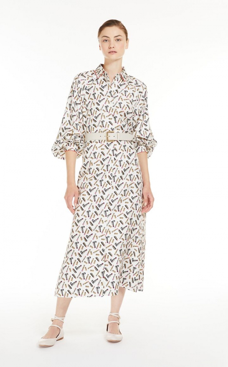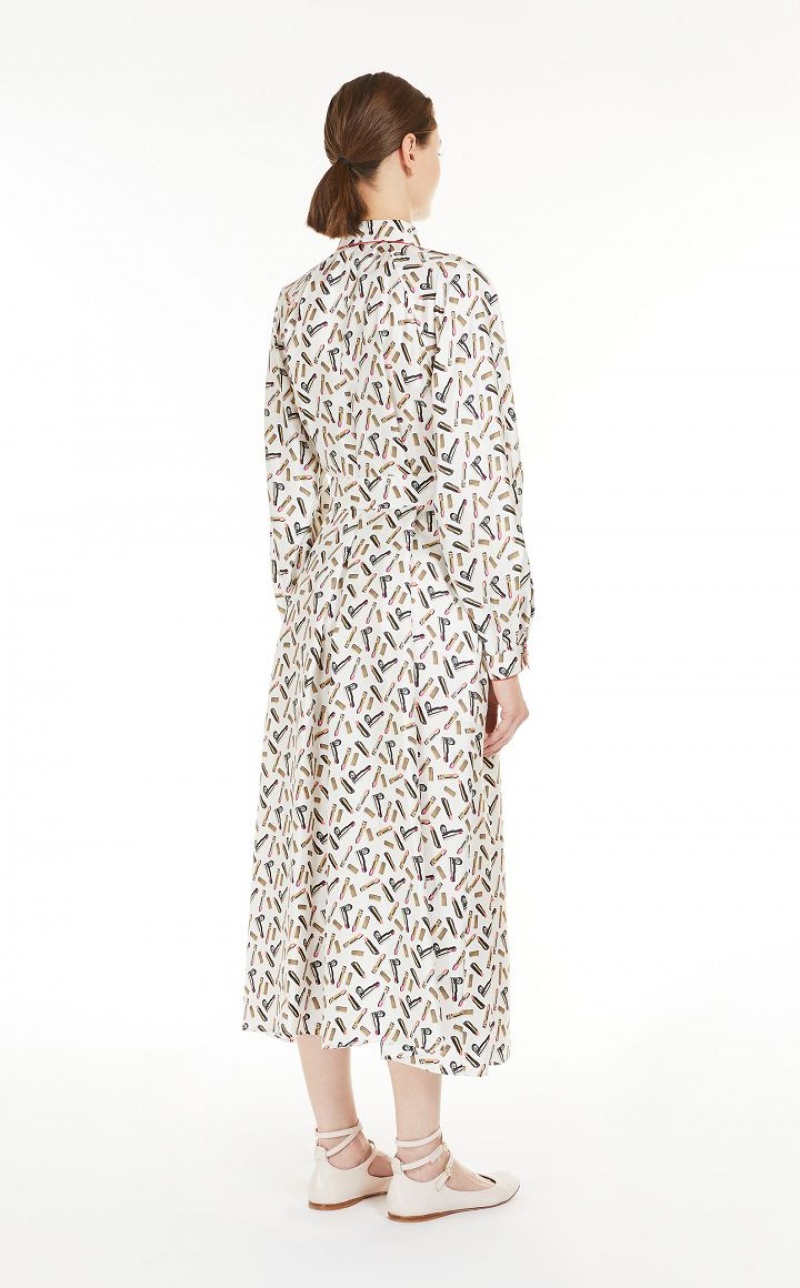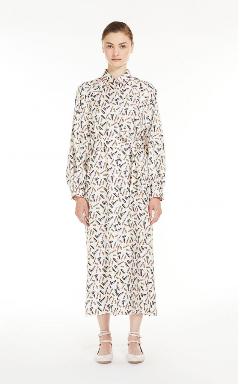 Long shirt dress in exquisite pure silk twill with all-over print, featuring a feminine silhouette with a flared skirt, wide raglan sleeves with cuffs, and a shirt collar. Unlined model, finished with piping details and matching belt to tie at the waist. Concealed front fastening. Length: 125 cm.