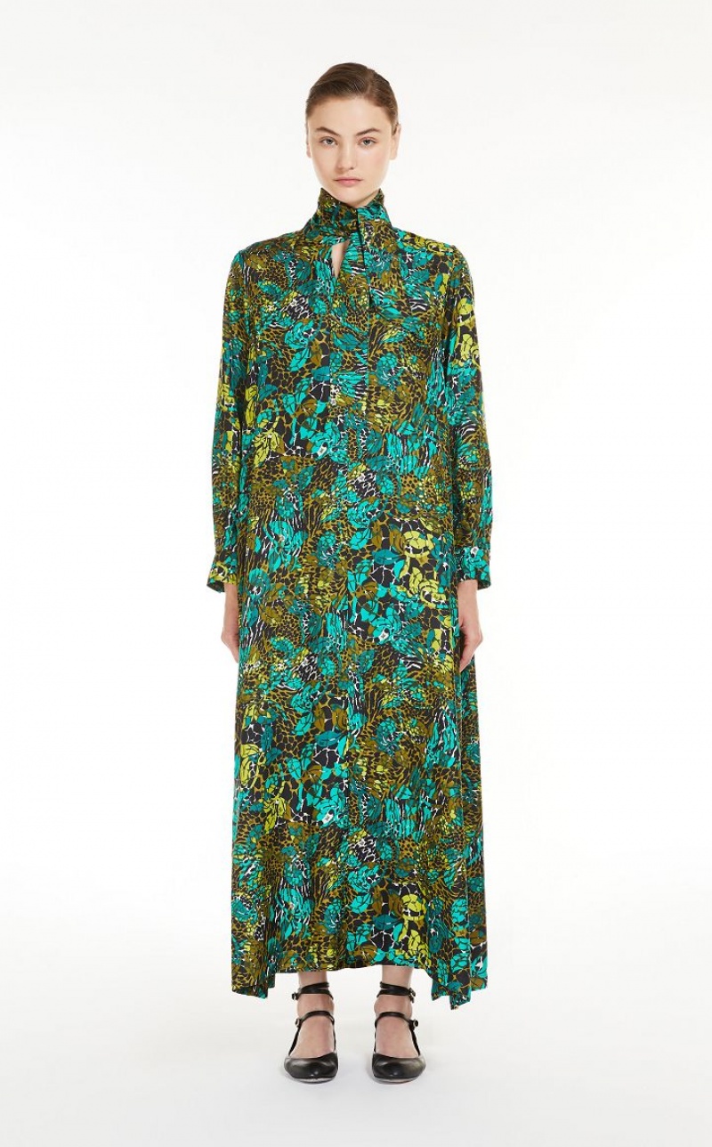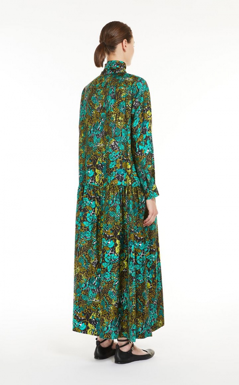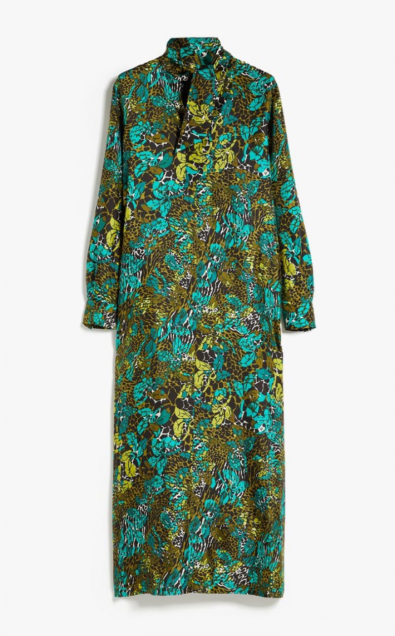 Long shirt dress in fine pure silk twill with all-over printed motif, embellished with a foulard collar open on the front and long sleeves with shirt cuffs. The straight volume with horizontal cut on the back allows you to obtain proportions that can be adapted to different silhouettes. Unlined style finished with lateral vents and customised rounded-button fastening. Length: 135 cm.