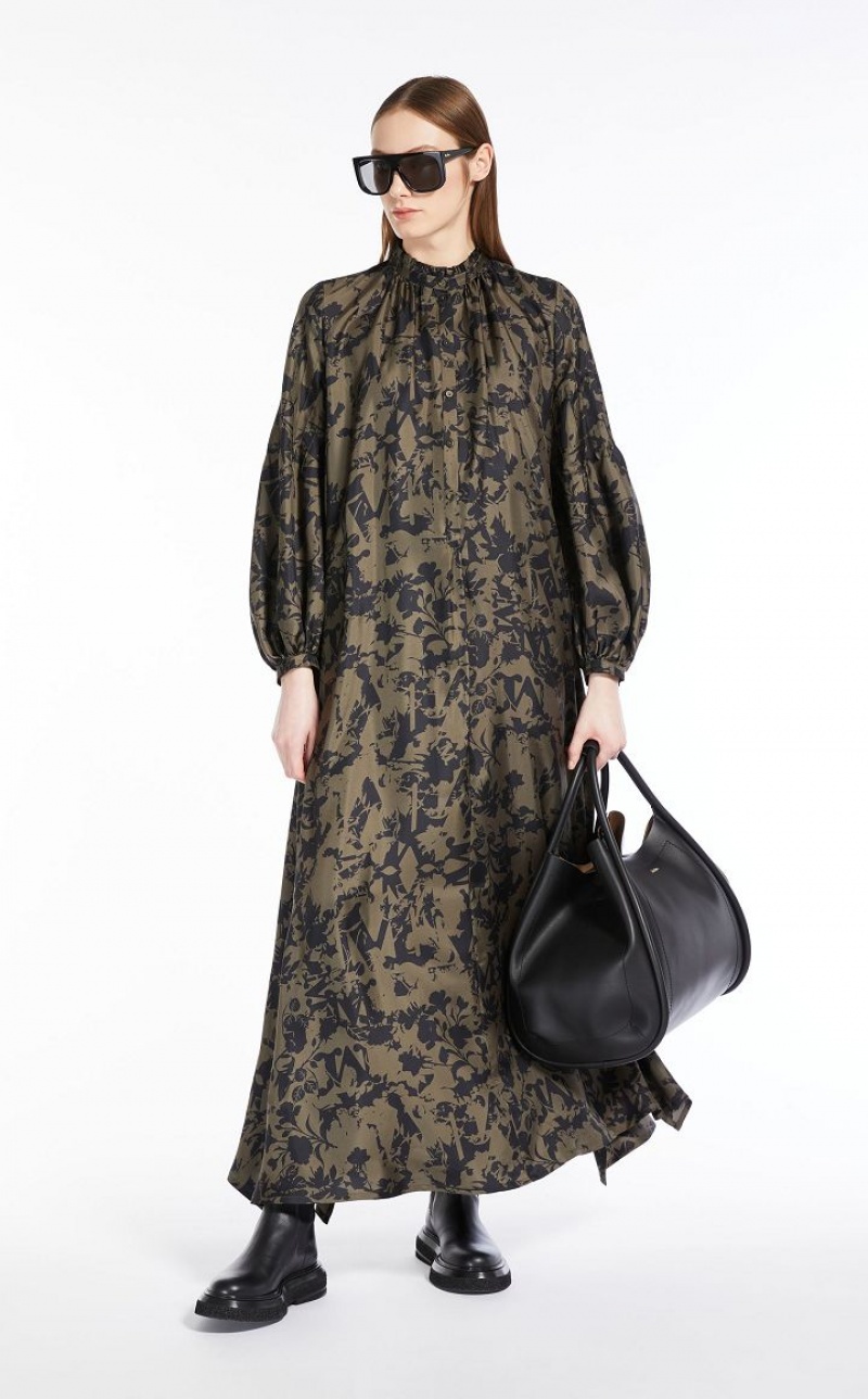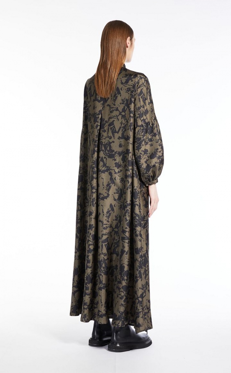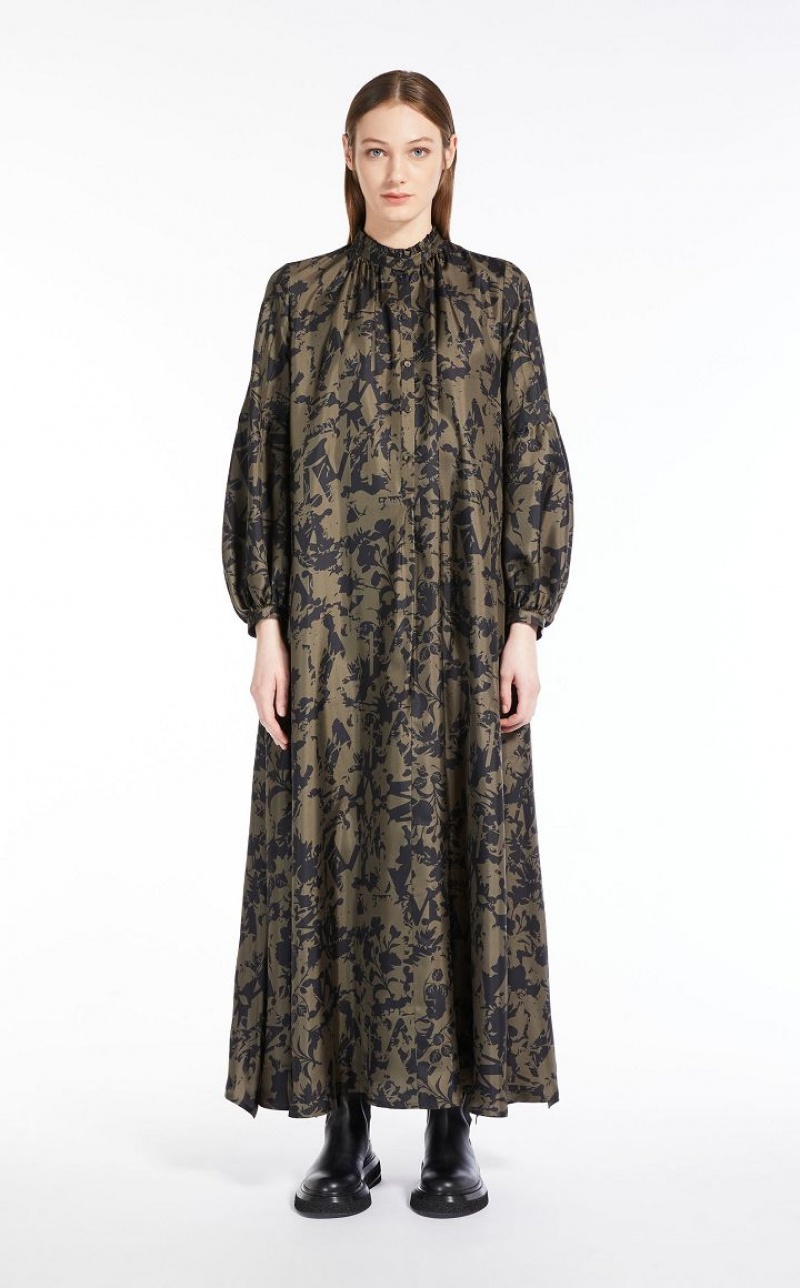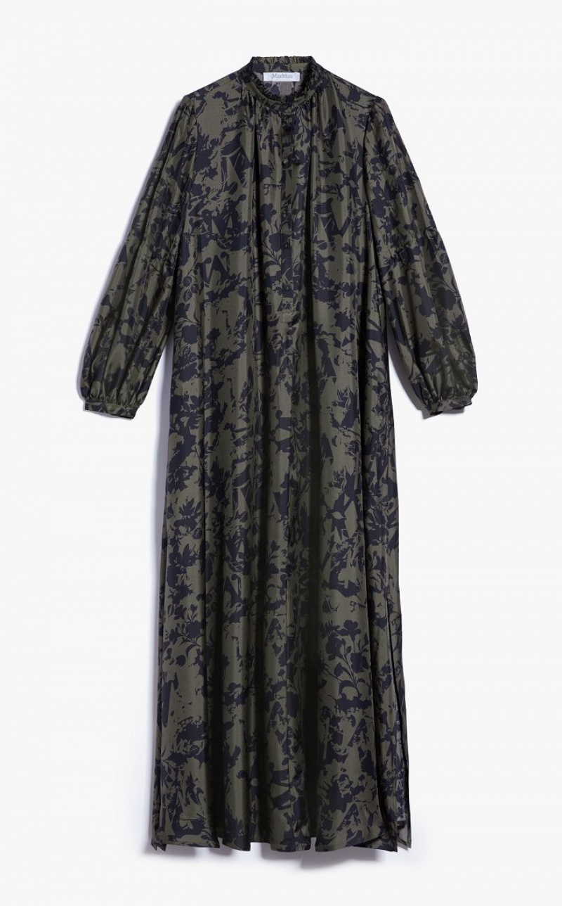 Full volume long dress made of exquisite pure printed silk twill. Flowing silhouette featuring a mandarin collar with gathered motif and small ruches on the edge, wide raglan sleeves with cuffs and jewel button. Unlined style finished with deep, rounded side slits on the hem and reverse pleat on the back. Concealed button fastening at the front. Length: 135 cm.