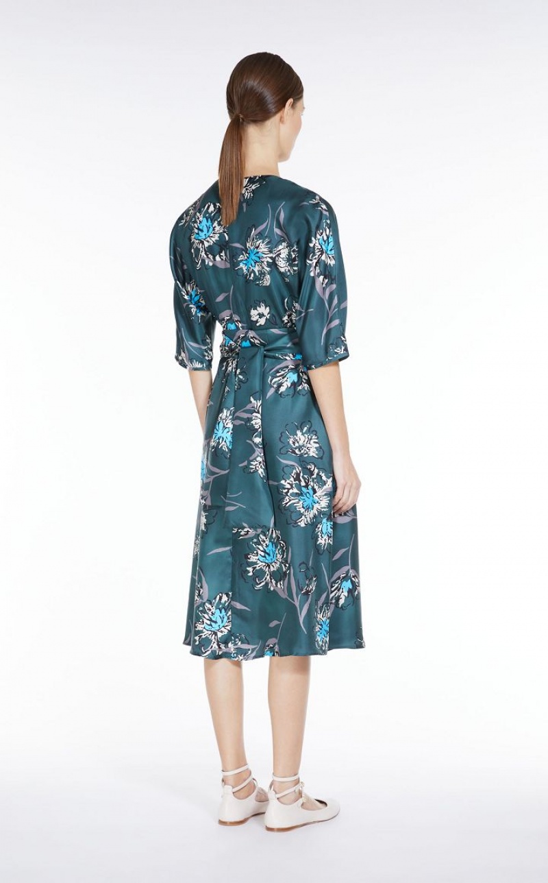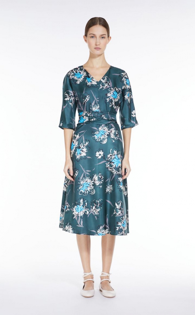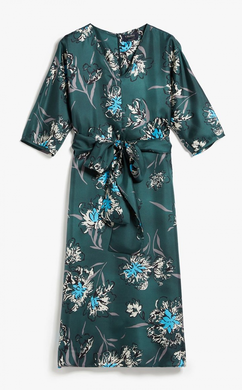 Long dress in fine printed pure silk twill fabric featuring a V-neckline and short kimono sleeves. The silhouette is defined by the delicate bias-cut skirt and waistline-accentuating matching sash. Length: 116 cm.