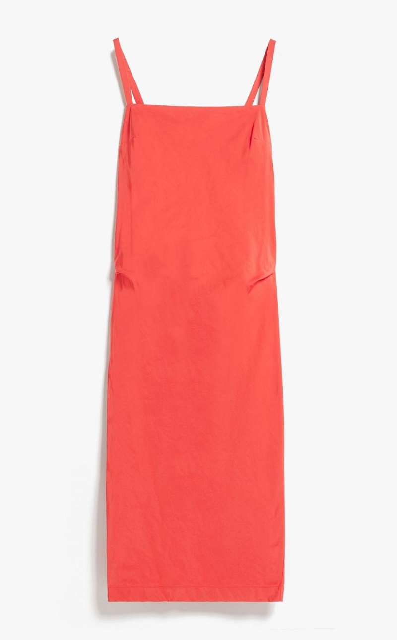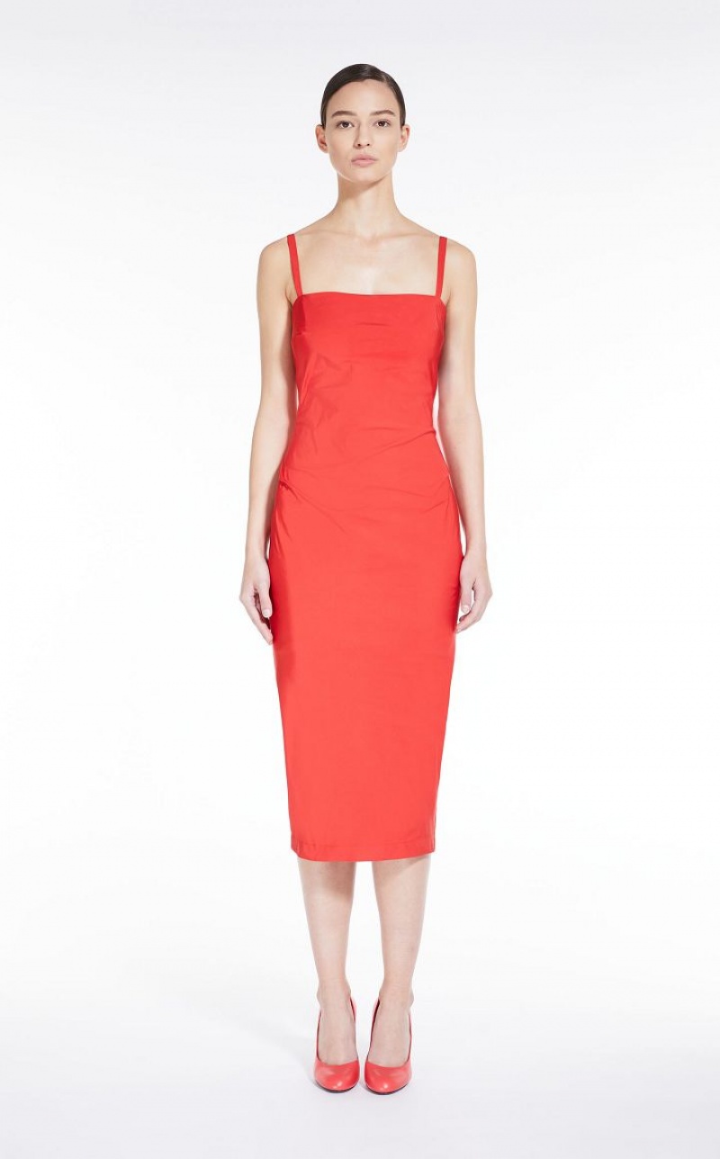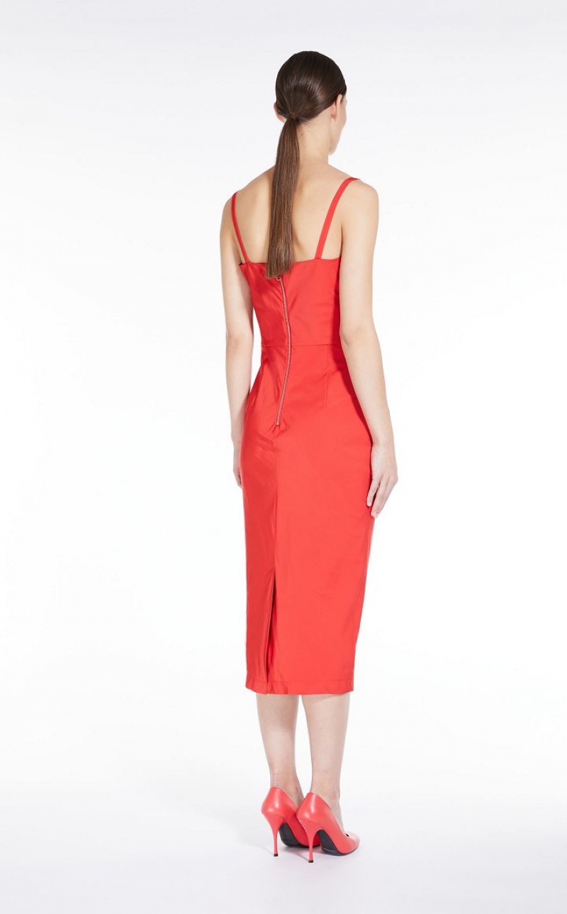 Midi dress made of radzimir with an ultra-feminine silhouette, bustier neckline, thin shoulder straps and central slit on the back. Lined style, closes with metal zip on the back. Length: 120 cm.